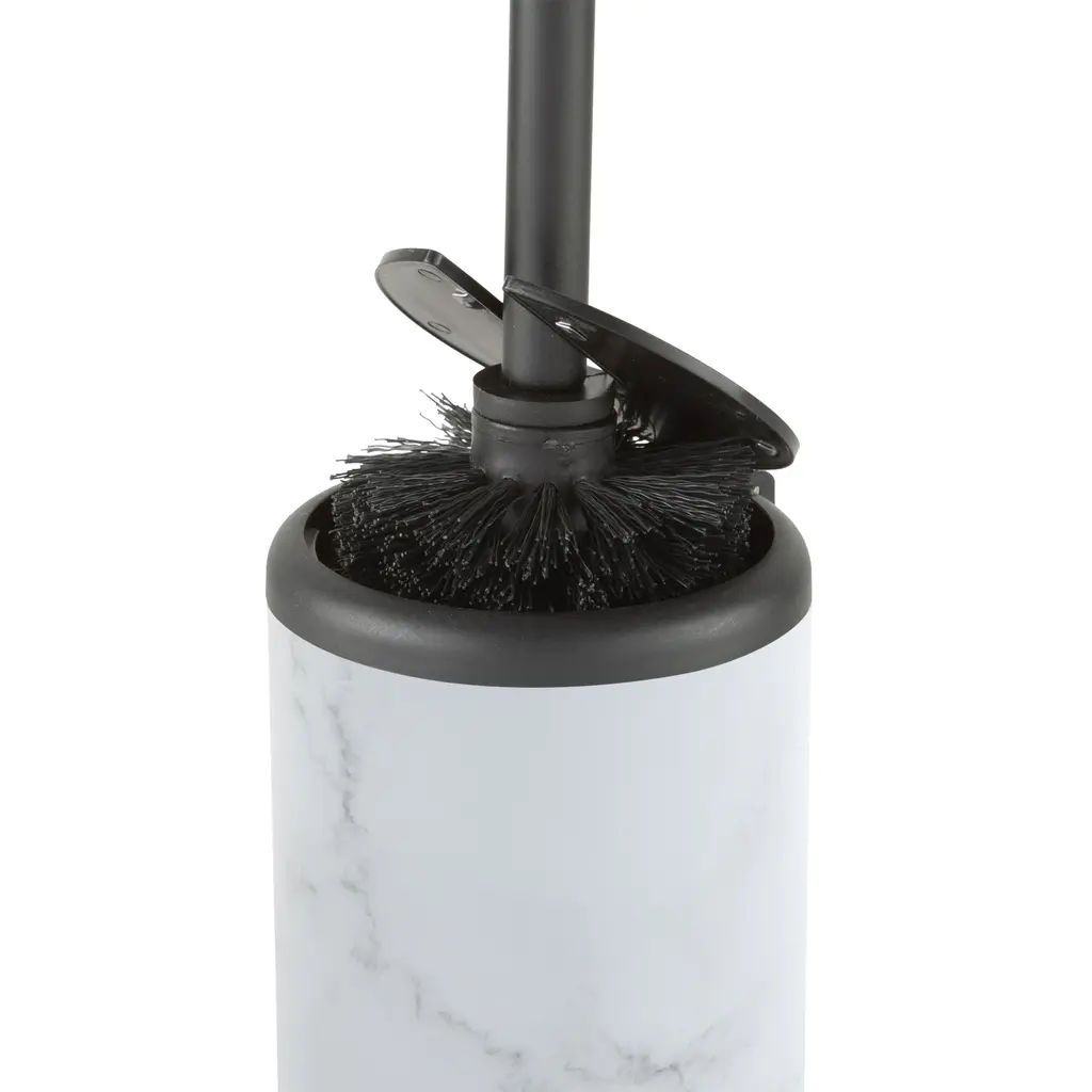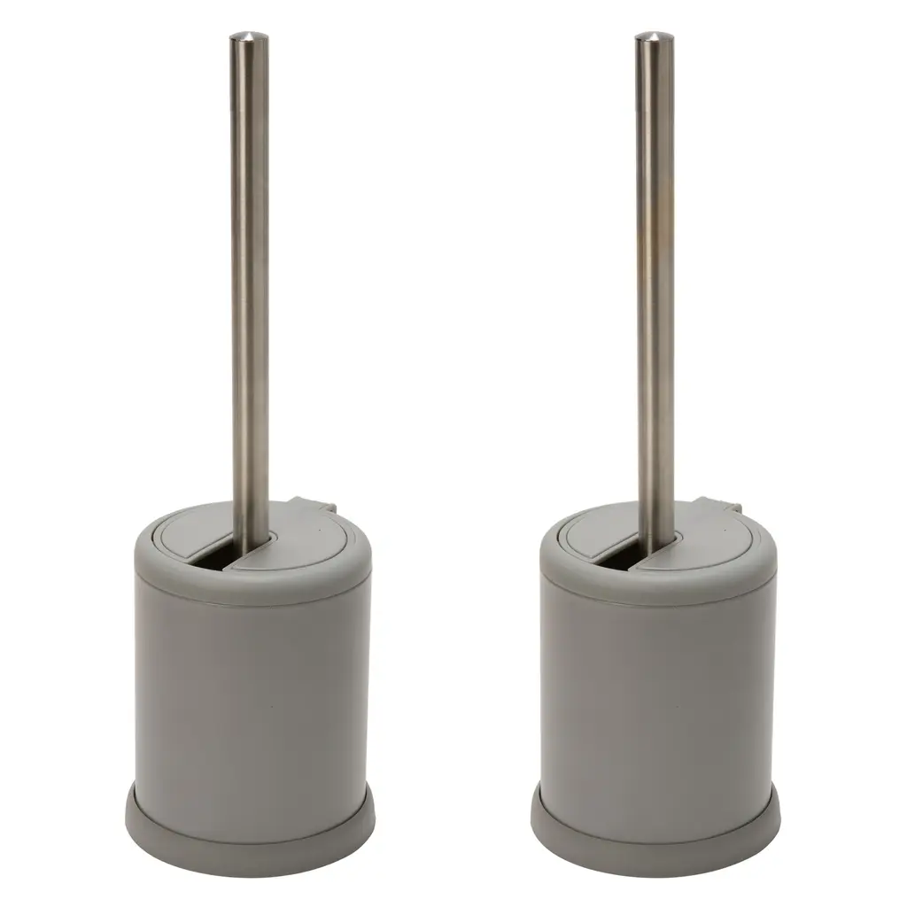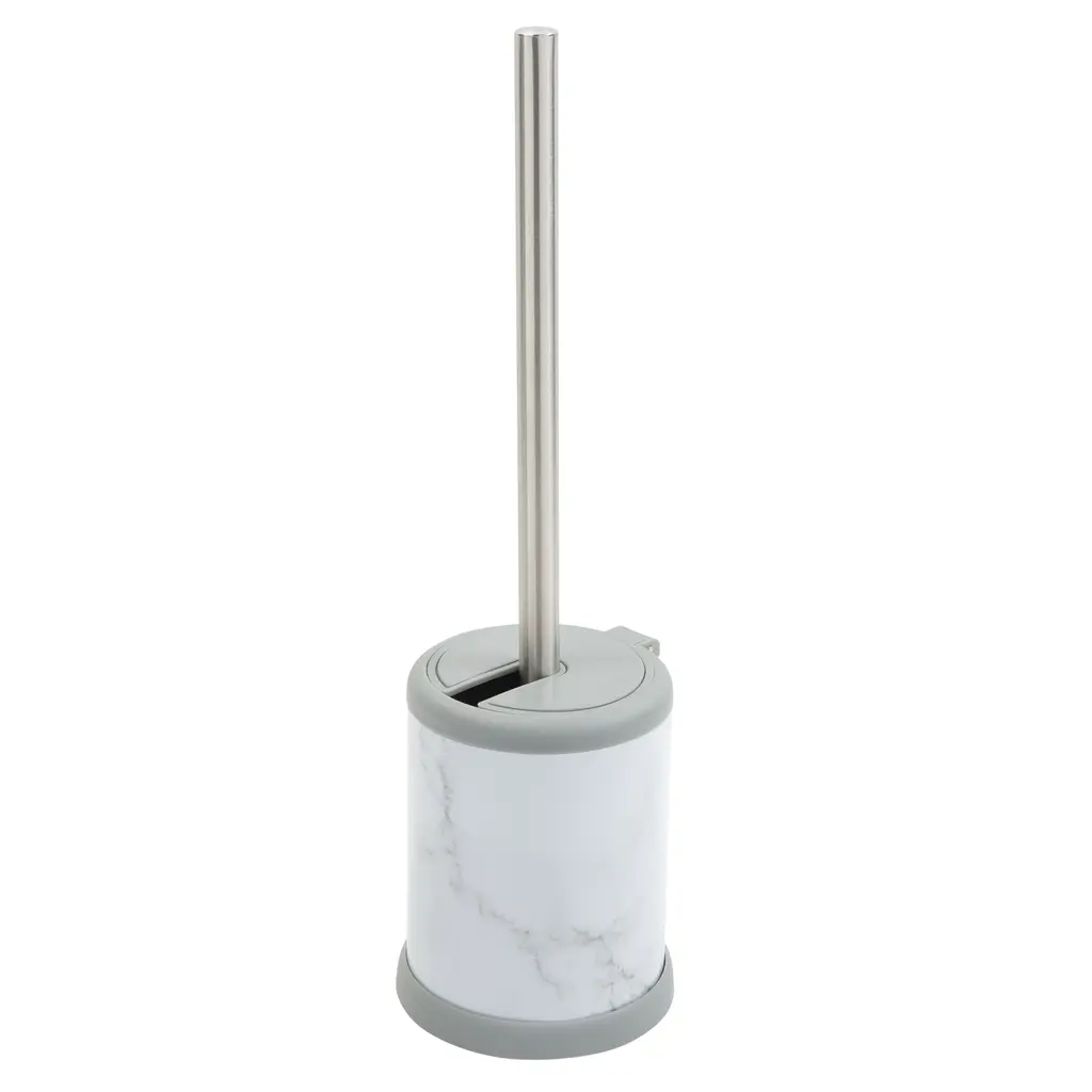 Store your toilet brush in plain sight with the attractive Bath Bliss Toilet Brush Set. This brush and decorative storage container is discreet and will make a lovely accent to most bathroom decors. The handle and canister for the bathroom toilet brush have a slick finish and are constructed from a hygienic and rust-resistant stainless steel. The set also has a durable, rounded, bristle brush that is designed to remain hidden when the product is not in use. This stainless steel toilet brush will keep both your bathroom and toilet looking their best. Treated to resist mildew, bacteria and rust. Comes with an opening and closing lid.