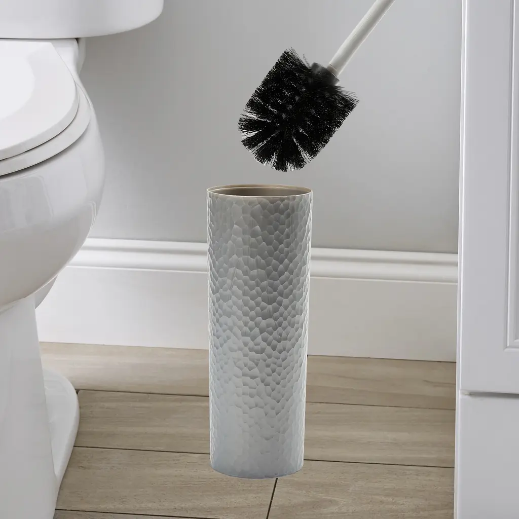 Store your toilet brush in plain sight with the attractive Bath Bliss Toilet Brush Set. This brush and decorative storage container is discreet and will make a lovely accent to most bathroom decors. The handle and canister for the bathroom toilet brush have a hammered finish and are constructed from a hygienic and rust-resistant AS plastic. The set also has a durable, rounded, bristle brush that is designed to effectively clean your toilet while remaining hidden when the product is not in use. This durable toilet brush will keep both your bathroom and toilet looking their best.