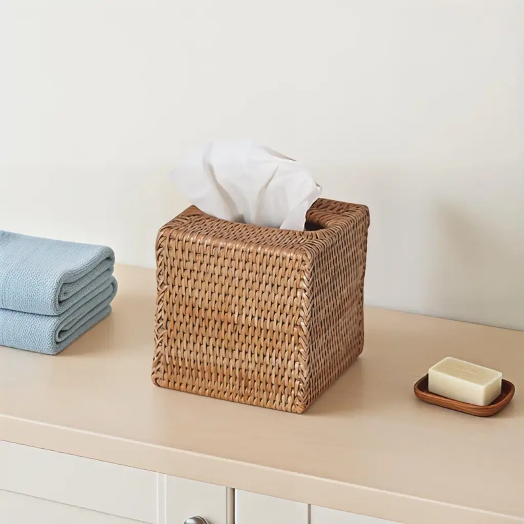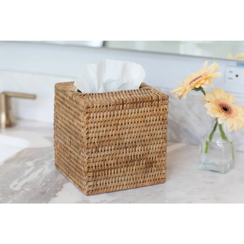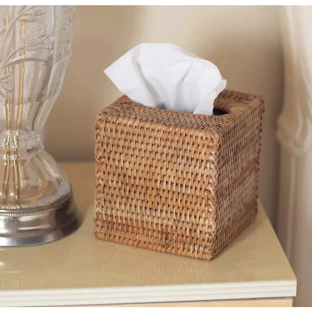 This tissue box cover features a breezy, handwoven design that's just right for bringing texture and style to your space. It's crafted from wicker rattan with your choice of rustic hue, so it's sure to blend in with your coastal farmhouse decor. This square box showcases an elongated opening on the top that prevents tissues from getting ripped. We also love how the open bottom lets you easily cover up any square tissue box. Plus, this piece has a small footprint that won't take up too much surface space in your bathroom or bedroom.