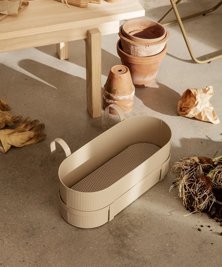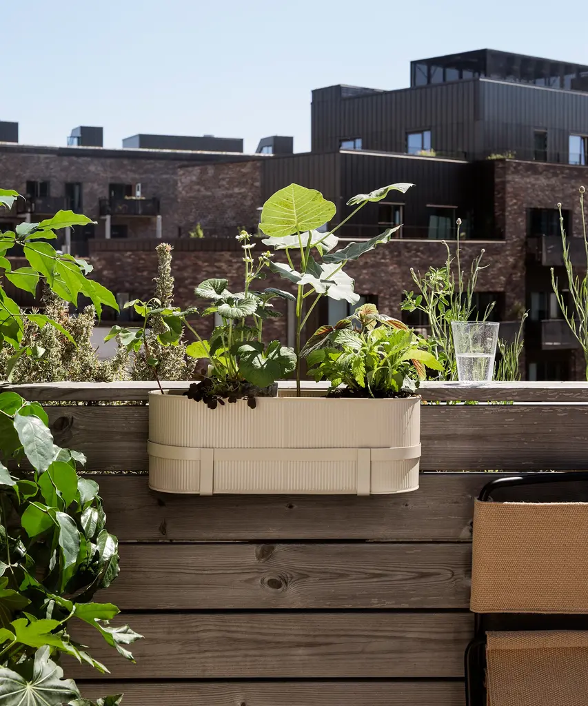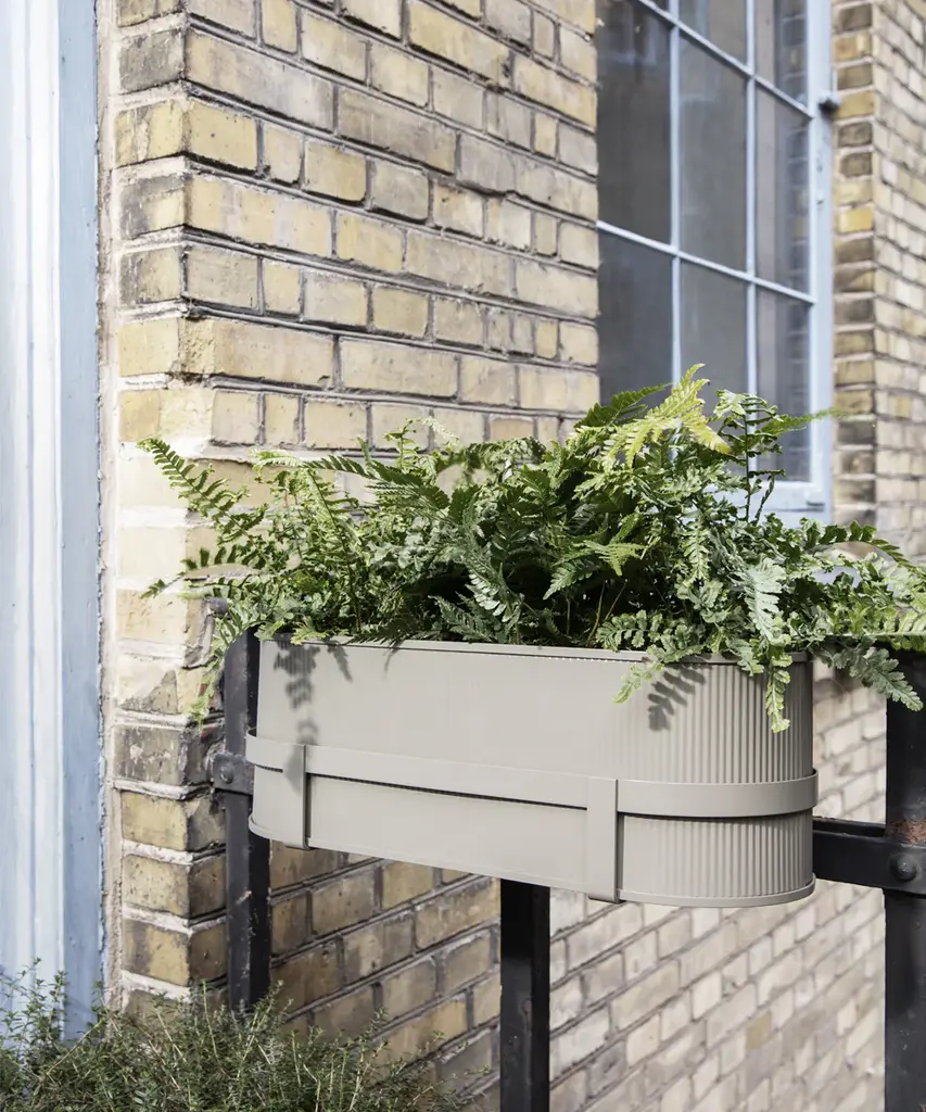 Enhance your well-being on the balcony or terrace with a stylish balcony box planter from the BAU series. The boxes borrow their expression from the uncluttered lines and industrial surfaces of the Bauhaus architecture, thereby giving any balcony a vibrant and classic look. They are easily mounted on a rail with two hooks and a metal bracket to make sure it hangs steadily. To give your plants the best care the boxes have a smart drainage system at the bottom, and the metal has been treated to make the boxes weatherproof. Designed and produced by the Copenhagen-based studio Ferm Living.