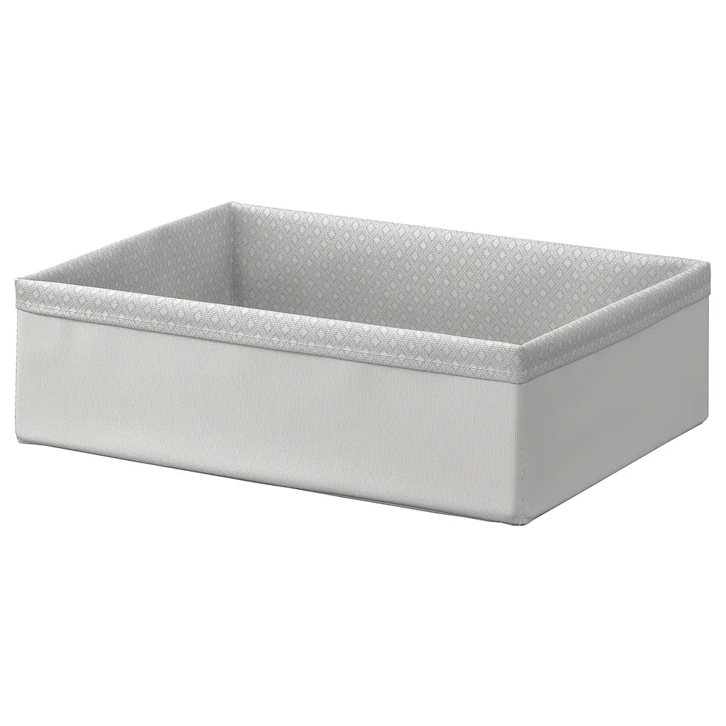 BAXNA Organizer - gray/white 10 ¼x13 ½x4 ". The inner side of the fabric has a decorative pattern that makes your drawer feel extra nice every time you open it. The size is perfect for storing underwear, accessories and hand towels or keys, pens and paper.
