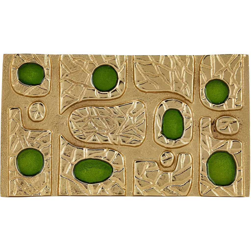 Inspired by a 1940s design, the Beau Monde Gold & Green Box has textural shapes made of cast aluminum in a gold finish, ornamented with green enamel lozenges fitted in place to create a lively pattern running along its surfaces. Inspired by a piece seen at a French flea market, the gold decorative box is lined in black fabric. For dry use only.