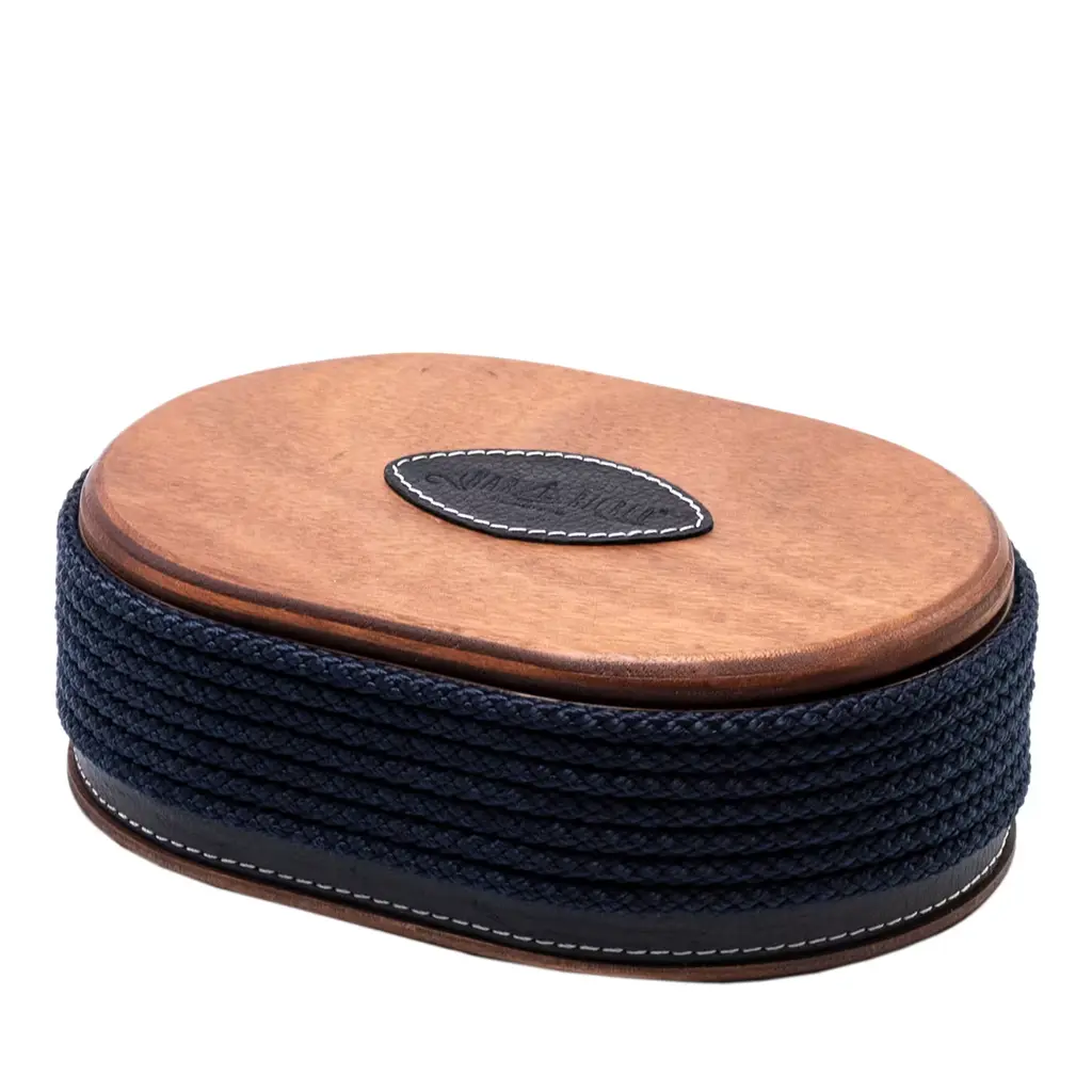 Subtle in its sophistication, this small jewelry box adds a rustic-chic touch in a modern-styled interior. Fashioned of solid wood, the oval shape is decorated with beige leather and natural rope. The hinged lid features a small rectangular mirror and the inside is lined with velvety material to protect jewels from damage. The light finish of the wood, the bold texture of the rope, and the smoothness of the leather combine in this small object that will be treasured for many years to come.