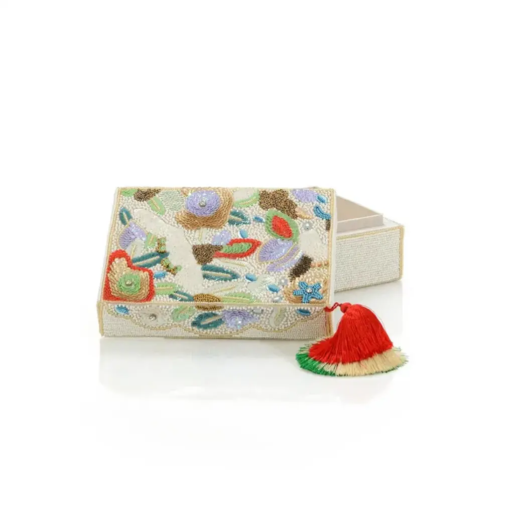 The meticulously beaded Belle Fleur box is box utilizing beads and sequins to create this beautiful bouquet of flowers. The box is lined in cream silk and is finished with a matching three-tier tassel.