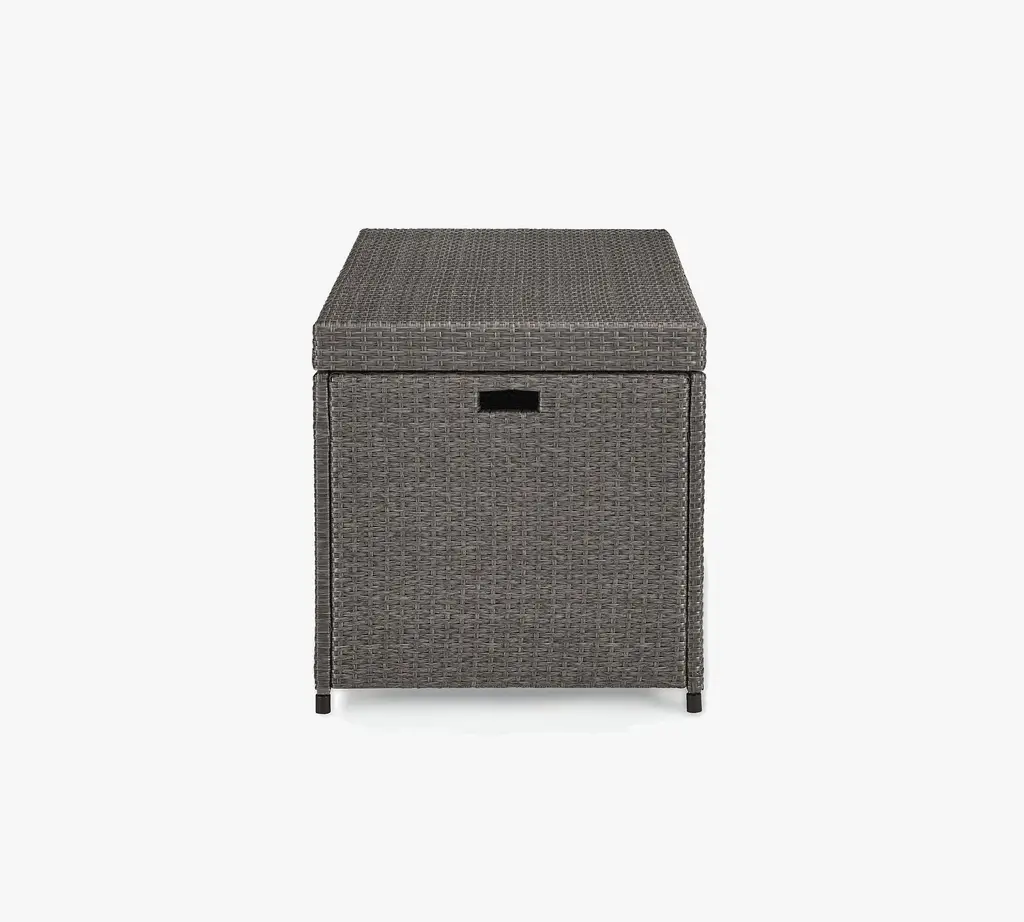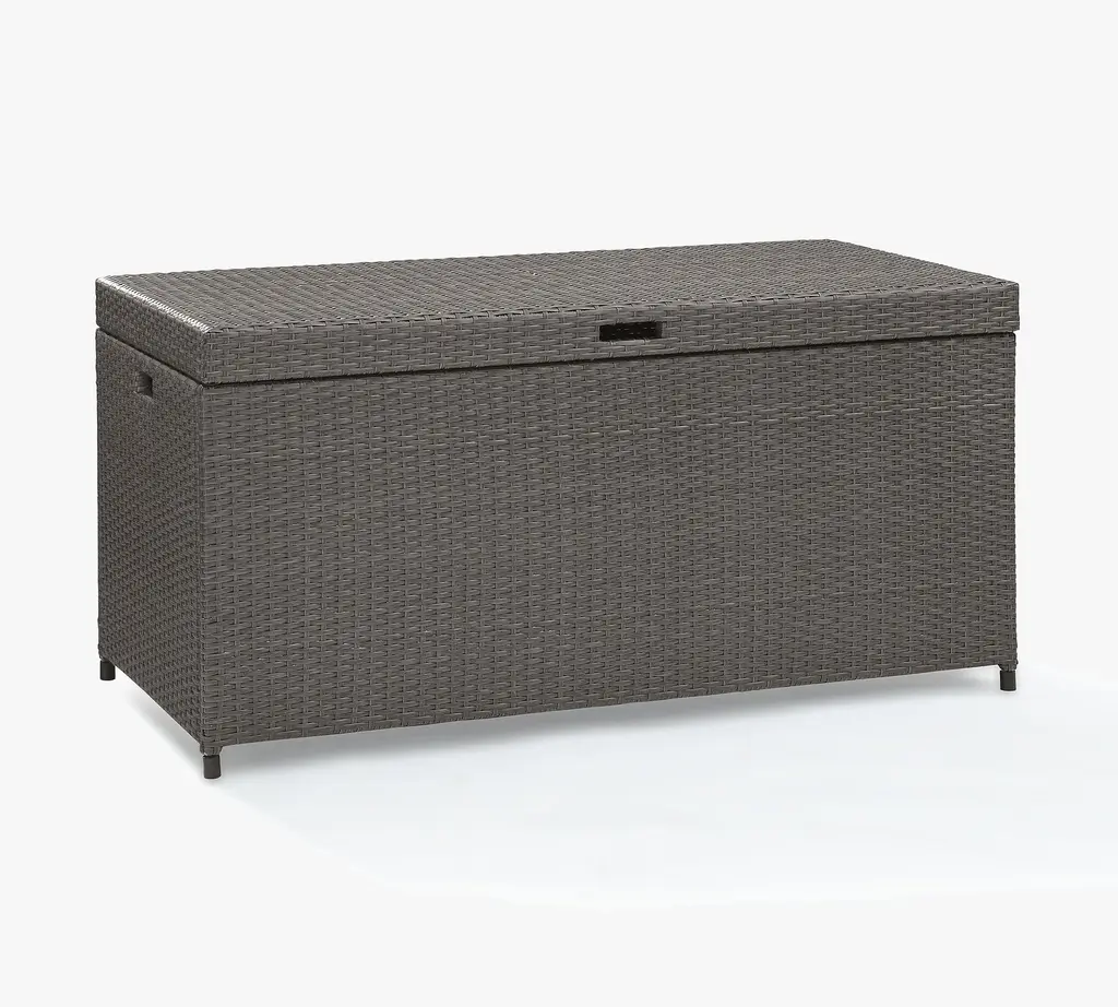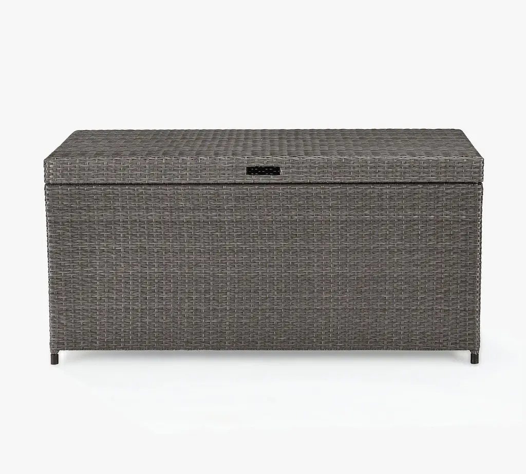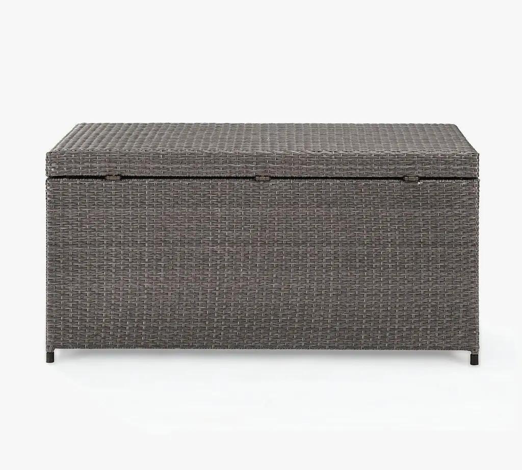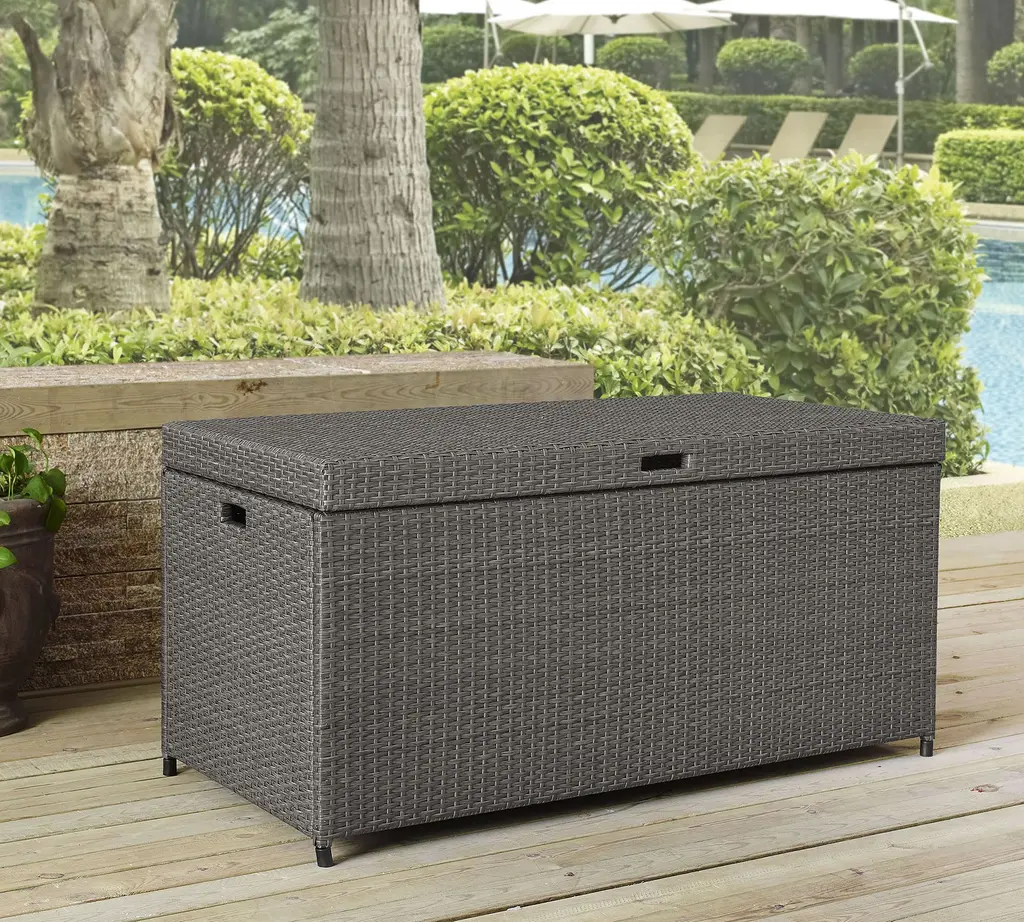 Keep your outdoor living space organized and tidy with this attractive storage bin. Featuring a durable powder-coated steel frame covered in all-weather wicker, this deck box stores your belongings in style with UV-resistant coating to prevent fading. Deep enough to hold cushions, pool toys and more.