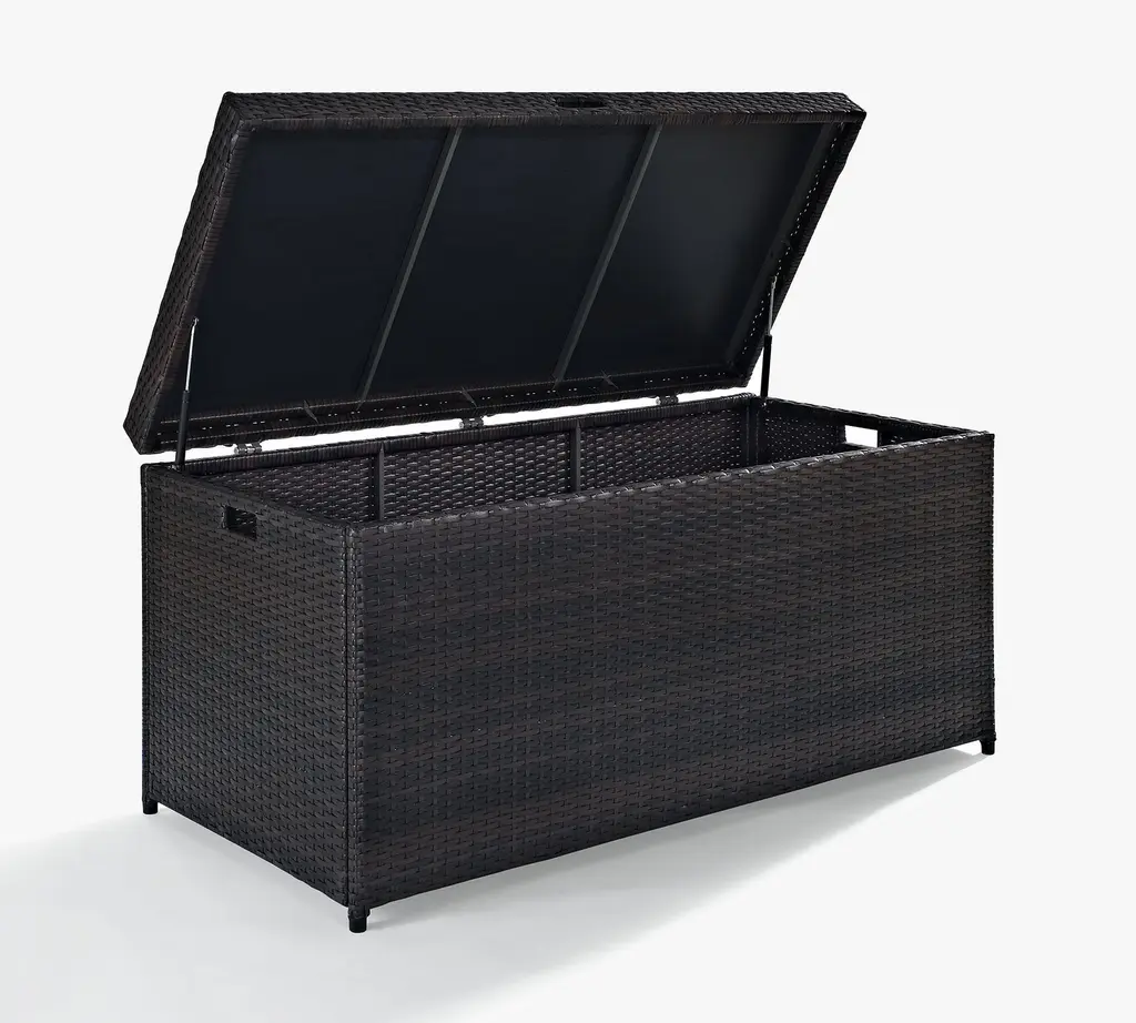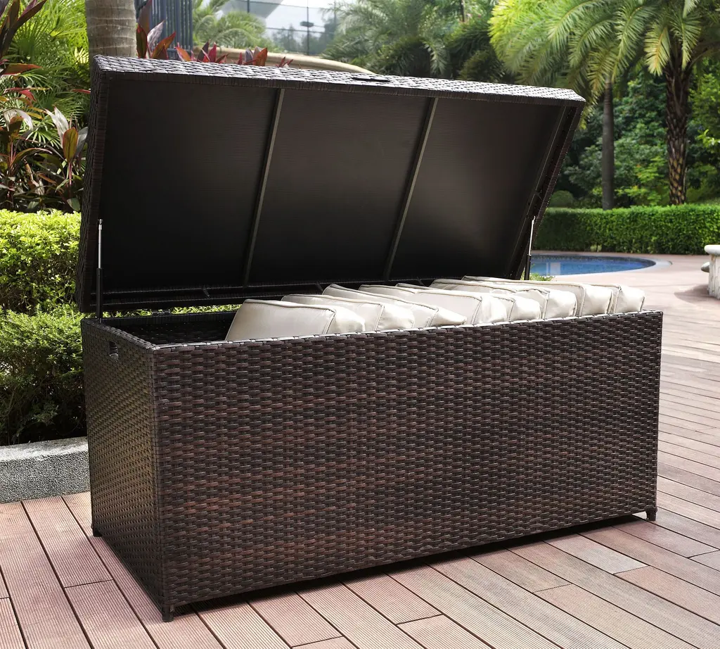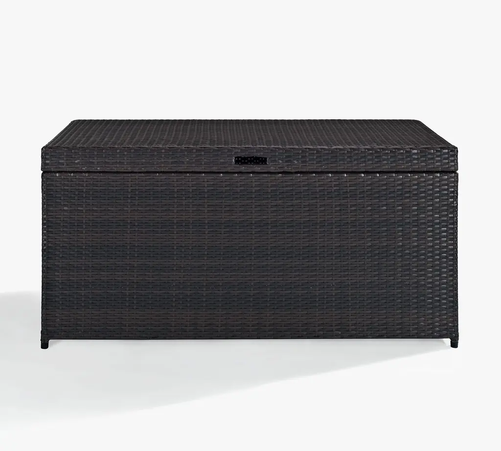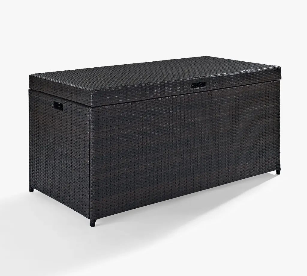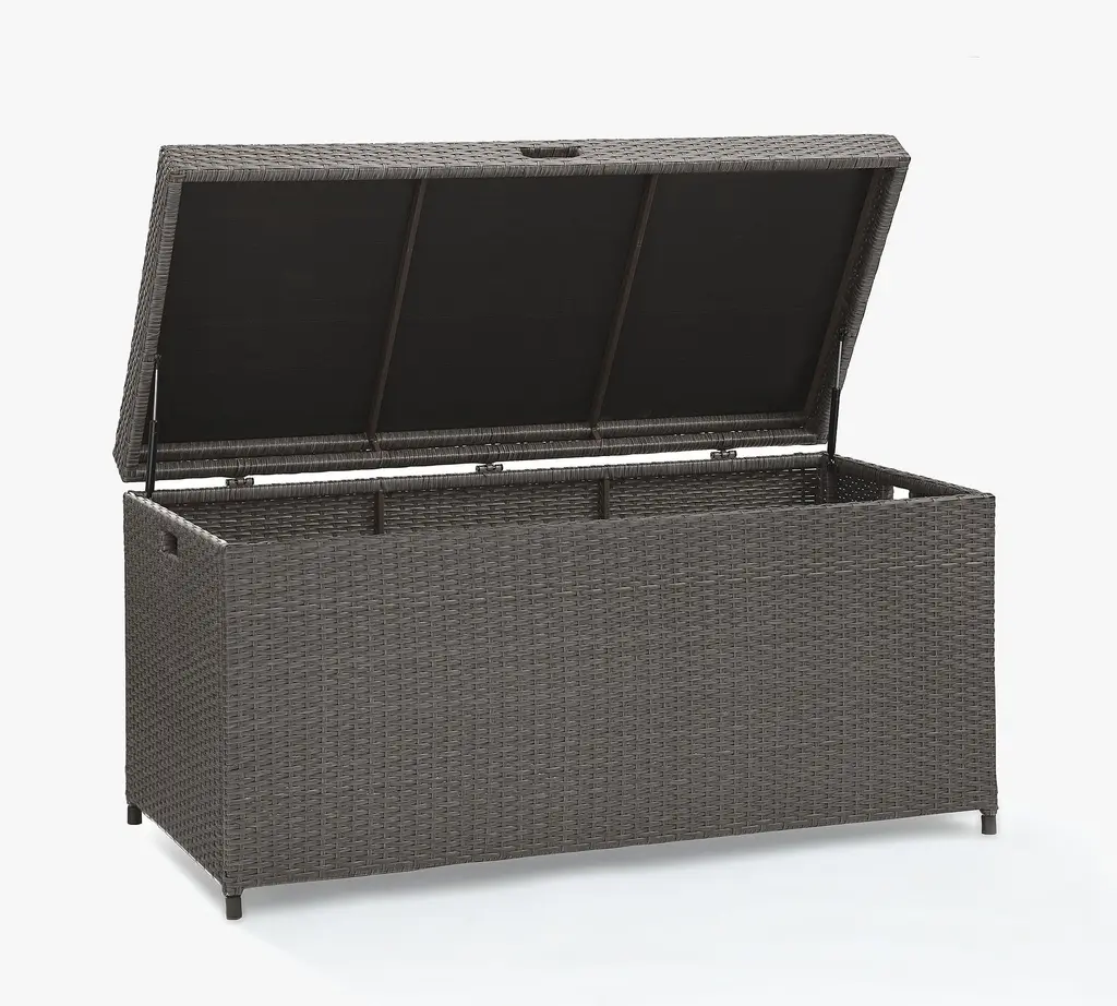 Keep your outdoor living space organized and tidy with this attractive storage bin. Featuring a durable powder-coated steel frame covered in all-weather wicker, this deck box stores your belongings in style with UV-resistant coating to prevent fading. Deep enough to hold cushions, pool toys and more.