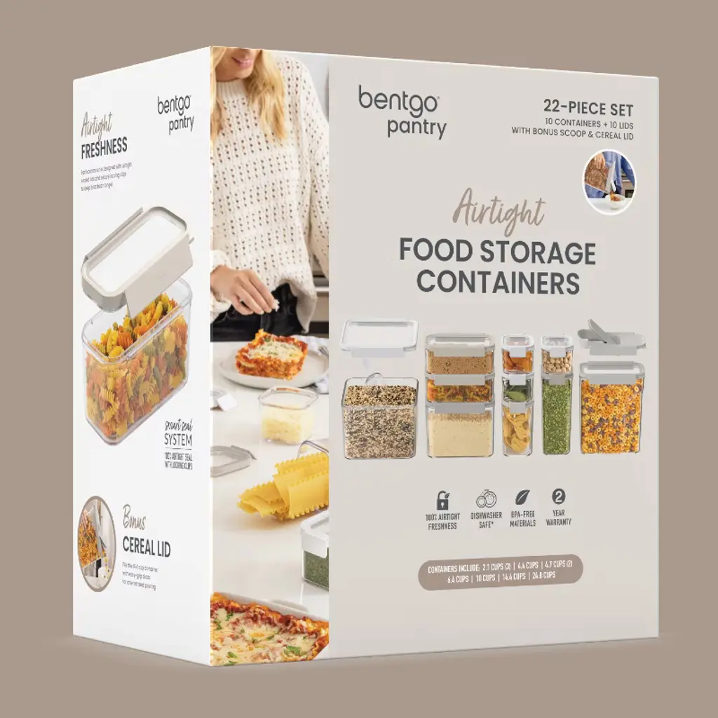 Elevate your kitchen and pantry organization with the Bentgo Pantry Airtight Food Storage Containers! This 22-piece set features 10 containers, 10 airtight lids, and bonus accessories including a half-cup scoop and a specialized cereal lid – giving you everything you need to neatly store and organize pantry staples like pasta, cereal, coffee, beans, sugar, flour, nuts, and more. Crafted from durable, crystal-clear plastic, these containers are both odor- and stain-resistant, offering a glass-like transparency that lets you quickly spot what's inside – perfect for those moments when you're in a rush. There is also a space at the bottom to write dates, making it easy to track expiration dates and contents while helping you stay organized and efficient. With airtight lids that feature secure locking clips for easy access and a space-saving stackable design, your food will stay fresh, and your pantry will look tidy and well-organized. Say goodbye to clutter and hello to fresh, neatly stored food with Bentgo Pantry.Space-Saving Design: stackable containers allow for space-saving organization of your kitchen, pantry, or countertops. Durable Crystal Clear Plastic: Transparent glass-like clarity makes it easy to see what’s inside while also being stain and odor-resistant and BPA-free. Airtight Freshness: Each container is designed with airtight sealed lids and secure locking clips to keep food fresh longer.Easy-Open Clips: Maintain the freshness of your pantry staples with the easy open and close locking clips that snap right into place. Bonus Items: Use the bonus ½ cup scoop for measuring and scooping pantry essentials, and the cereal lid for one-handed pouring with the 14.4 cup container.