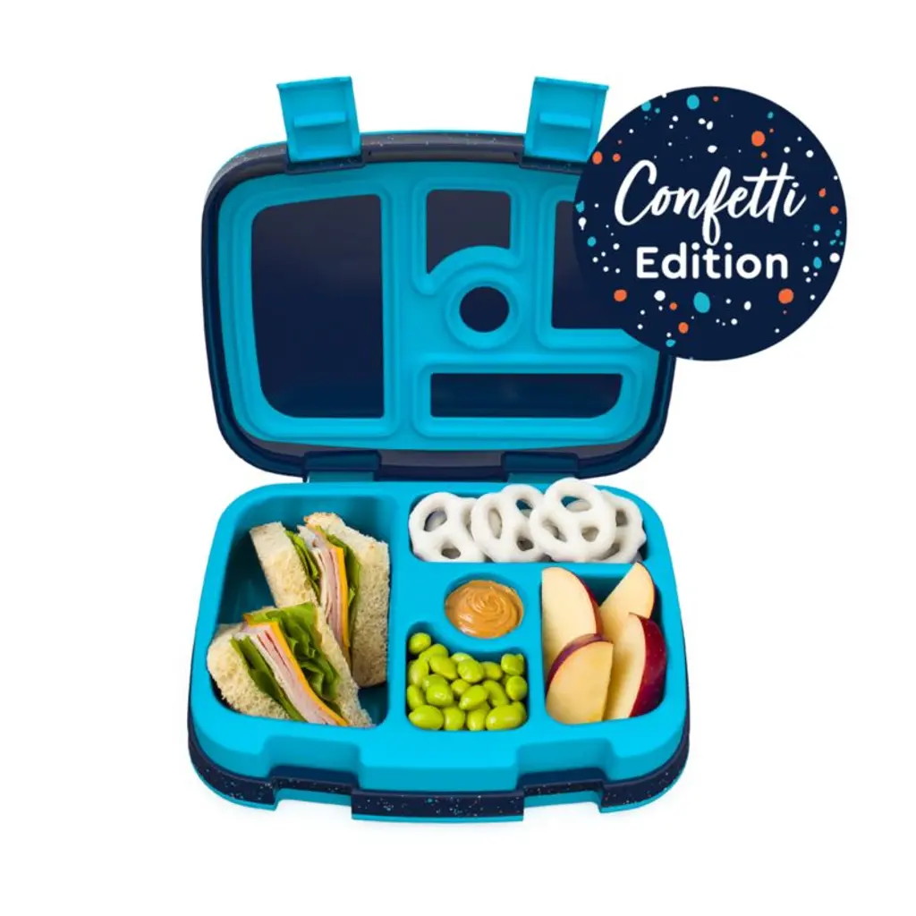Make mealtimes more fun with this cleverly designed, hold-it-all Bentgo® bento lunch box. On the outside, a colorful splash of confetti sparkles on a deep ocean-blue background. Inside, 5 portion-perfect compartments are sized to hold half sandwiches, fruits and veggies, and even dips like yogurt and hummusall in a mess-free, leak-proof package. Slim and lightweight, this sturdy little box features 2 kid-friendly latches and a drop-proof design with durable rubber-coated edges. Plus, grown-ups will appreciate the convenience of popping the removable tray into the dishwasher.
