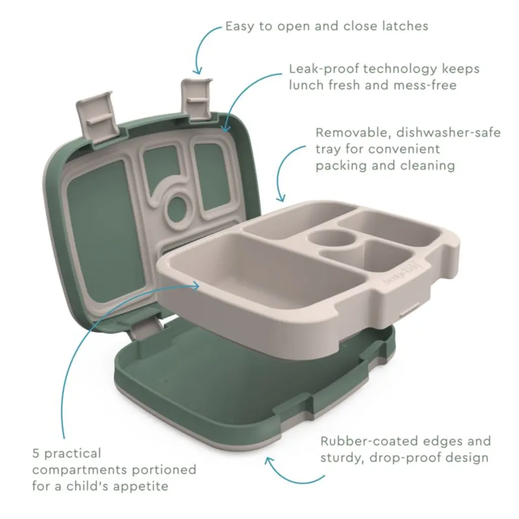 Make mealtimes more fun for dinosaur lovers with this cleverly designed, hold-it-all Bentgo® bento lunch box. On the outside, a colorful mix of dino fossils decorates a soft grey background. Inside, 5 portion-perfect compartments are sized to hold half sandwiches, fruits and veggies, and even dips like yogurt and hummusall in a mess-free, leak-proof package. Slim and lightweight, this sturdy little box features 2 kid-friendly latches and a drop-proof design with durable rubber-coated edges. Plus, grown-ups will appreciate the convenience of popping the removable tray into the dishwasher.