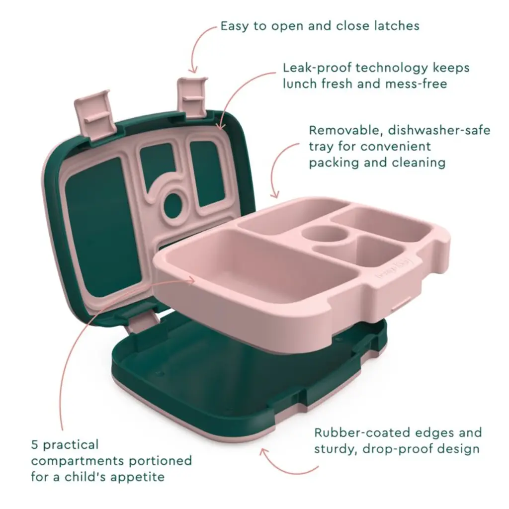 Decked out in a pink and green color palette, this cleverly designed Bentgo ® bento lunch box features a sweet print of rainbows, clouds, hearts and stars. Inside, five portion-perfect compartments are sized to hold half-sandwiches, fruits and veggies and even dips like yogurt and hummusall in a mess-free, leak-proof package. Slim and lightweight, this sturdy little box features durable rubber-coated edges, two child-friendly latches and a drop-proof design. Plus, grown-ups will appreciate the convenience of popping the removable tray into the dishwasher.