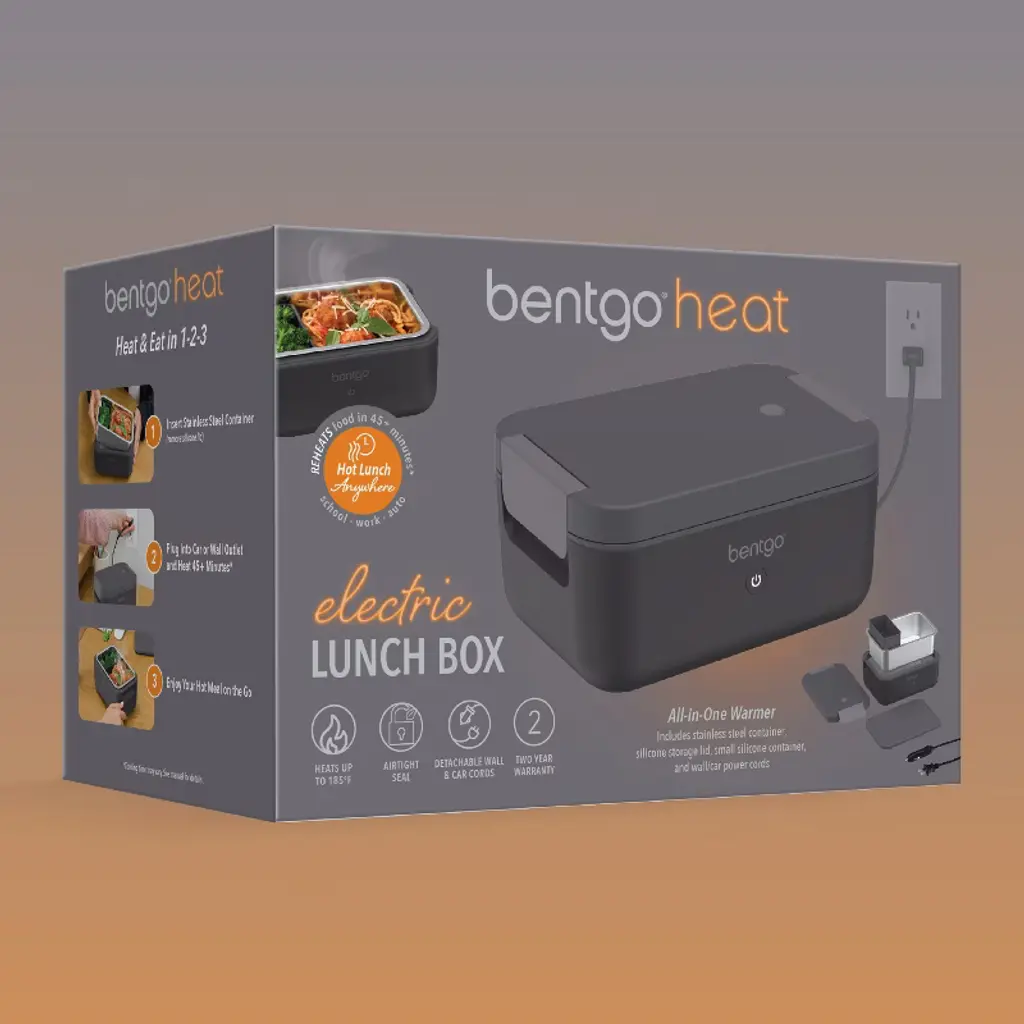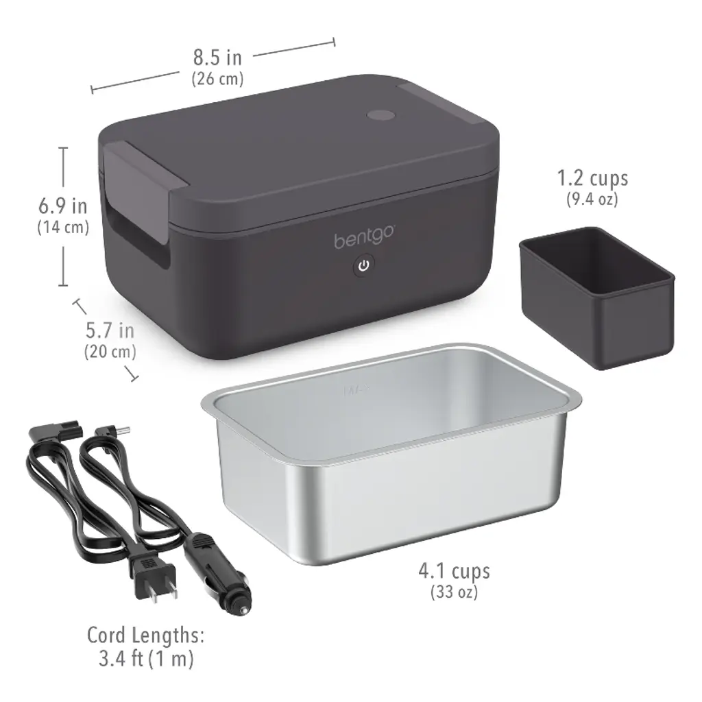 Say goodbye to cold meals with the Bentgo Heat Electric Lunch Box – a portable, innovative solution for heating meals on the go. This sleek and compact electric lunch box features advanced warming technology that gently heats your food to perfection, ensuring each bite tastes as freshly prepared as if it were just made. Simply insert the stainless steel container, remove the silicone lid, and seal the box with the airtight lid by locking the clips. Plug the heated lunch box into a wall or car outlet, press the power button, and let your food heat for 45 minutes or more. The Bentgo Heat Electric Lunch Box is a self-heating and fast-heating solution, easy to use, and a perfect microwave alternative for adults at the office, school, shift workers, camping, or anyone on the go.Quick-Heating: Simply insert the stainless steel container, seal the box, and plug into a 12V/24V car outlet or 120V wall outlet – no microwave needed. The electric lunch box food heater warms your meal in 45 minutes or more.Portable & Convenient: This portable food warmer allows you to prep meals in the leakproof stainless steel container and carry it separately from the electric lunch box for easy transport. It’s lightweight and durable, making it perfect for meals on the go.Easy to Clean: The stainless steel container and lid are dishwasher safe, while the electric lunch box is easy to wipe clean after use.Capacity: The stainless steel container holds 4.1 cups, while the included small silicone container holds 1.2 cups, giving you ample capacity for a satisfying meal.All-in-One Food Warmer: Includes a stainless steel container, silicone lid, small silicone container, 120V wall cord, 12V/24V car cord, 2-year warranty, and customer support. The electric lunch box food heater is the perfect heated lunch box for adults who need a reliable, portable solution for hot meals on the go.