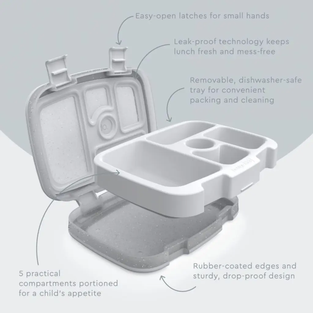 Make mealtimes more fun with this cleverly designed, hold-it-all Bentgo® bento lunch box. On the outside, a sparkling splash of glitter decorates a semi-transparent background. Inside, 5 portion-perfect compartments are sized to hold half sandwiches, fruits and veggies, and even dips like yogurt and hummusall in a mess-free, leak-proof package. Slim and lightweight, this sturdy little box features 2 kid-friendly latches and a drop-proof design with durable rubber-coated edges. Plus, grown-ups will appreciate the convenience of popping the removable tray into the dishwasher.
