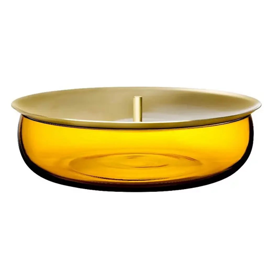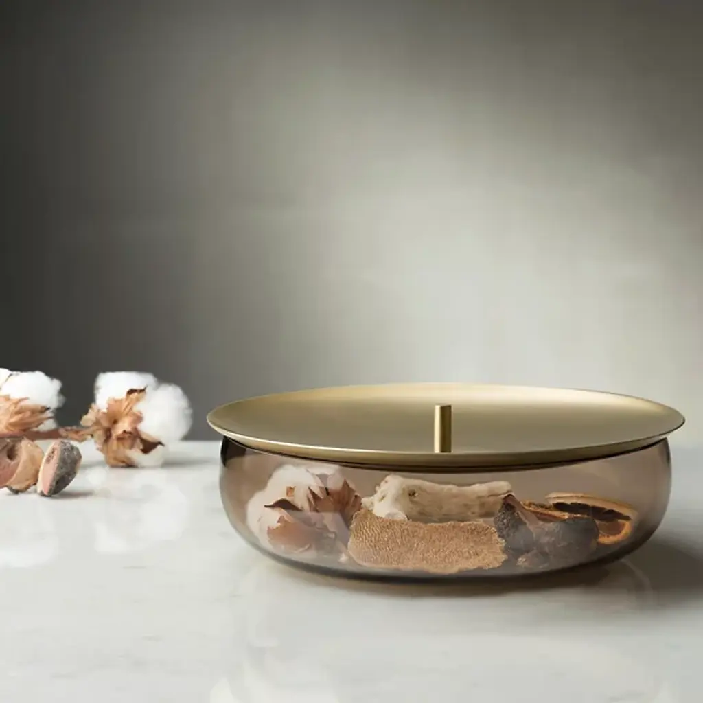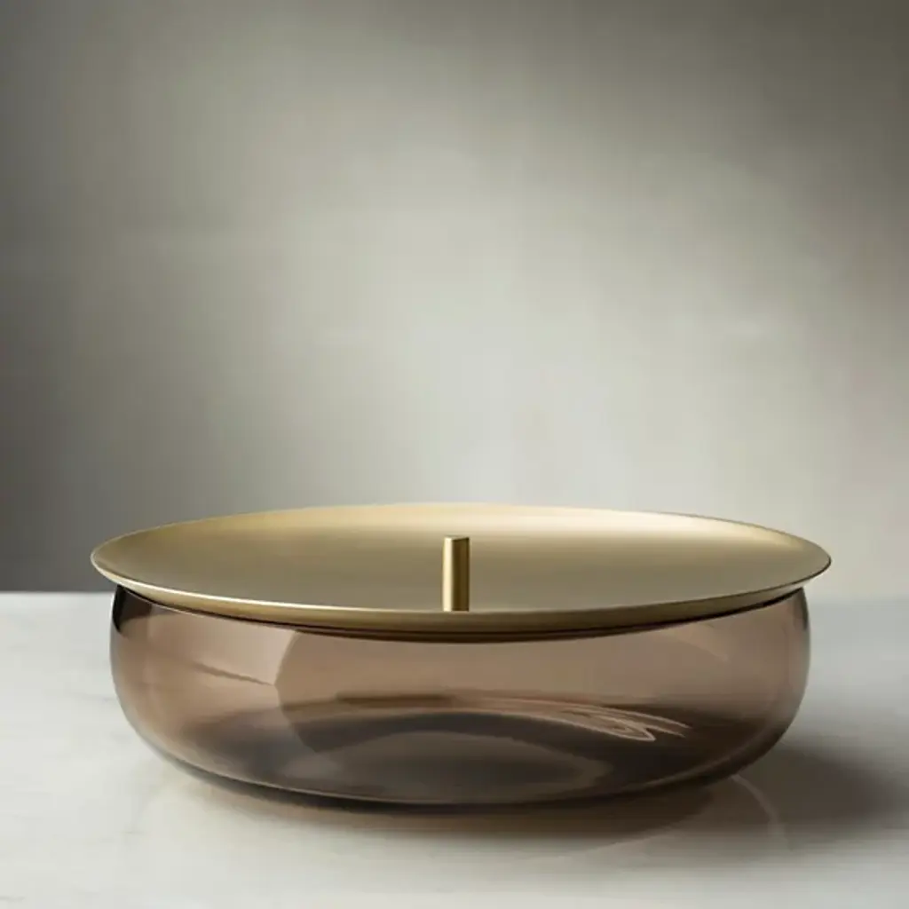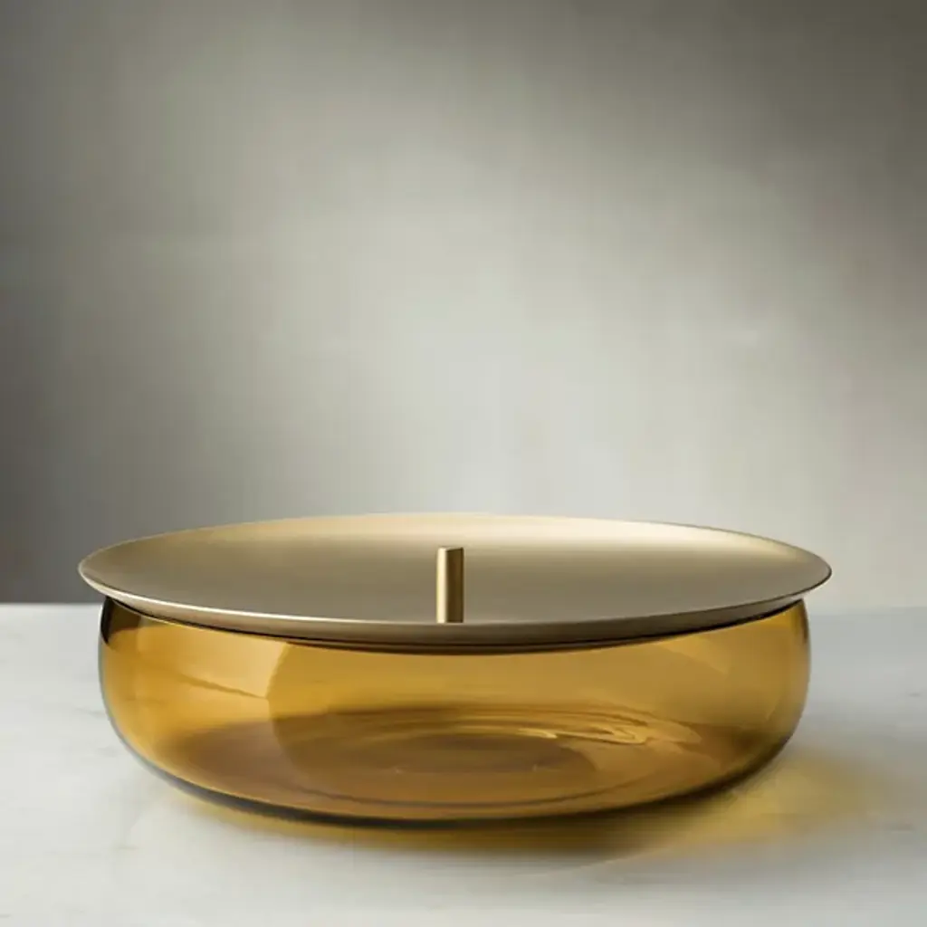 Drawing inspiration from the chic French accessory, the Beret Short Storage Box by Nude is a minimalistic accent piece with simple functionality. Its bowl-shaped base is crafted of transparent colored glass, forming a wide, elegant container. Its concave brass lid doubles as a tray for additional items while a small handle refines the beret style. Designed by German-born Sebastian Herkner, this piece showcases his distinct ability to fuse cultural references with modern technology and design.