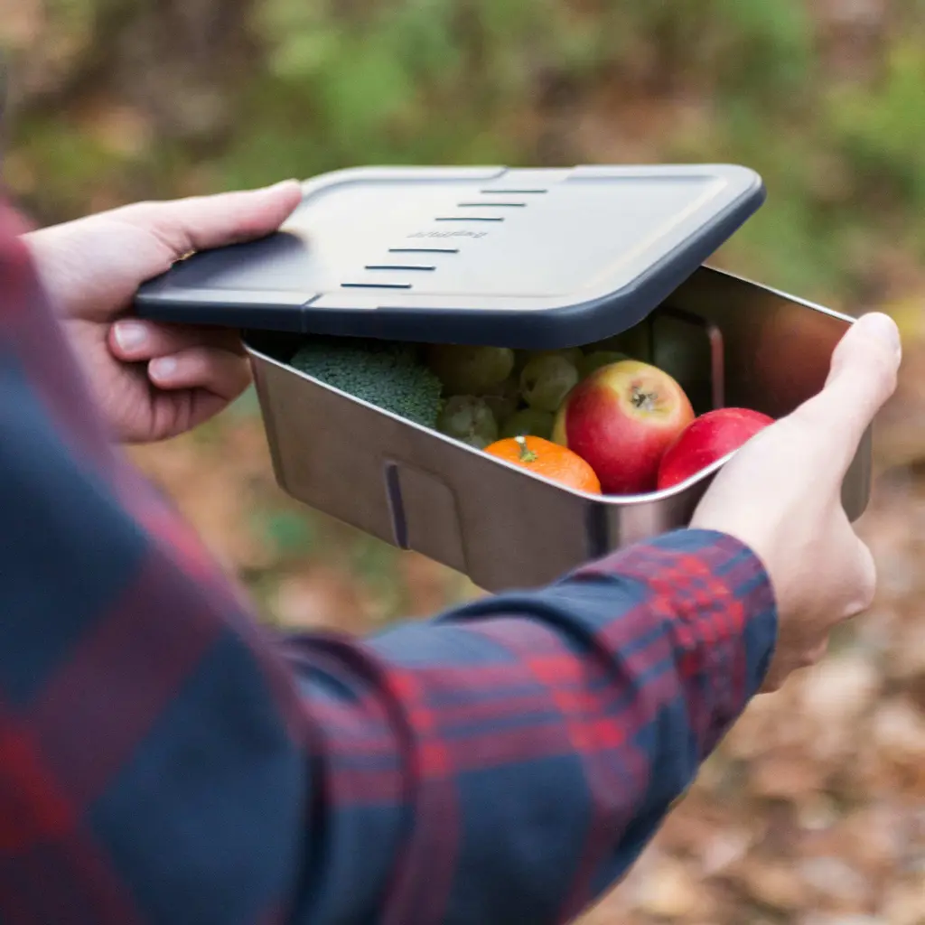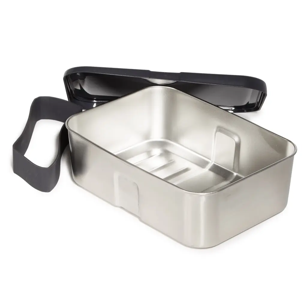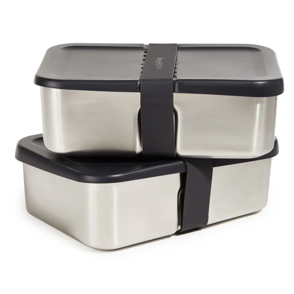 Essentials 6pc Lunch Box Set for two is perfect for at the office, at school or on the go, easily enjoy a balanced lunch wherever you are. Just pack your favorite fruits and veggies or a tasty sandwich in the generously sized container and wrap the silicone stretch band around the box to keep the PP lid on tight. Thanks to the high-quality stainless steel, you've got a durable lunch box that's not only a breeze to clean but will also stand the test of time. You can easily store your utensils on the lid with the help of stretch band. It's also an ideal for leftover storage. Package includes 2x Lunch Box 8.25" x 5.75" x 2.75", 2x Silicone stretch bands, and 2x PP lids.