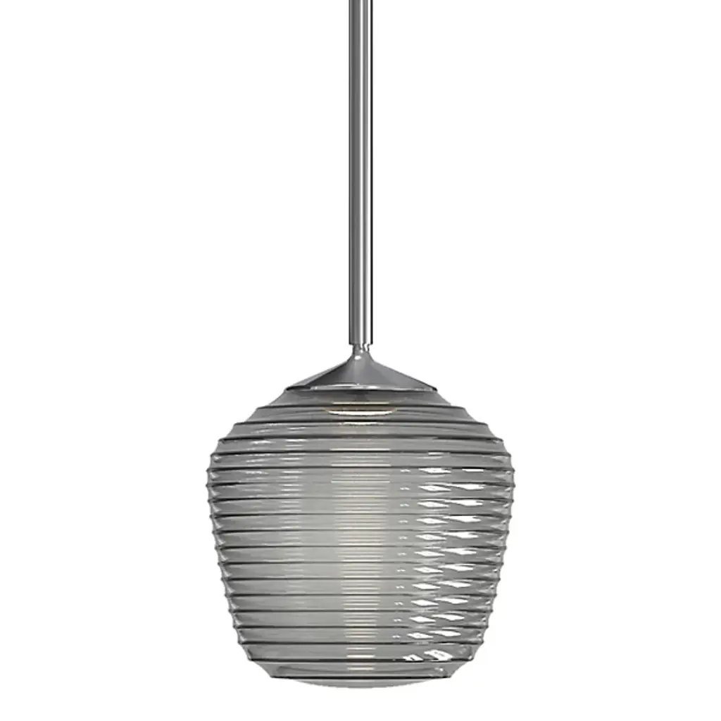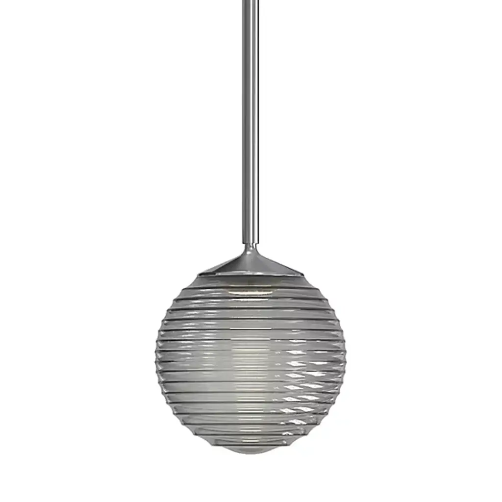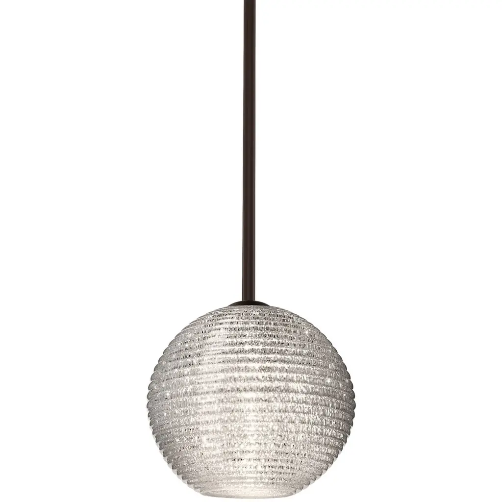 The Kristall is a transparent globe shape, with distinctive ridges, that fits gracefully into contemporary spaces. Our Glitter glass is a clear blown and a technologically advanced crystal coating applied to the inside. The coating contains multiple micro-layers of glass particles that create unique prismatic optical properties, which effectively alter both the reflected and transmitted light. So unlit, it appears like a frosted glass; when lit, it becomes alive with dazzling light effects. The 12V cord pendant fixture is equipped with a 10' braided coaxial cord with Teflon jacket and a low profile flat monopoint canopy. These stylish and functional luminaries are offered in a beautiful Satin Nickel finish.