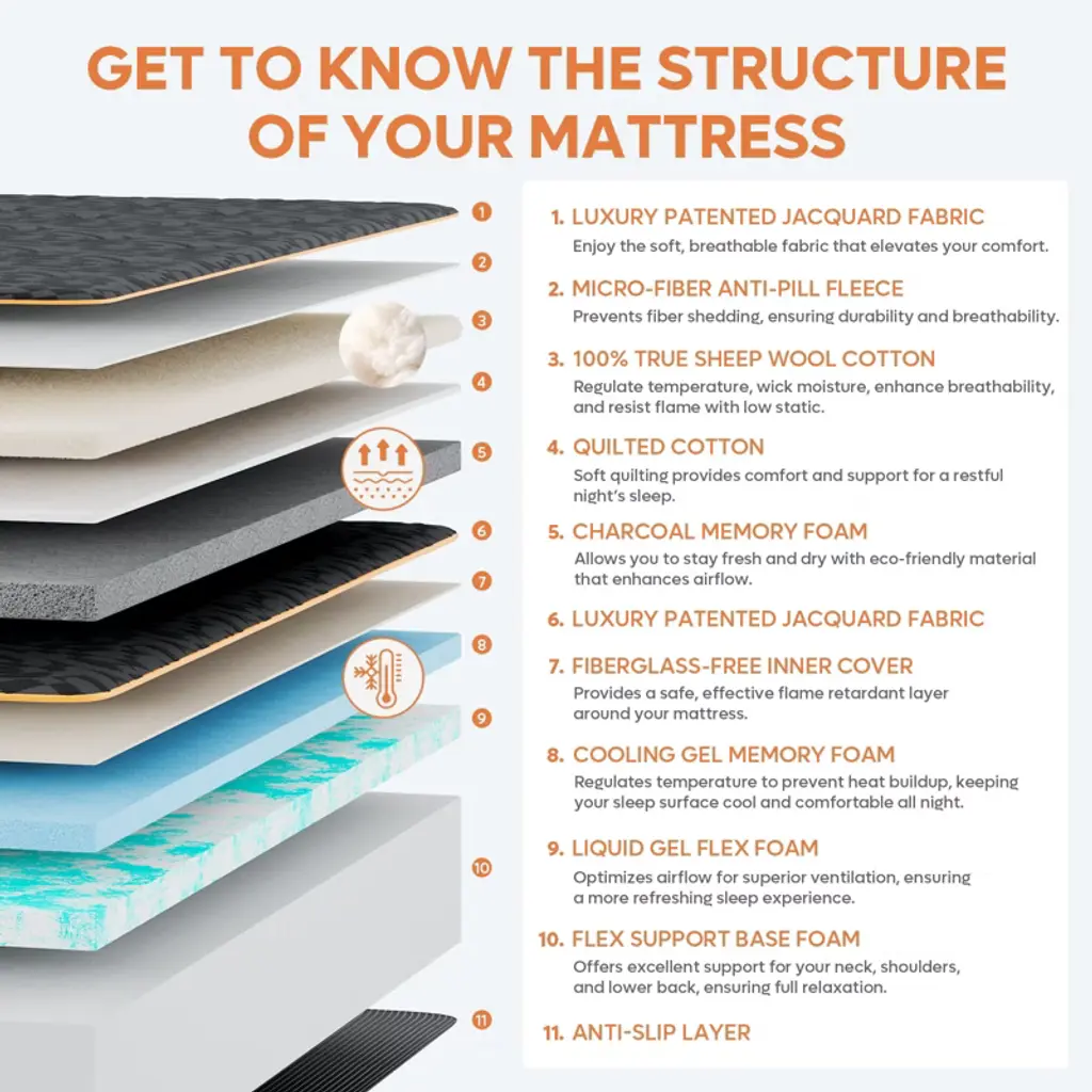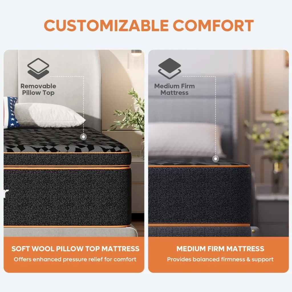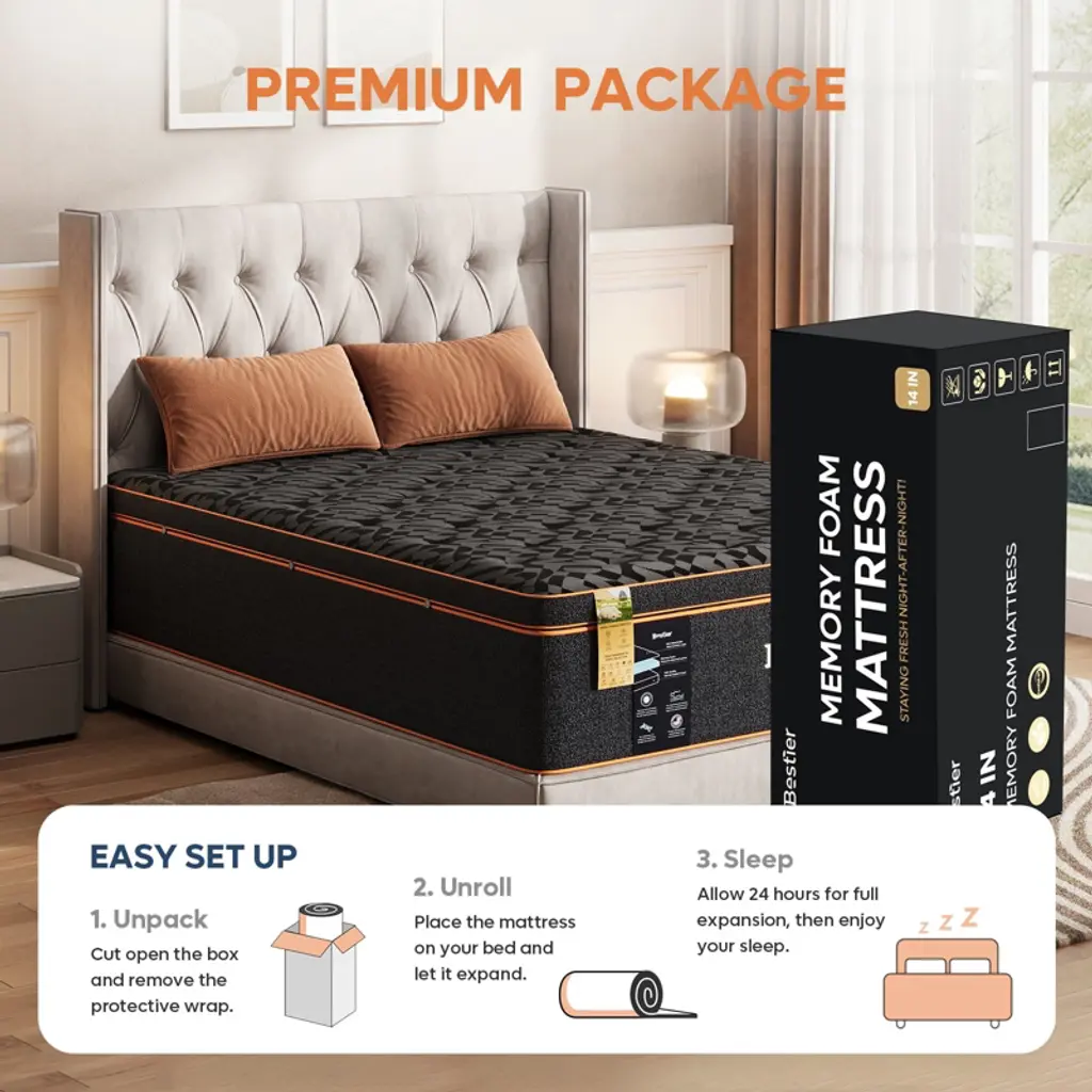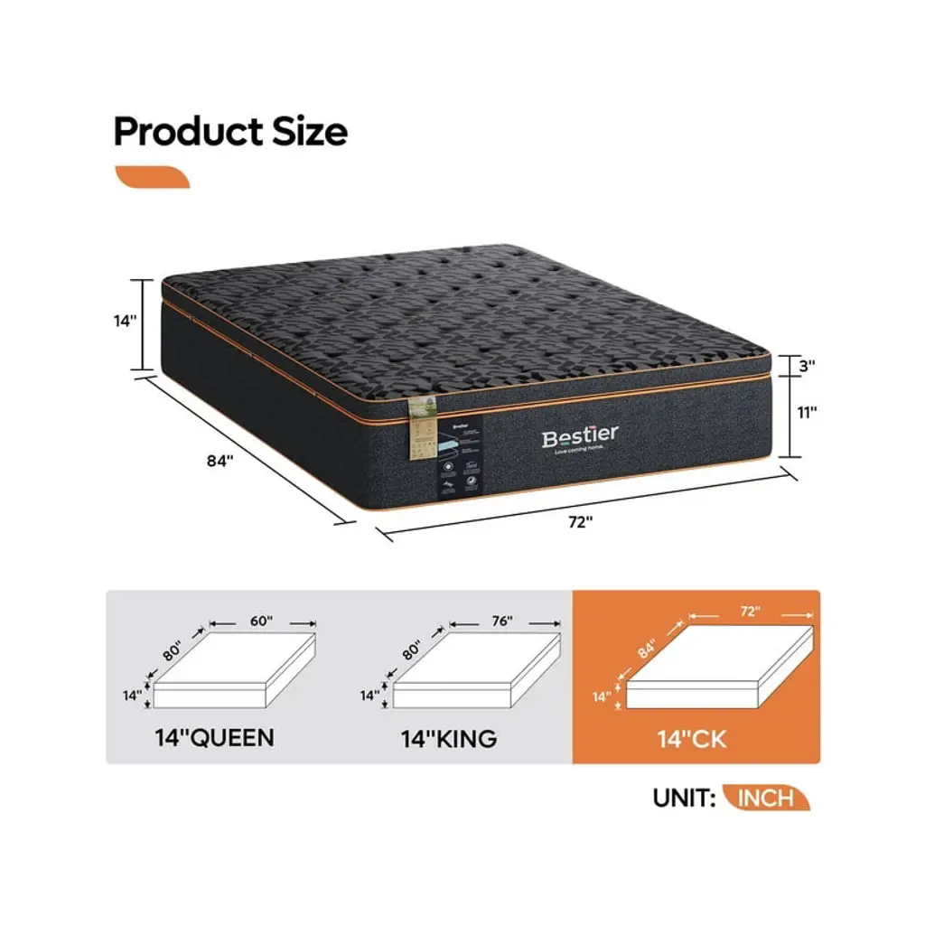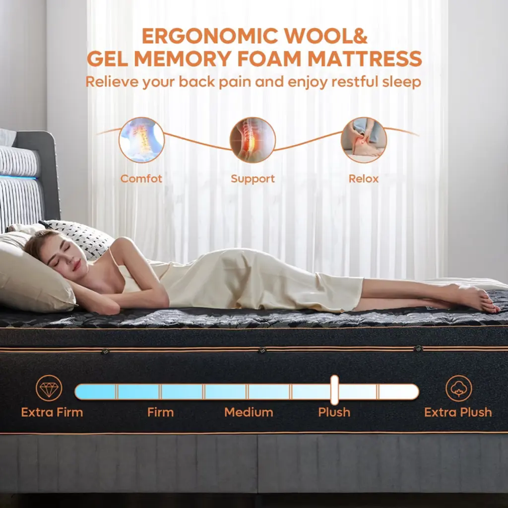 Are you looking for a comfortable and affordable mattress for a good night¡¯s sleep? Consider trying the Bestier black 14-Inch wool gel memory foam california king mattress in a box, featuring medium firmness and high-quality construction, provding excellent support without sagging and effectively alleviate back pain. The support layer of the entire mattress is composed of 9 inches of high-resilience foam, 4 inches of memory foam, and a wool layer. The extra-thick memory foam cushioning layer, wrapped in the wool layer, making the mattress ofter and allowing you to enjoy a more comfortable sleep. If you have any issues after receiving the mattress, please contact us directly.