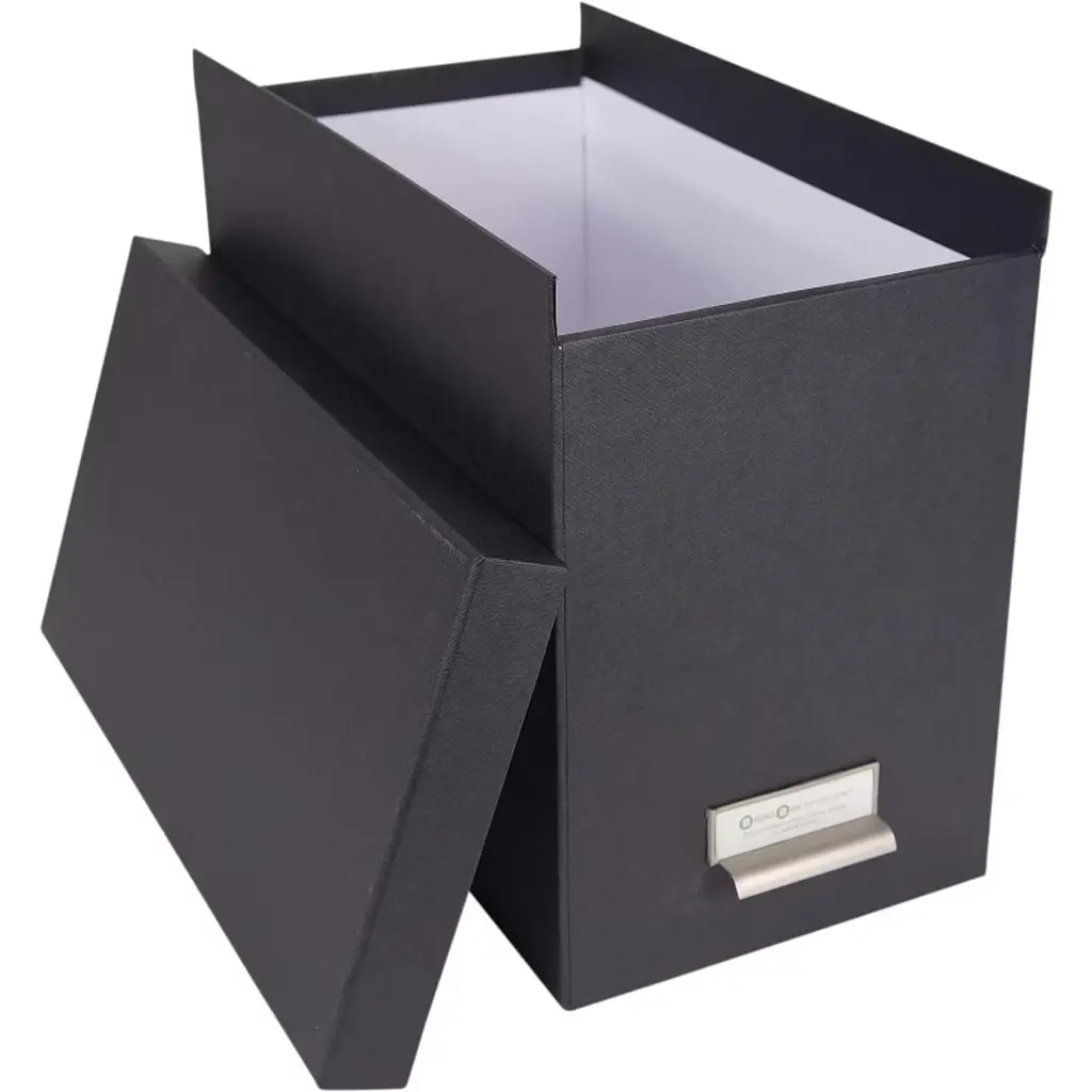 Bigso’s John Fiberboard Label Frame Desktop File Storage Box increases your efficiency by storing and sorting your important paperwork! It is an attractive decorative container which organizes your bills, recipes, product manuals and more. The 7.4 in x 13 in x 10.4 in size allows it to hold letter size papers while the lid hangs over the side of the box to accommodate letter size hanging files (not included). A metal label holder is included so you can write on the insert paper what is stored inside.