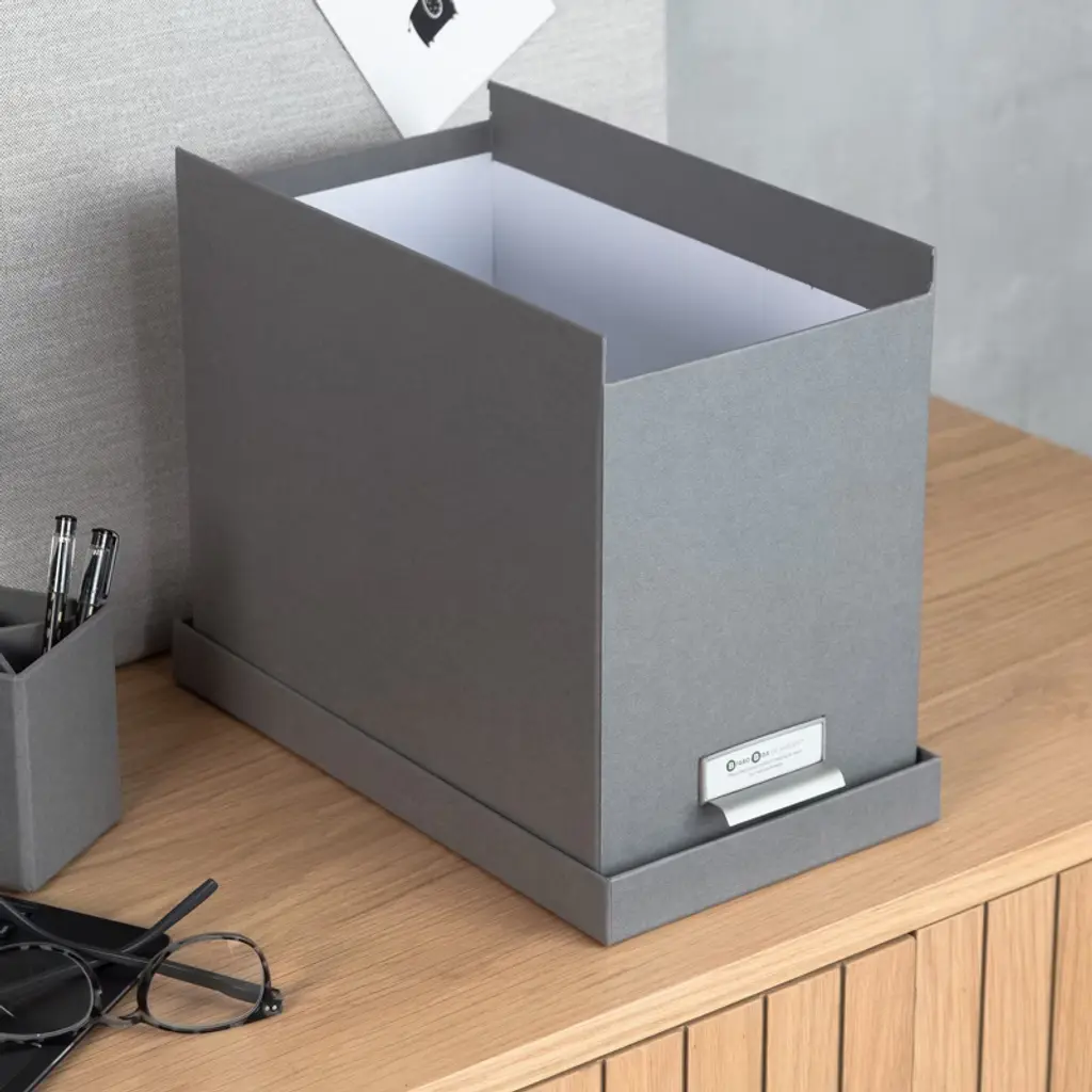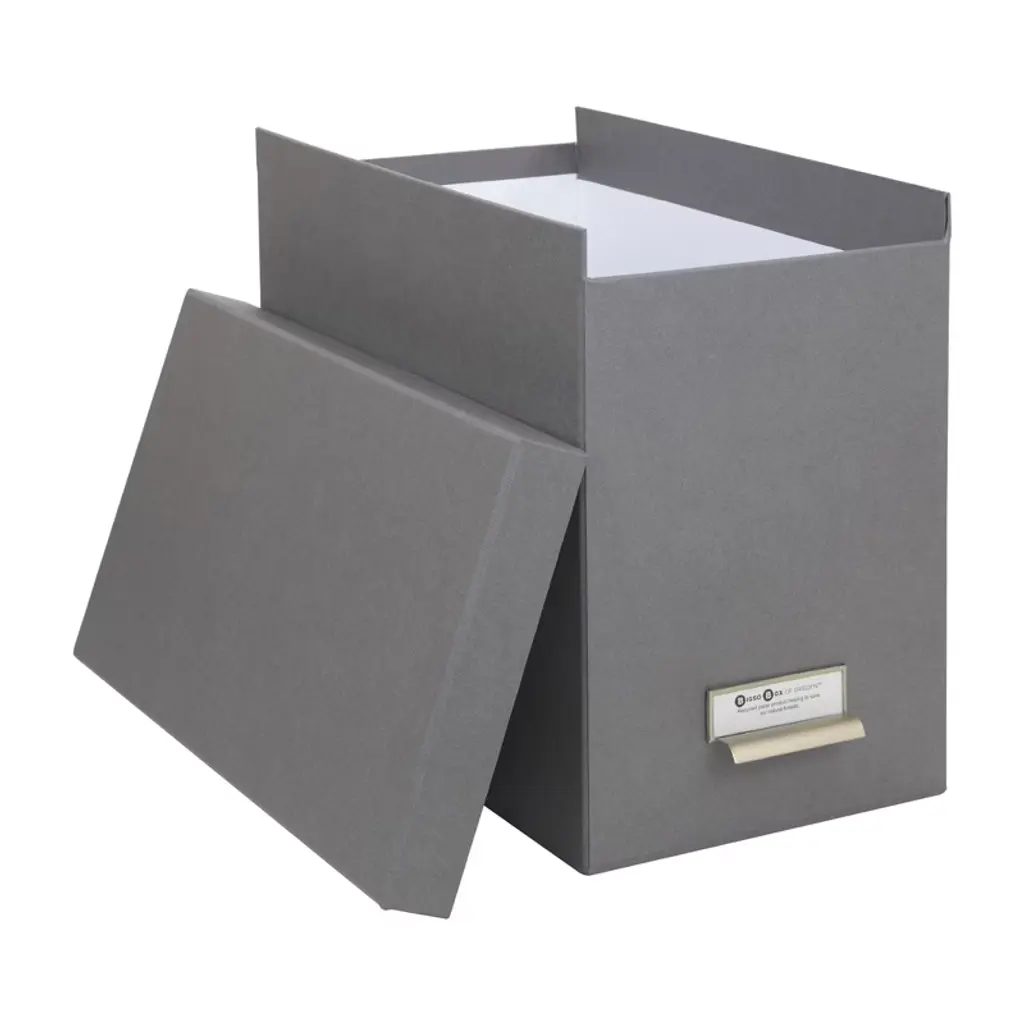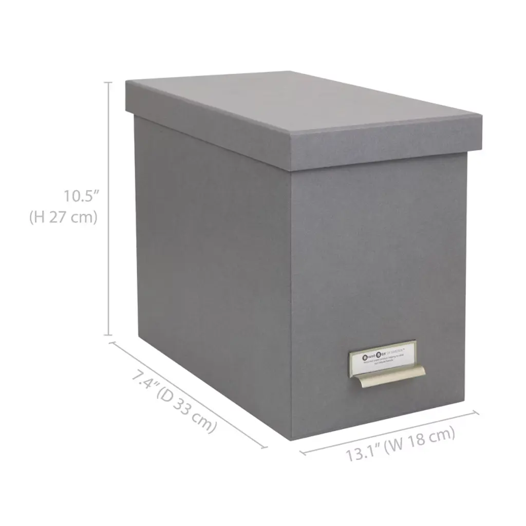 Bigso’s John Fiberboard Label Frame Desktop File Storage Box increases your efficiency by storing and sorting your important paperwork! It is an attractive decorative container which organizes your bills, recipes, product manuals and more. The 7.4 in x 13 in x 10.4 in size allows it to hold letter size papers while the lid hangs over the side of the box to accommodate letter size hanging files (not included). A metal label holder is included so you can write on the insert paper what is stored inside.