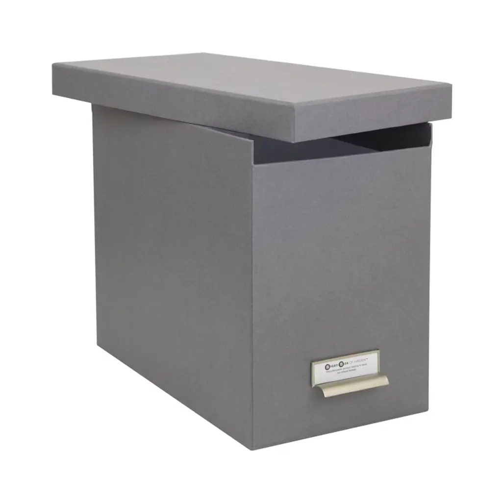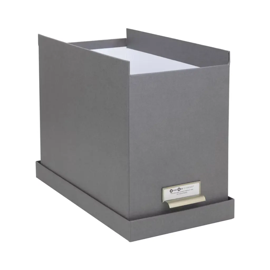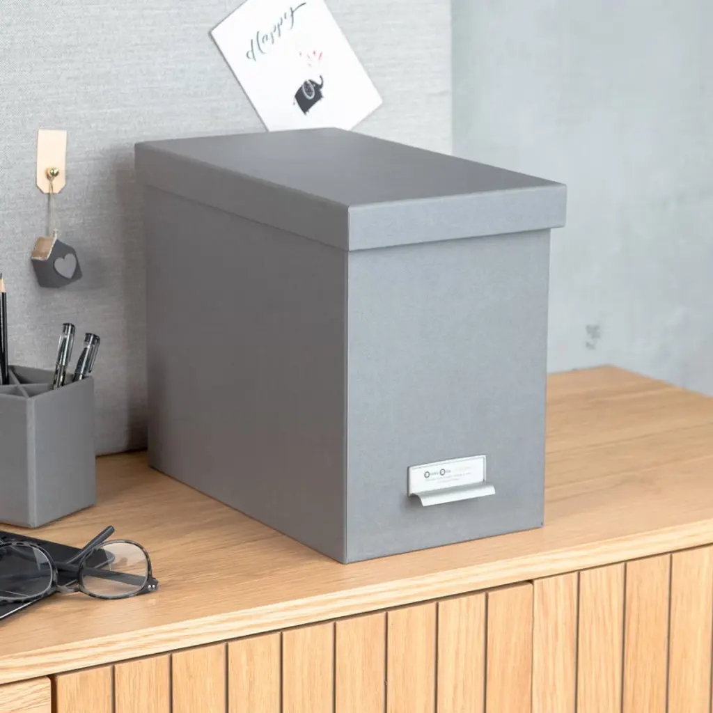Bigso’s John Fiberboard Label Frame Desktop File Storage Box increases your efficiency by storing and sorting your important paperwork! It is an attractive decorative container which organizes your bills, recipes, product manuals and more. The 7.4 in x 13 in x 10.4 in size allows it to hold letter size papers while the lid hangs over the side of the box to accommodate letter size hanging files (not included). A metal label holder is included so you can write on the insert paper what is stored inside.