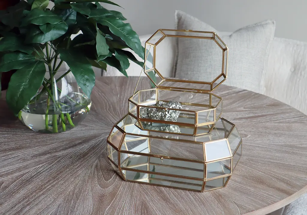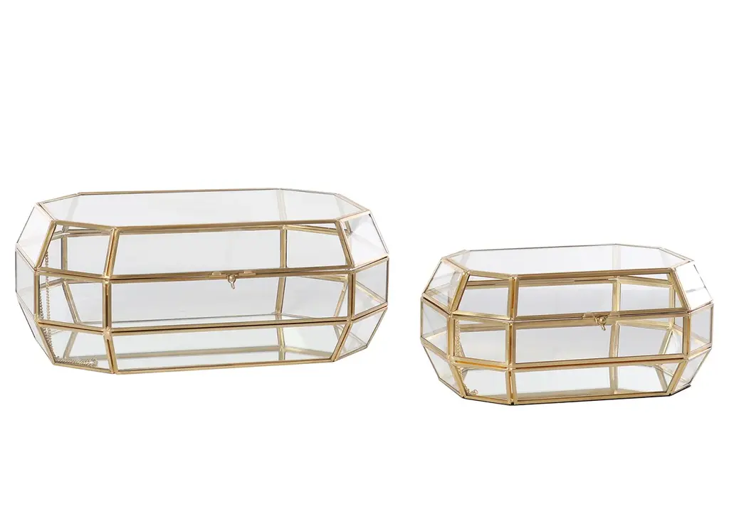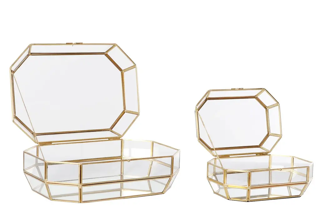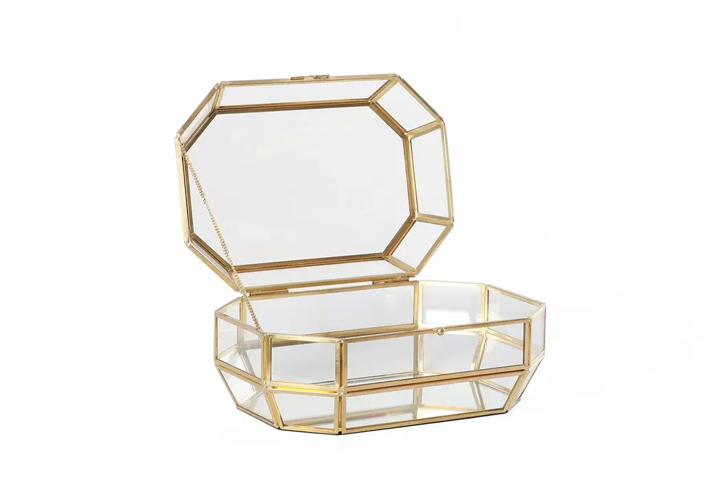 Final Sale The Bijou lends a simple elegance with its delicate, clear glass design accentuated with bright brass edging and a small matching clasp. Its subtle geometric form lends an additional touch of dimension. Available in two distinct sizes, pair together for an added look of luxury. Each size sold separately.