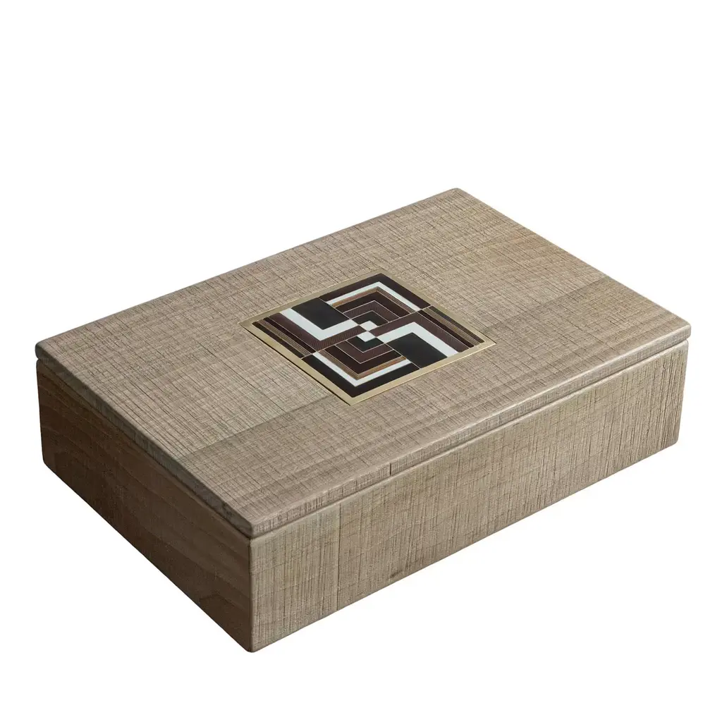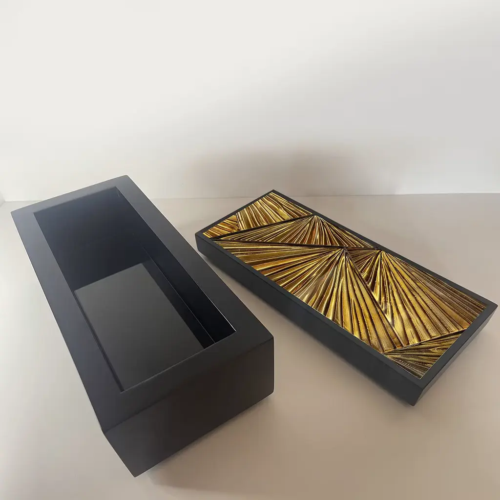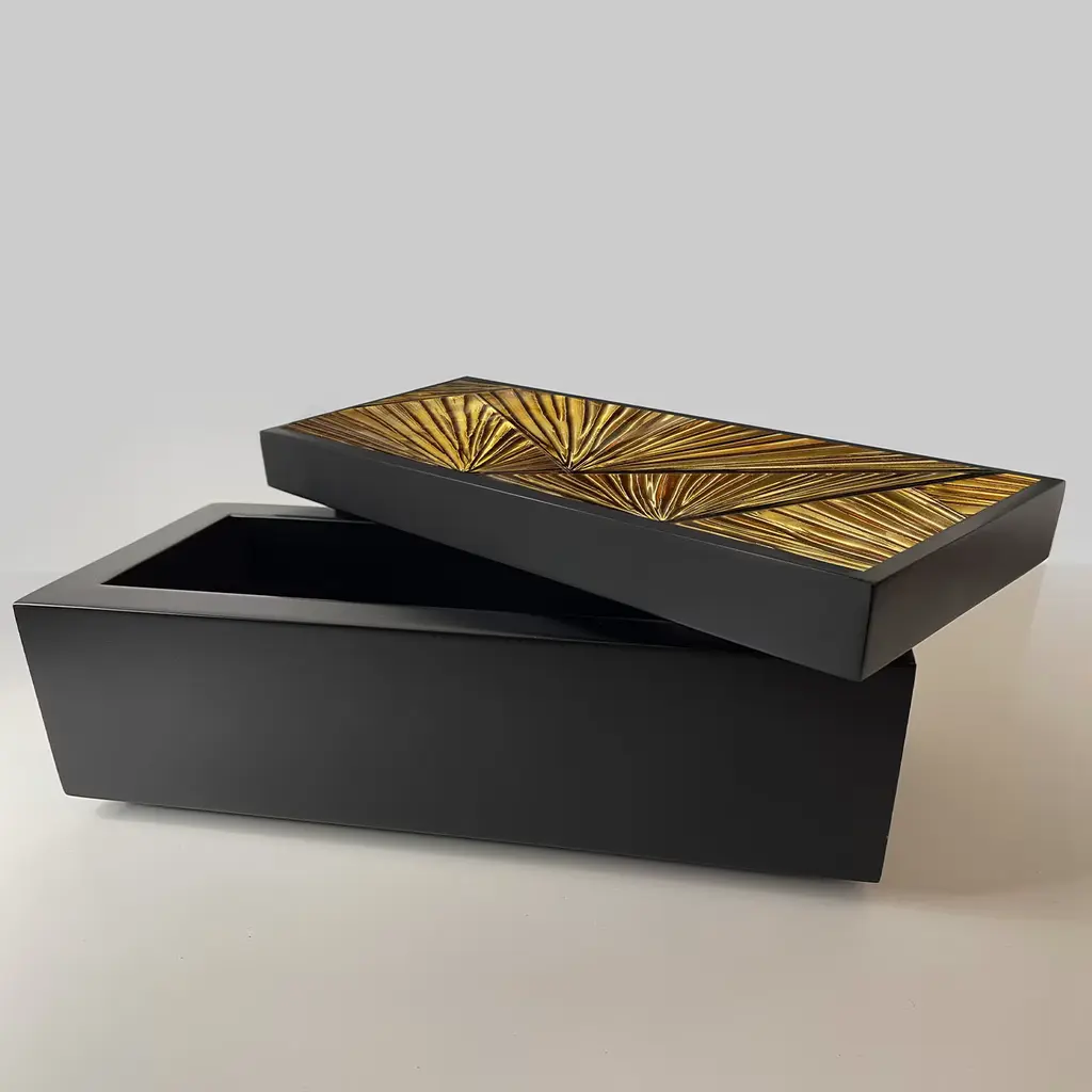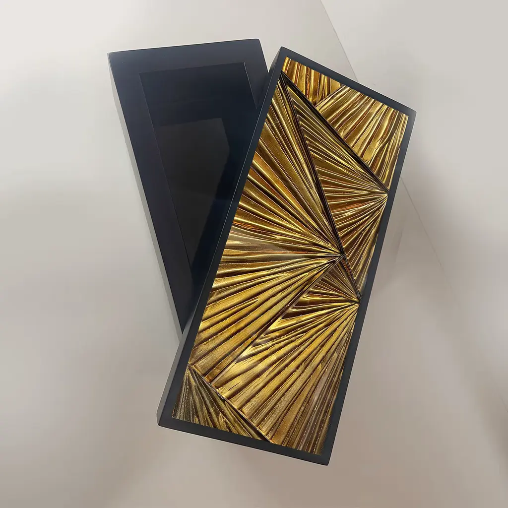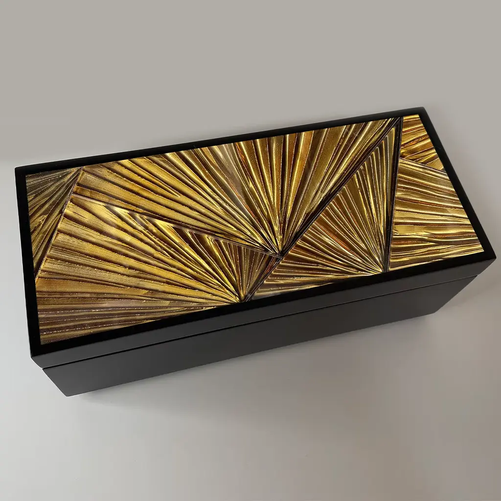 This box is the perfect synthesis of timeless style, innovative design and Italian craftsmanship excellence. It is entirely in wood with a matte black finish. The lid is embellished with carefully crafted glass with the utmost precision. The crystal has an amber color finish rich in gold reflections that highlight the various hand-made engravings. Every imperfection is to be considered a guarantee of naturalness and craftsmanship.