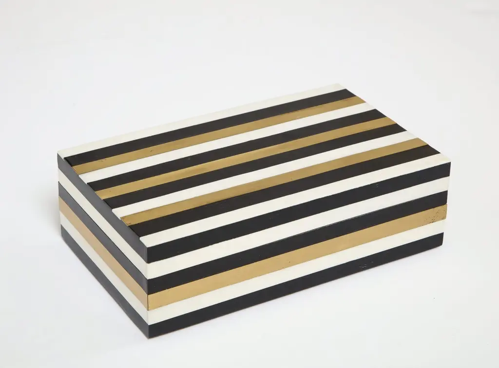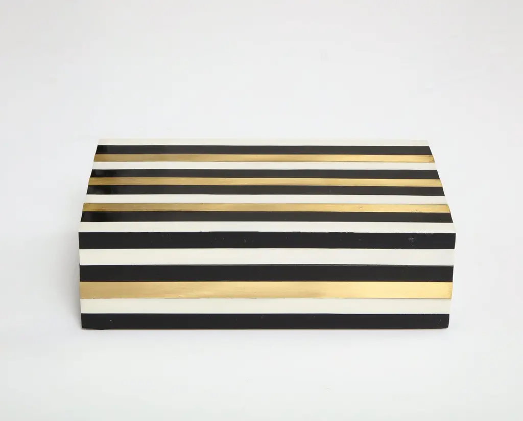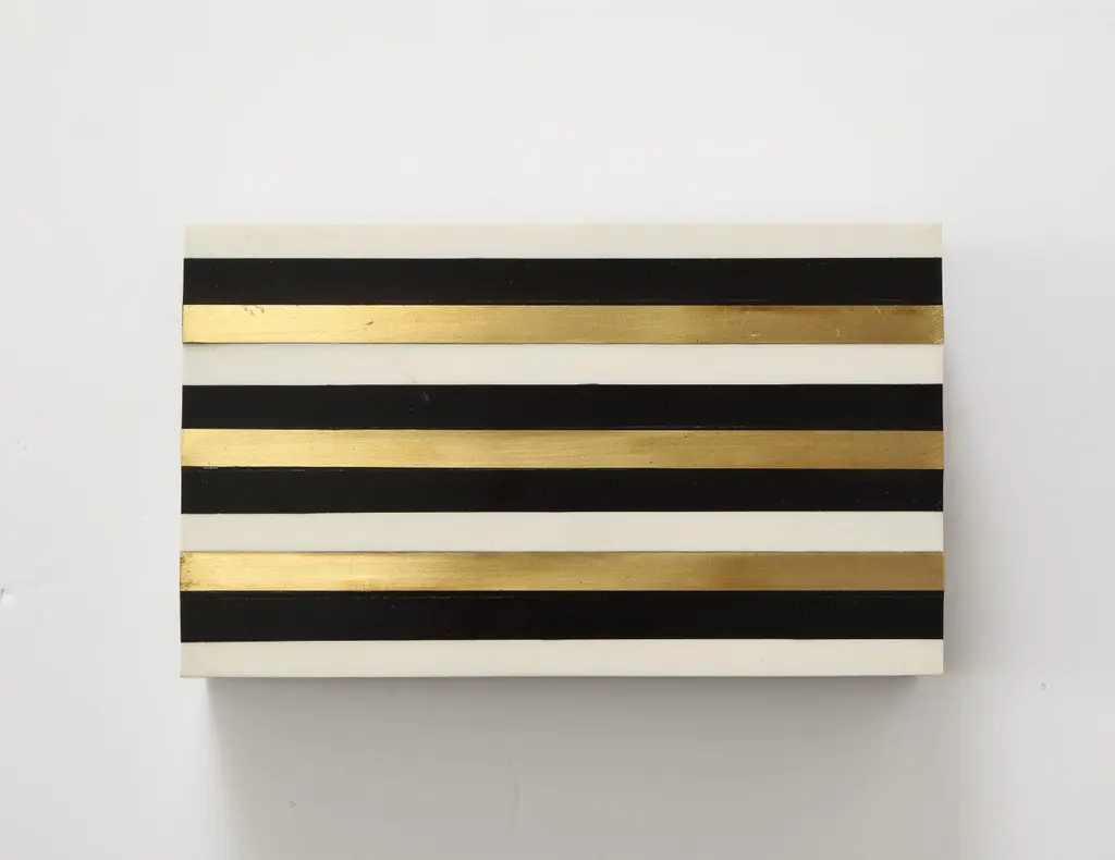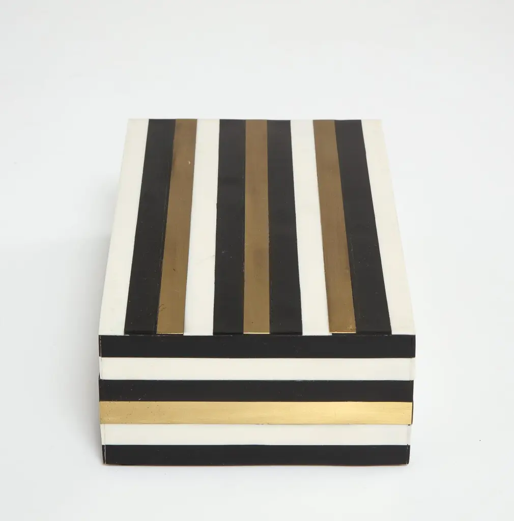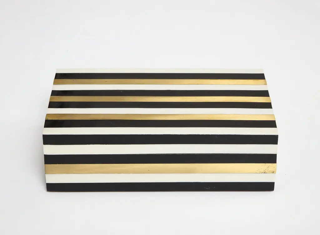 Modernist keepsake, document box clad in Black, White resin stripes accented with brass inlay stripes.