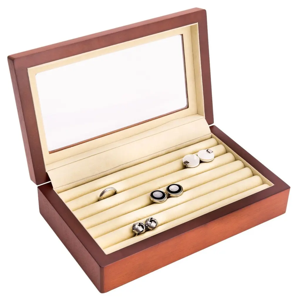 Black Ebony Polished Wood Box For 24 Cufflinks With Leather Detail