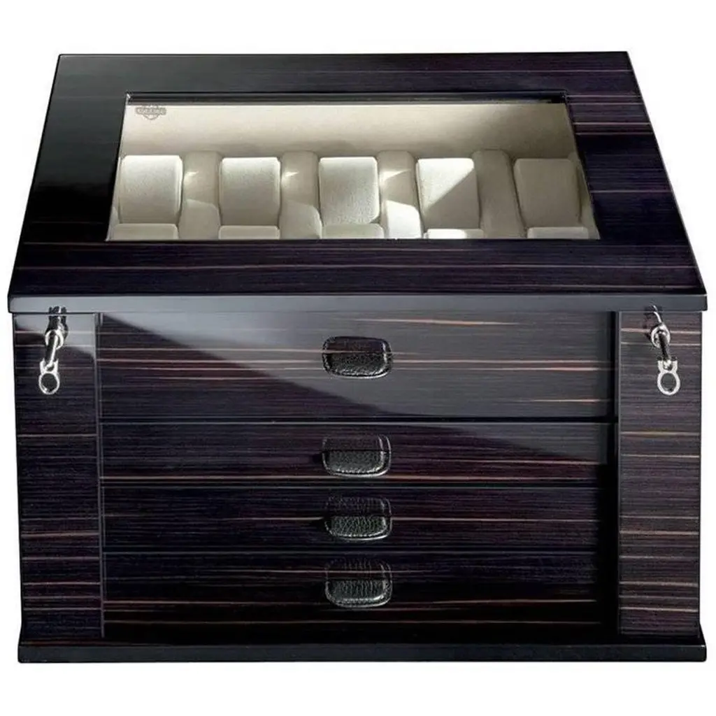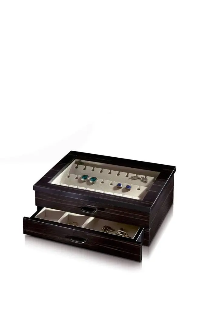 Box for 24 pairs of cufflinks in black polished wood with leather handles.