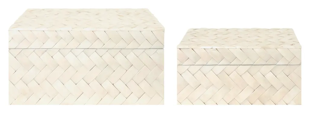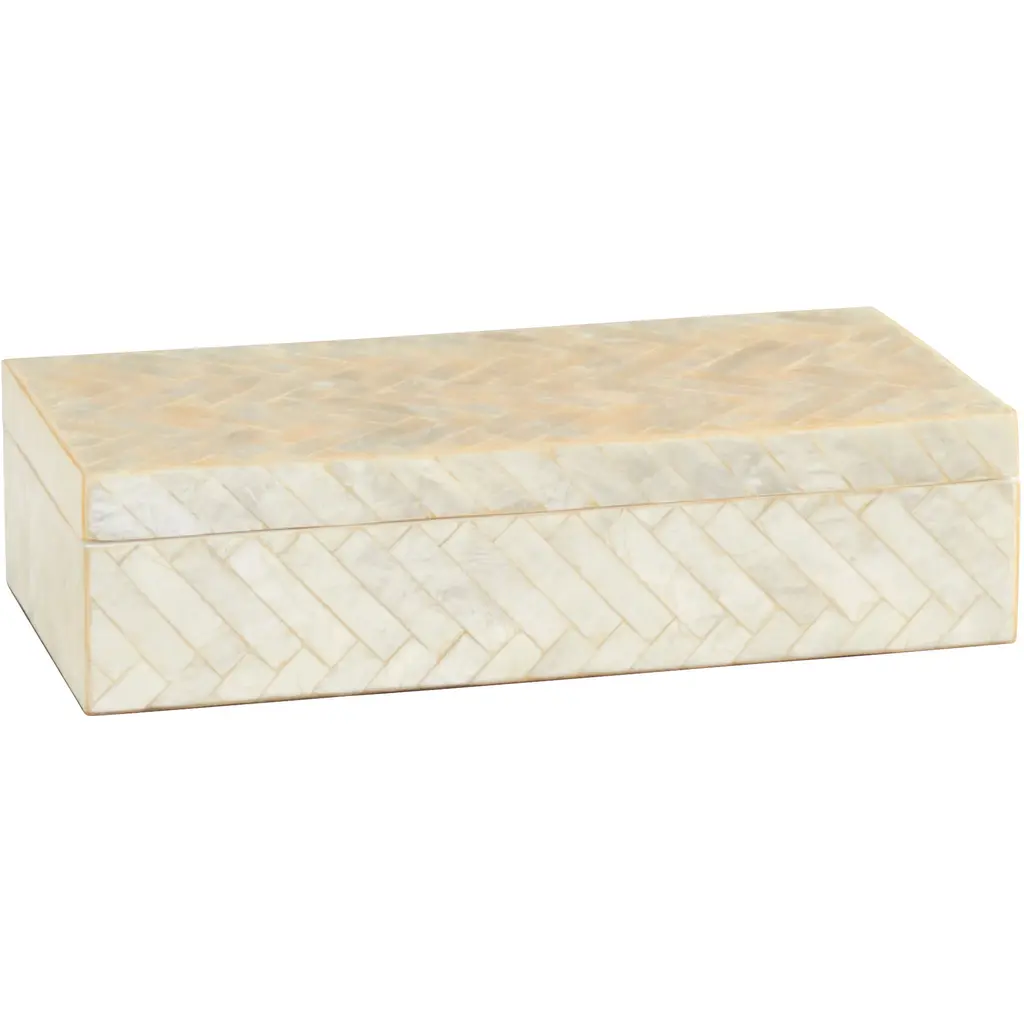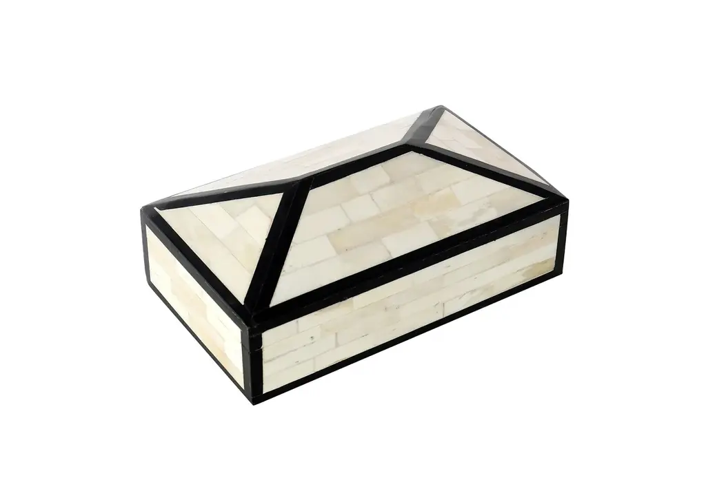 Final Sale This striking box lends visual texture with its deep black border and natural bone design. Its peaked lid provides an additional touch of dimension, for a look that is refined and elegant.