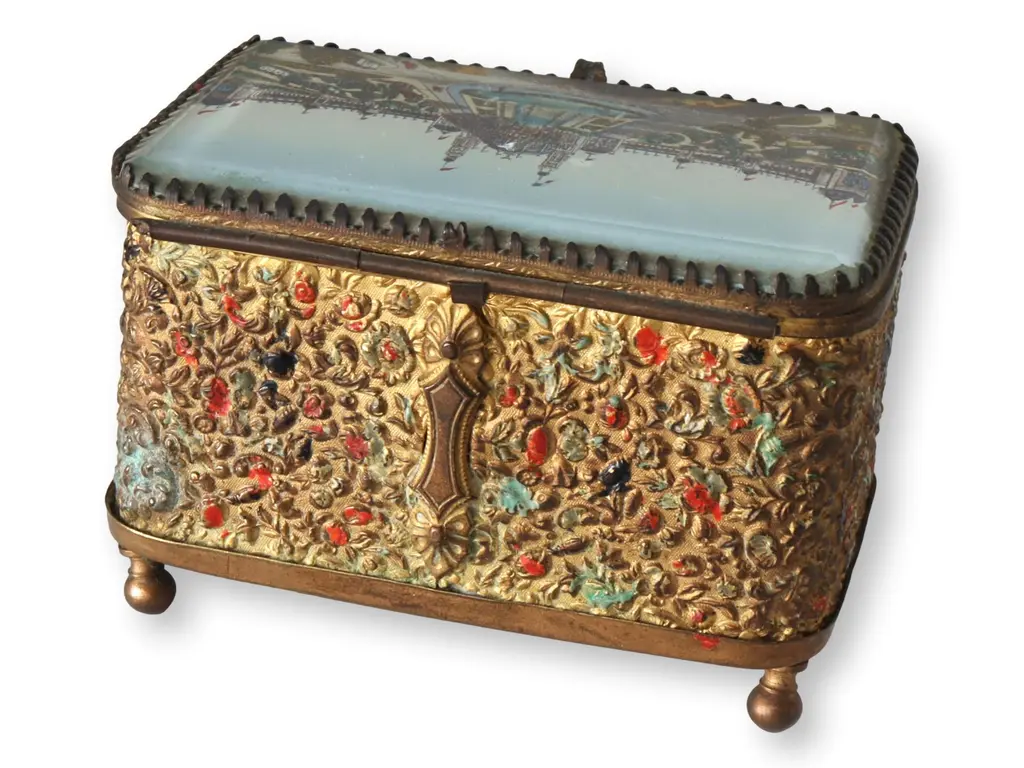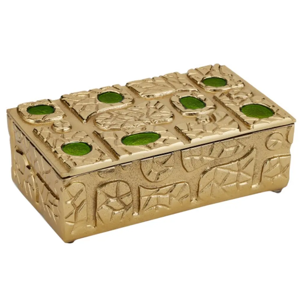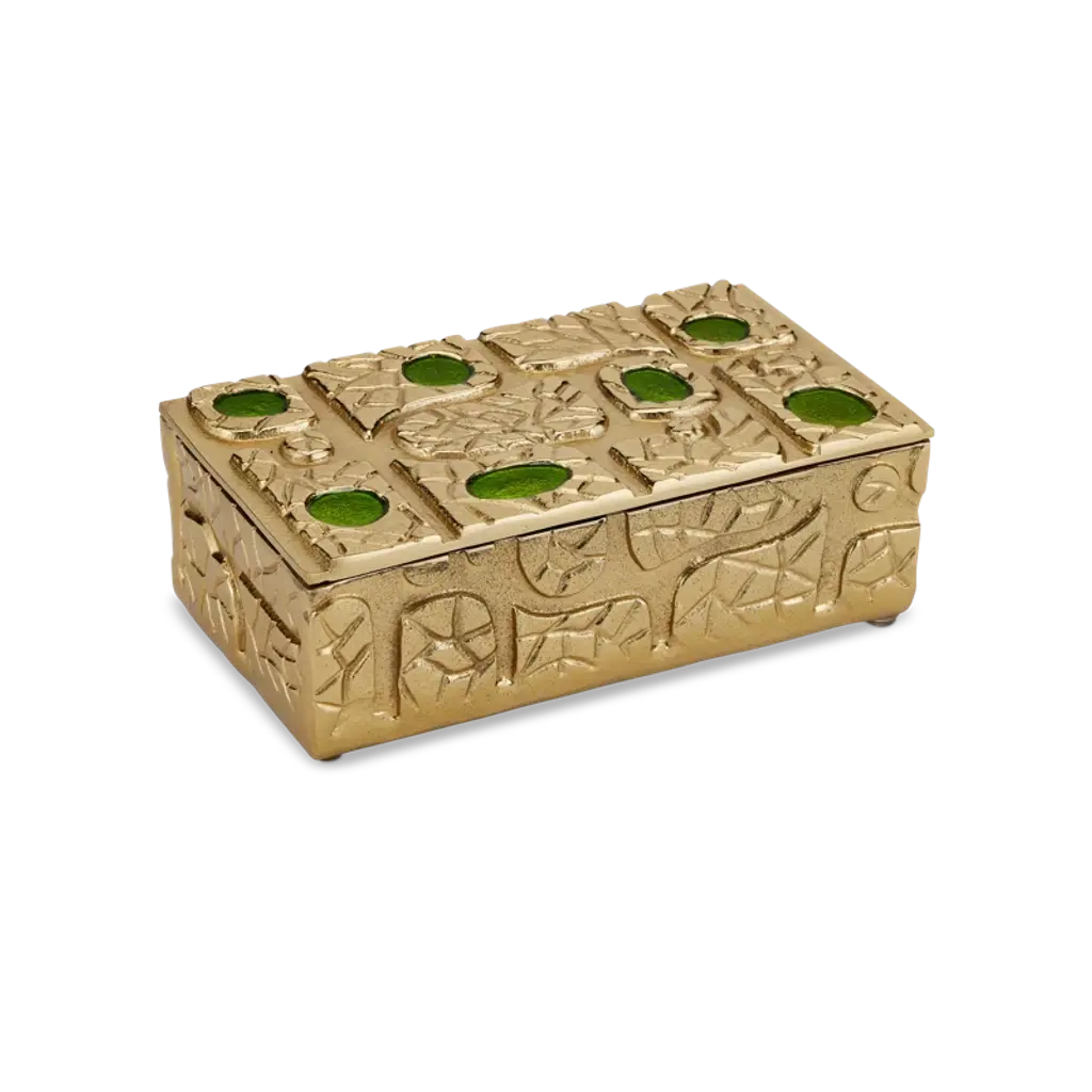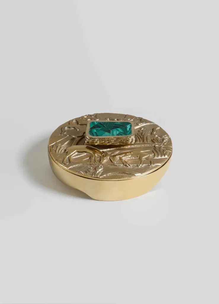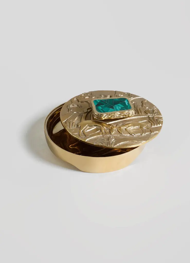 Blackbuck Round Trinket Box in Brass & Semi Precious Stone, Viya by Vikram GoyalIn "The Book of Dreams”, the 17th century Indian manuscript, a glimpse of the Blackbuck signifies an excellent omen, a harbinger of positivity, and good fortune. Believed to be a mythical animal of flight, this elusive creature embodies purity, piety and prosperity. Here, embossed blackbucks in various graceful poses leap across a forest scene, symbolising propitious blessings for the user.Trinket box in brass with semi precious inserts. Handmade in India.Product DetailsMaterial: BrassInlay: MalachiteSize: 5.5"DIA x 2"H 14 DIA x 5.1 H cmWeight: 1.06 kg 2.332 lbsNumber of Pieces: 1 Trinket BoxSKU: VBX201This product has been handcrafted by local artisans. As such, slight variations are a testament to the unique character of a piece made by hand.