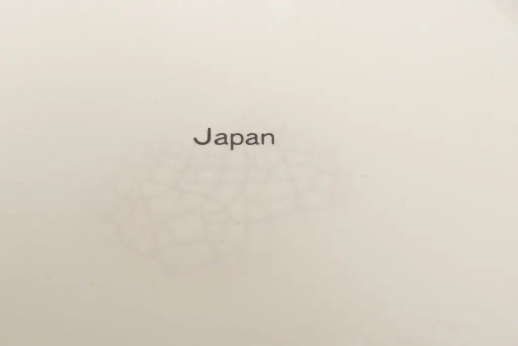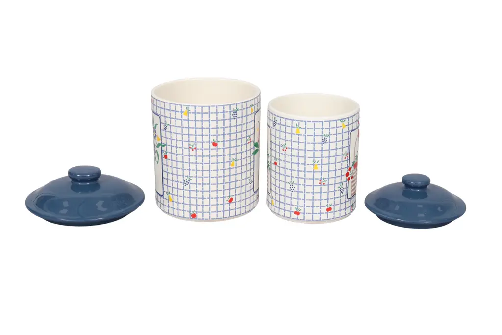 A set of two ceramic kitchen canisters in blue and white. Canisters are decorated with a stylized bouquet of flowers in a vase and fruit in a basket, set against a square trellis like background adorned with red, blue and yellow fruit. Blue lids lift off with knob handles. Marked Japan underneath. Canisters measure 6.5"W x 6.5"D x 8.75"H and 5.5"W x 5.5"D x 8"H.