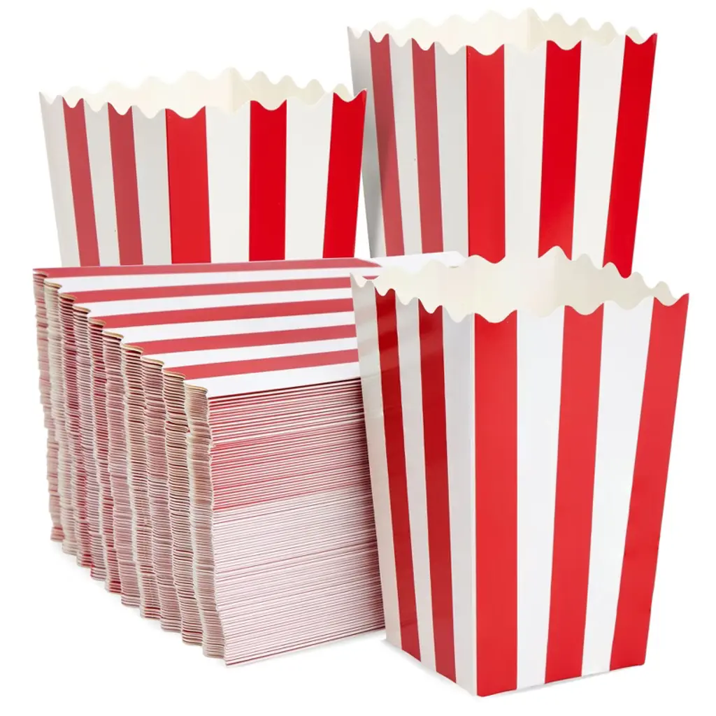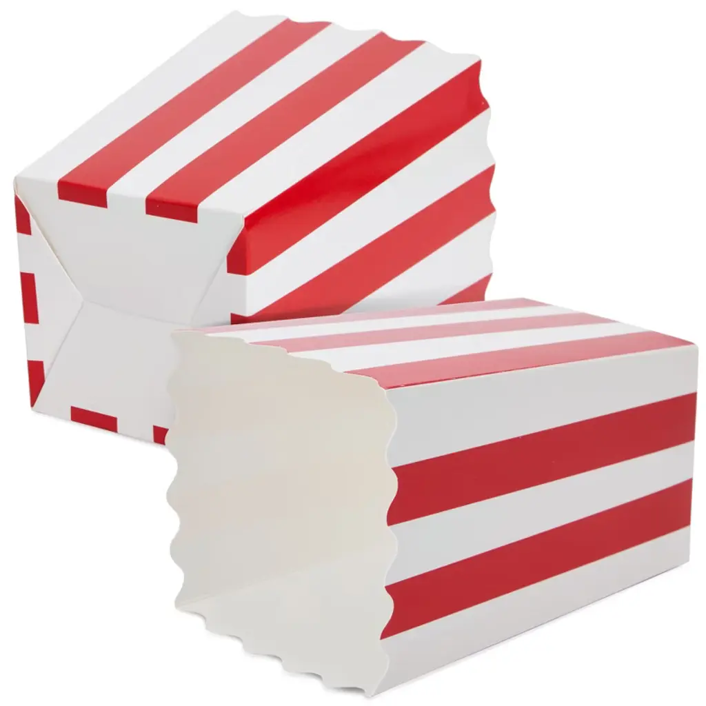 Get ready for the ultimate movie night experience with these red and white popcorn boxes, perfect for birthdays, first dates, and binge-watching your favorite TV series. Whether you're hosting a party or just enjoying a quiet night in, these popcorn favor boxes are just what you need to serve your favorite snacks. Each disposable popcorn box features an open-top design, allowing for easy access to both sweet and salty treats. The classic scalloped edges and bold red-and-white stripes bring a nostalgic movie theater feel to any occasion. Made of high-quality 230gsm paper, these paper popcorn boxes are sturdy enough to hold up to 20 ounces of popcorn, candy, or other party snacks. Expanding each box is simple—just push inside and pop the bottom out to create a fully assembled container. The package includes 100 popcorn treat boxes, each measuring 3.3 x 3.3 x 5.6 inches, making them ideal for carnivals, birthdays, baby showers, and themed events.