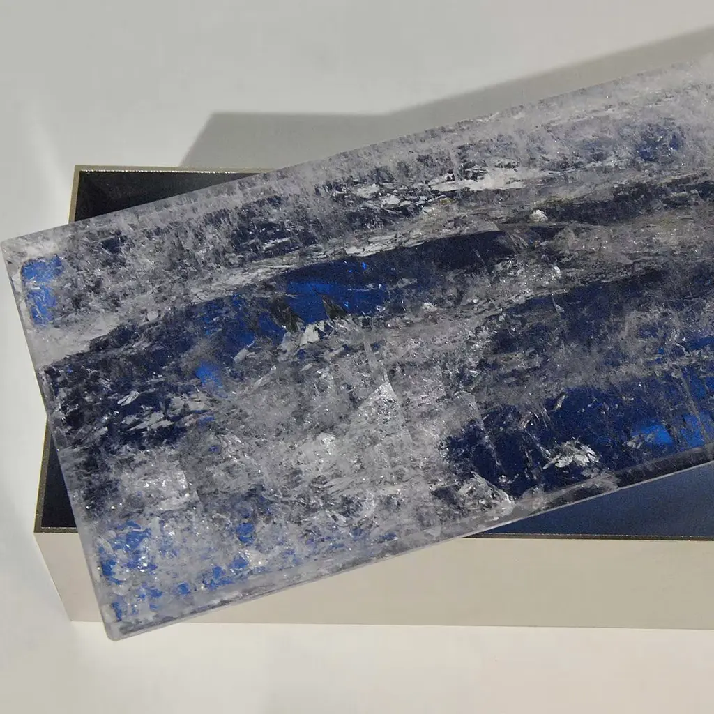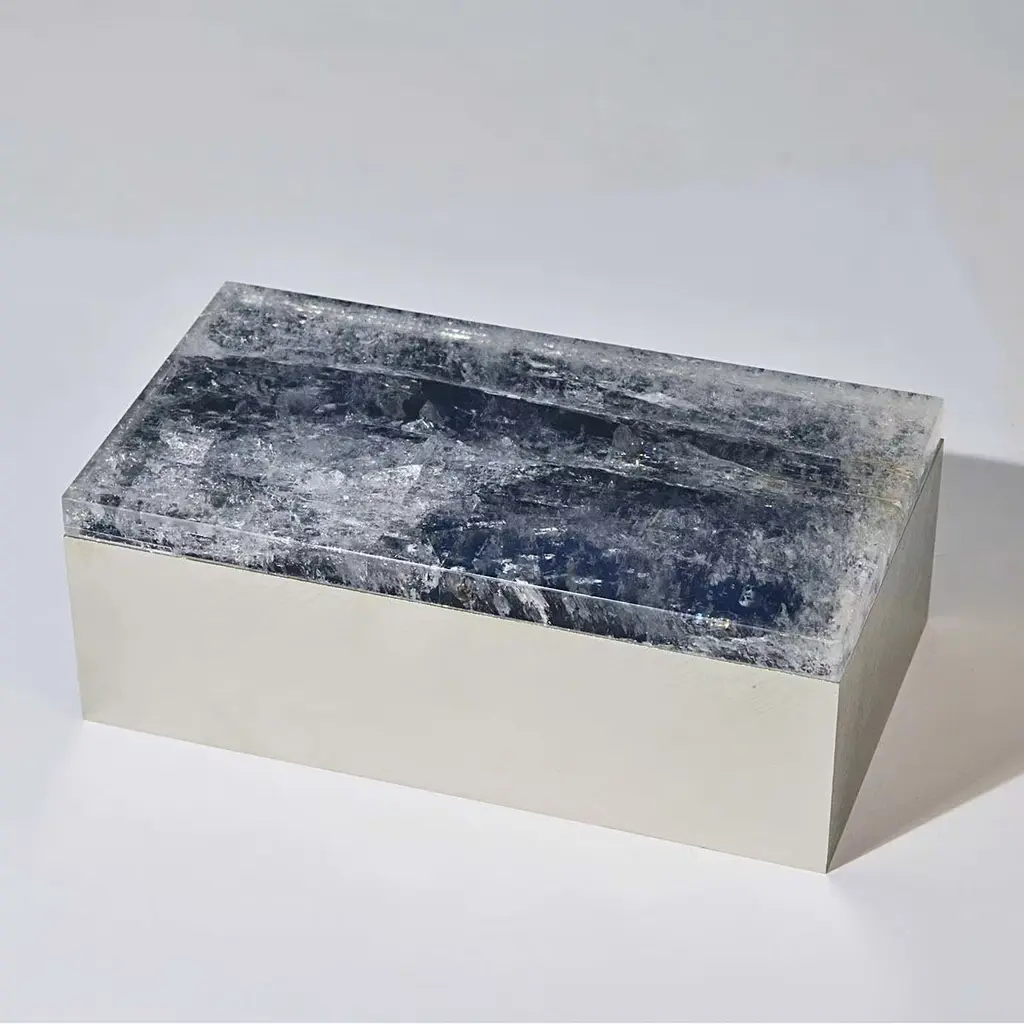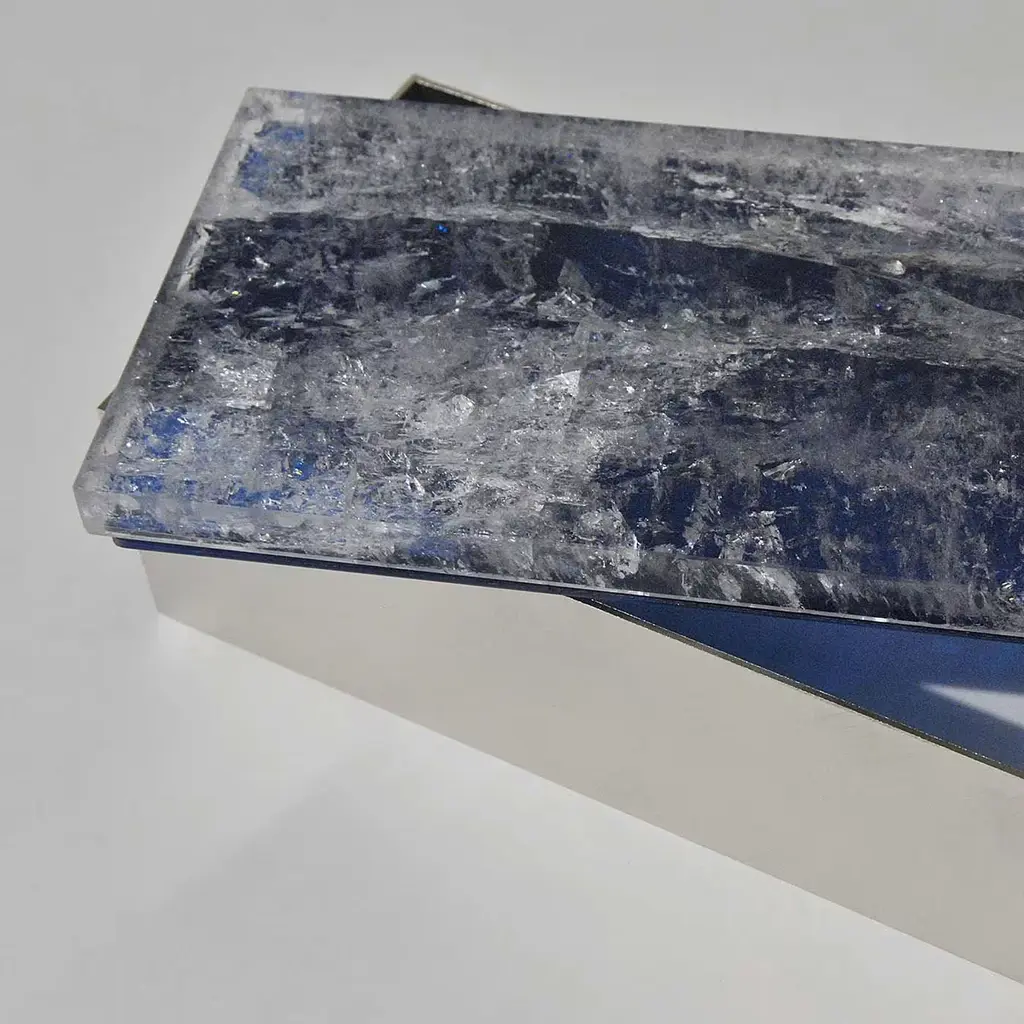As a gift or part of a personal collection, this exquisite box is a superb addition to any jewelry display. A stately lid in deep blue quartz rests atop a rectangular box fashioned of brushed nickel-plated brass. The smooth texture of the brass and the roughness of the mineral lid create a stunning visual contrast that adds textural depth to the composition. Arranged with other boxes from the Tincani collection, this piece will add a chic accent on a console or side table.