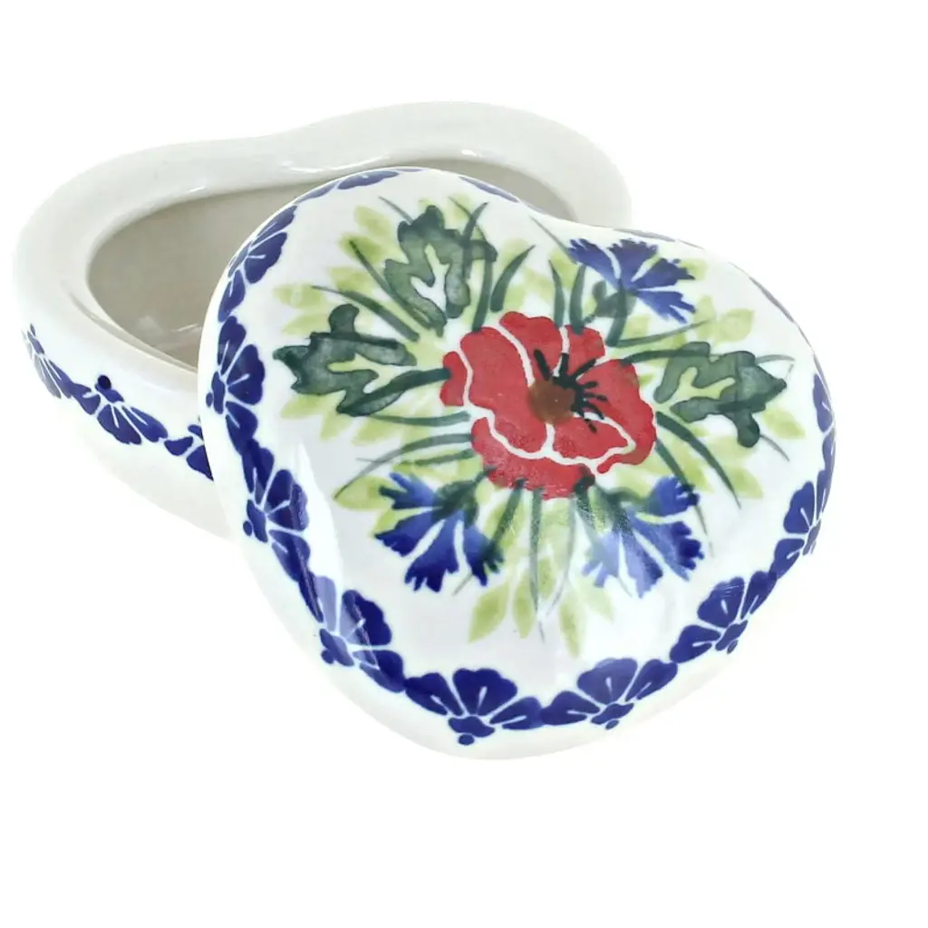 From WR Unikat - heart box for someone special - 3.5" x 3.5". Great Gift Idea!! The Art of Polish Pottery, as we know it today, started as local folk art centuries ago in the German province of Silesia. The first known pieces of “Bunzlauer” stoneware dating back to the 16th century were crafted by hand and decorated with a folk art stamping technique using potatoes. Original designs were inspired by the peacock feather using the colors of cobalt blue, sage green and ferrous red. These designs and colors are still the inspiration for modern day patterns.Today, skilled Polish artists still individually handcraft and hand decorate each piece using small sponges to stamp each pattern and color. After the process of mixing ingredients, molding the pottery, applying the decorations and glaze, the pottery is twice fired. This process makes the pottery extremely durable, it will not crack or chip easily, and it is perfect for use in the microwave, dishwasher, oven and freezer. Along with our pottery, we have sourced a range of absolutely beautiful hand blown glassware from Poland. It is the perfect addition to your Polish Pottery Collection!