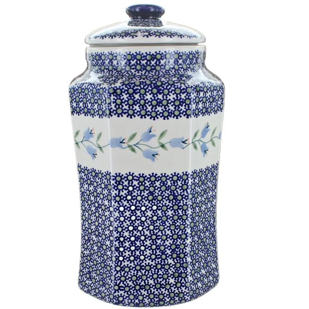 A Small Canister from Ceramika Artystyczna -SENSATIONAL FOR STORAGE – Use to Display, Organize Store All Kinds of Snacks Without Cluttering Your Kitchen! 7.75" tall, holds 4 cups. The Art of Polish Pottery, as we know it today, started as local folk art centuries ago in the German province of Silesia. The first known pieces of “Bunzlauer” stoneware dating back to the 16th century were crafted by hand and decorated with a folk art stamping technique using potatoes. Original designs were inspired by the peacock feather using the colors of cobalt blue, sage green and ferrous red. These designs and colors are still the inspiration for modern day patterns.Today, skilled Polish artists still individually handcraft and hand decorate each piece using small sponges to stamp each pattern and color. After the process of mixing ingredients, molding the pottery, applying the decorations and glaze, the pottery is twice fired. This process makes the pottery extremely durable, it will not crack or chip easily, and it is perfect for use in the microwave, dishwasher, oven and freezer. Along with our pottery, we have sourced a range of absolutely beautiful hand blown glassware from Poland. It is the perfect addition to your Polish Pottery Collection!