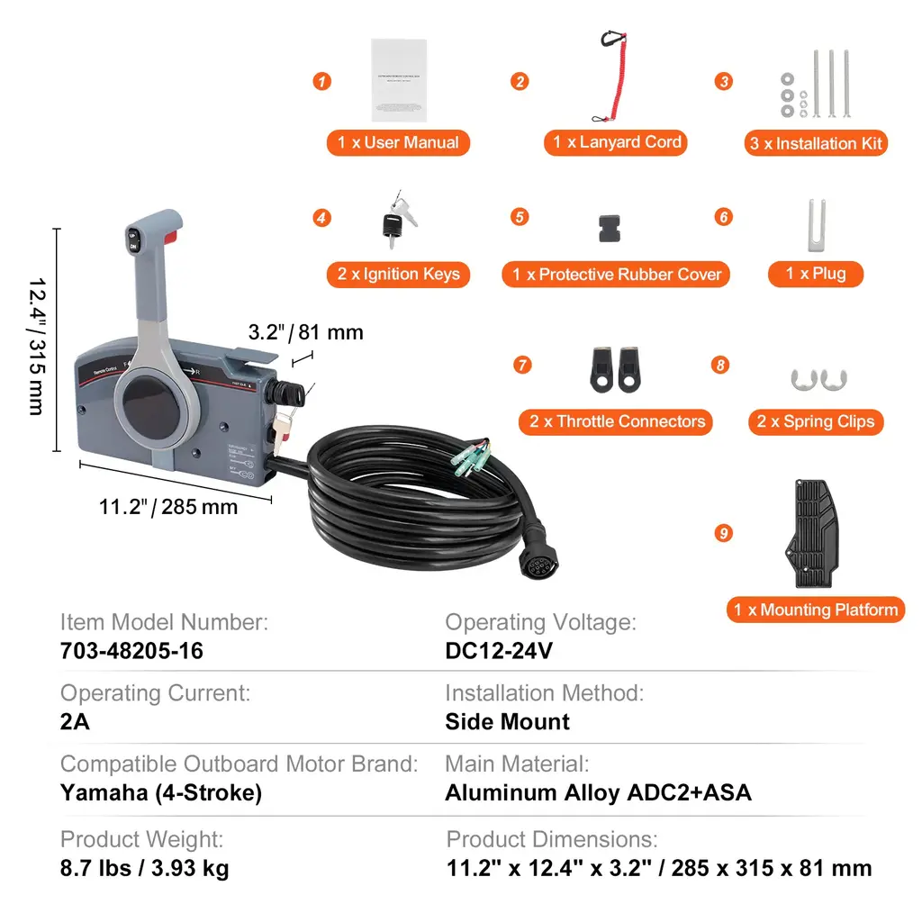 Boat Throttle Control: Our side-mounted outboard remote control kit is compatible with Yamaha outboard motors (4 strokes). It's made from aluminum ADC2+ASA and an ABS shell handle that resists cracking. The plastic button ensures firm and reliable operation. The Yamaha boat throttle control box is more robust and withstands multiple push-pull maneuvers. Smooth Operation: Press the neutral release button to shift into gear, Push forward about 32° into forward gear, and push back about 32° into reverse gear. The front-end friction adjustment adjuster provides personalized control over throttle operation, allowing you to manage speed and thrust with precision. Additionally, the boat throttle control has a cold start air-oil ratio adjustment function that ensures reliable operation in extreme temperatures. Trim and Tilt Switch: Enhance your boating experience with the power trim and tilt switch directly on the control lever handle. This design allows for easy adjustment of the stern engine's position, aiding in cargo loading/unloading and preventing prolonged engine immersion. Press "UP" to tilt the engine upward and "DN" to tilt the engine downward. Emergency Stop Switch Lanyard: Our outboard engine throttle control box includes an emergency stop switch lanyard. This lanyard halts the engine automatically if the driver is unexpectedly displaced, preventing accidents. The lanyard can securely attach to the driver's waistband or wrist for added security. 16.6 ft Control Cable: Our remote control box has a 16.6 ft/1.3 ft long harness with an 10/14/3-pin plug. And a 13.8"/9.4" cable with a 4-pin connector for the meter connection, ensuring ample reach for remote power supply setups. Crafted from durable thermoplastic material, these harnesses are built to last. During installation, turn off the ignition, remove the key, and disconnect all cables and power. Package Content 1 x Outboard Remote Control 2 x Ignition Keys 1 x Lanyard Cord 3 x Installation Kit (M6*90 mm Installation Screws + Lock Nuts + Washers) 1 x Protective Rubber Cover 1 x Plug 2 x Throttle Connectors 2 x Spring Clips 1 x Mounting Platform 1 x User Manual (1 x Outboard Remote Control 2 x Ignition Keys 1 x Lanyard Cord 11 x Cable Ties 3 x Installation Kit (M6*110 mm Installation Screws + Lock Nuts + Washers) 1 x Mounting Platform 1 x User Manual)for 9.4" option