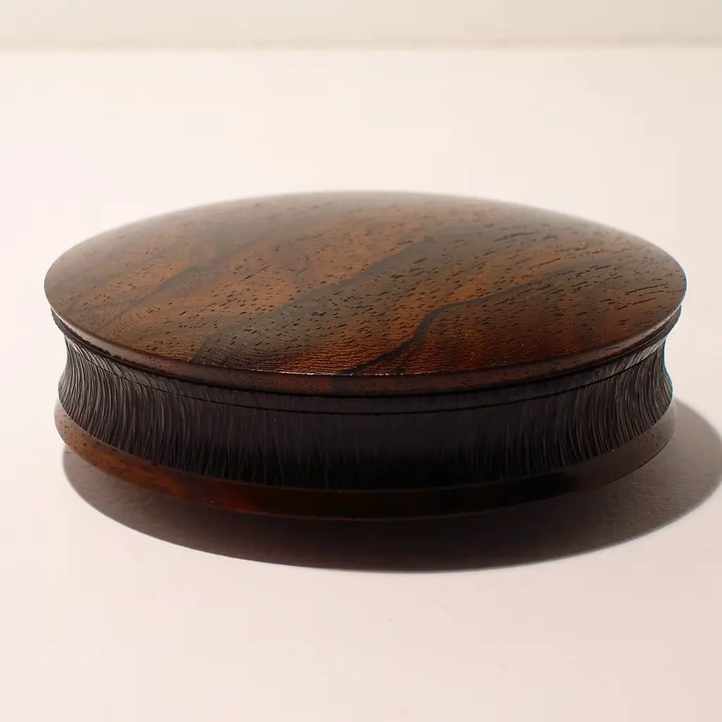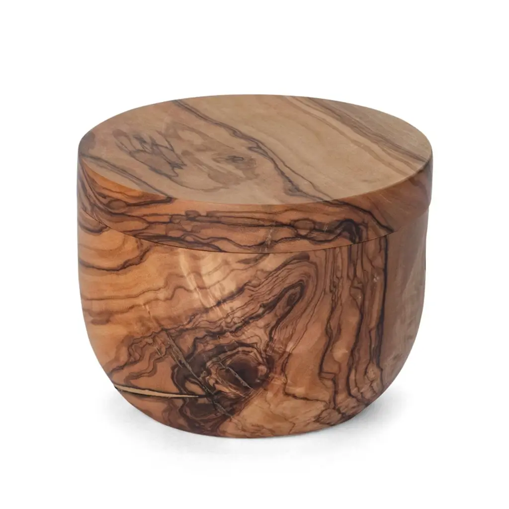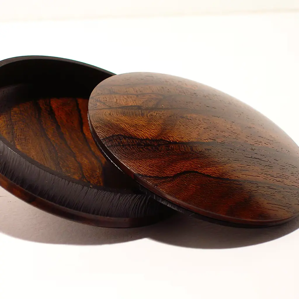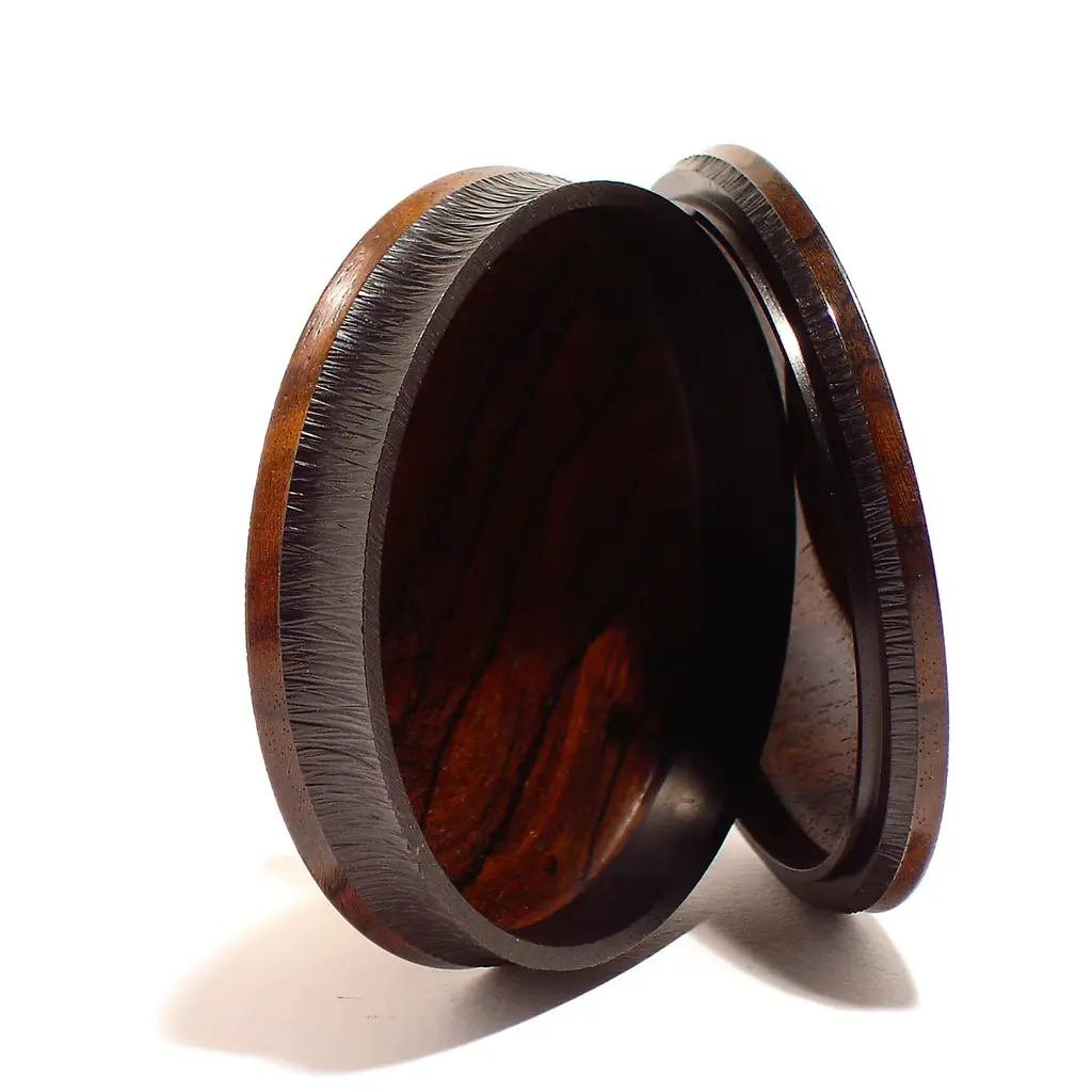 This refined box of the Bombè Collection showcases a simple design that lets the luxurious woods stand out with their distinctive colors and textures. The two parts that compose it are crafted on a lathe with a rounded shape made of Ziricote wood distinctive for its reddish brown color with irregular black streaks. Joined by a central section of Camerun ebony, this exquisite object is finished with a protective coating of wax and oil that enhances the prized woods' grains.