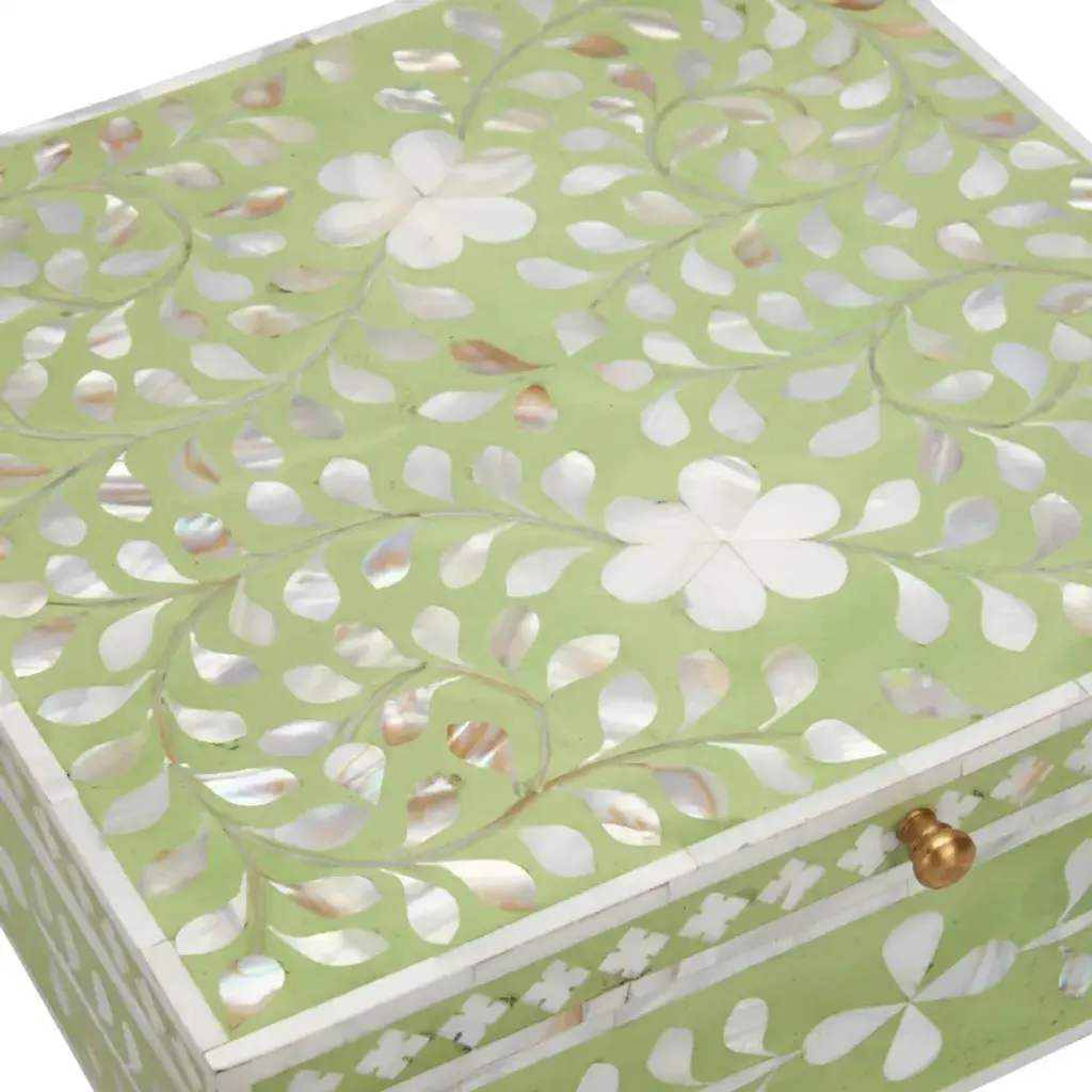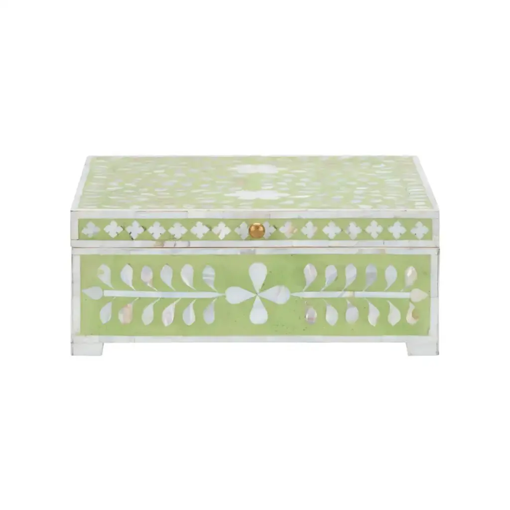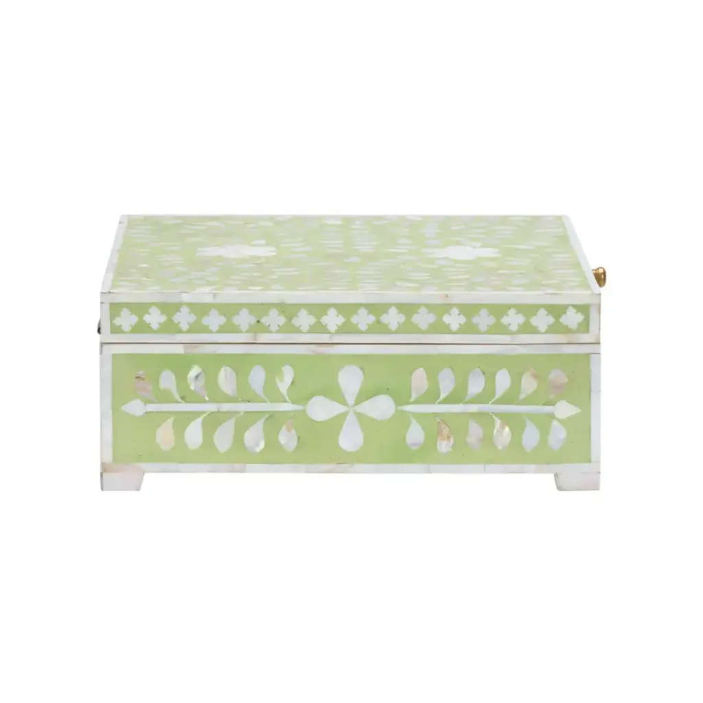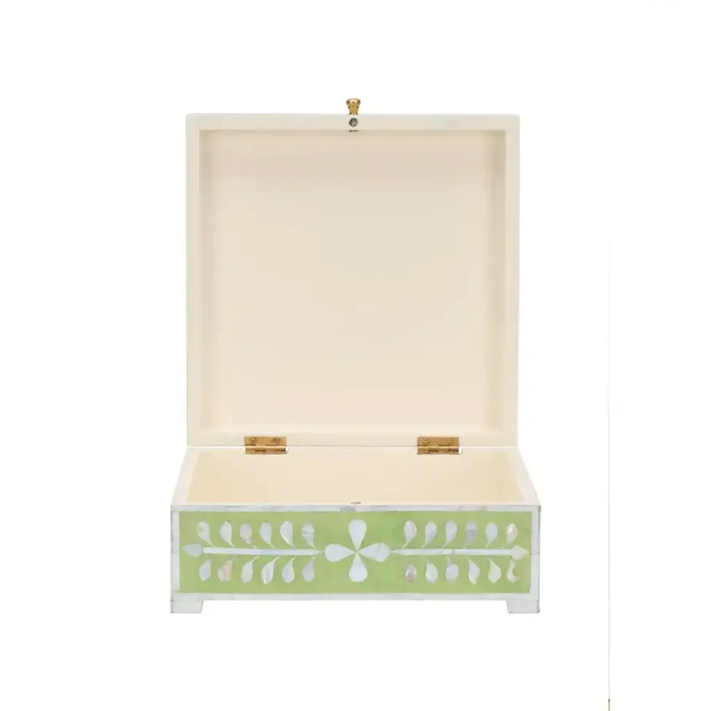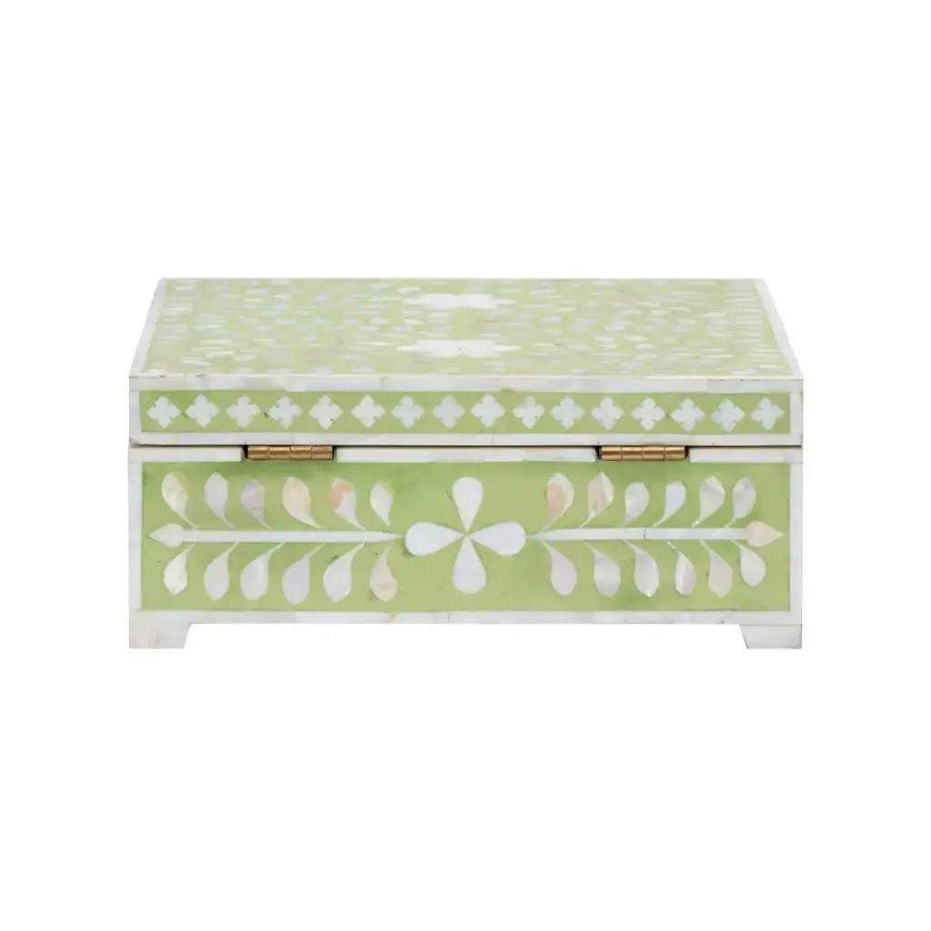Beautifully crafted, this green bone inlay box features a delicate white motif and hinged lid, adding timeless elegance to your decor.