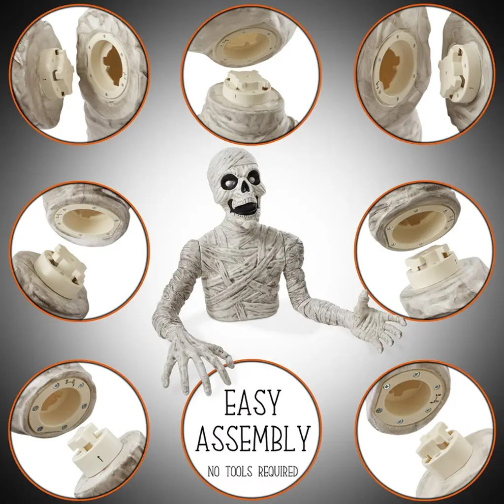 Designed with meticulous attention to detail, this groundbreaking Mummy features a lifelike appearance through realistic textures, skeleton-like limbs, defined anatomy, and intricately crafted facial expressions that capture the essence of fright. It stands out in any Halloween setting, drawing attention and adding realism to your décor. Constructed from high-quality, weather-resistant materials, it withstands rain, wind, and sun while maintaining its structural integrity and visual appeal year after year. Despite its impressive design, assembly is easy with pieces that snap together effortlessly and clear instructions, allowing you to quickly set up and enjoy the spooky ambiance it creates. Prepare for a fright-tastic addition to your Halloween décor with Boo Box!