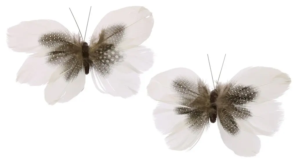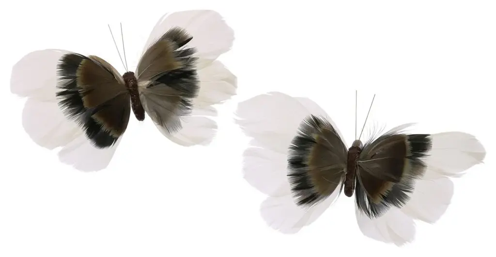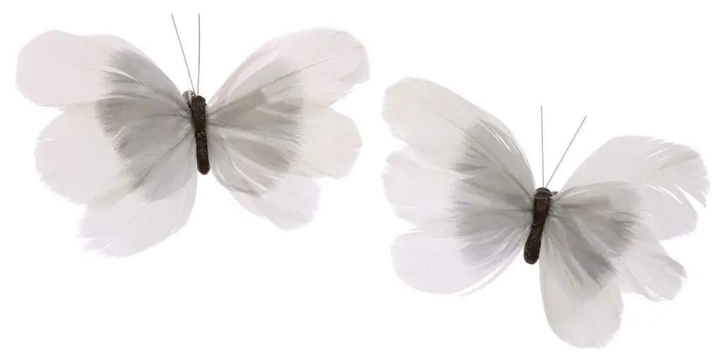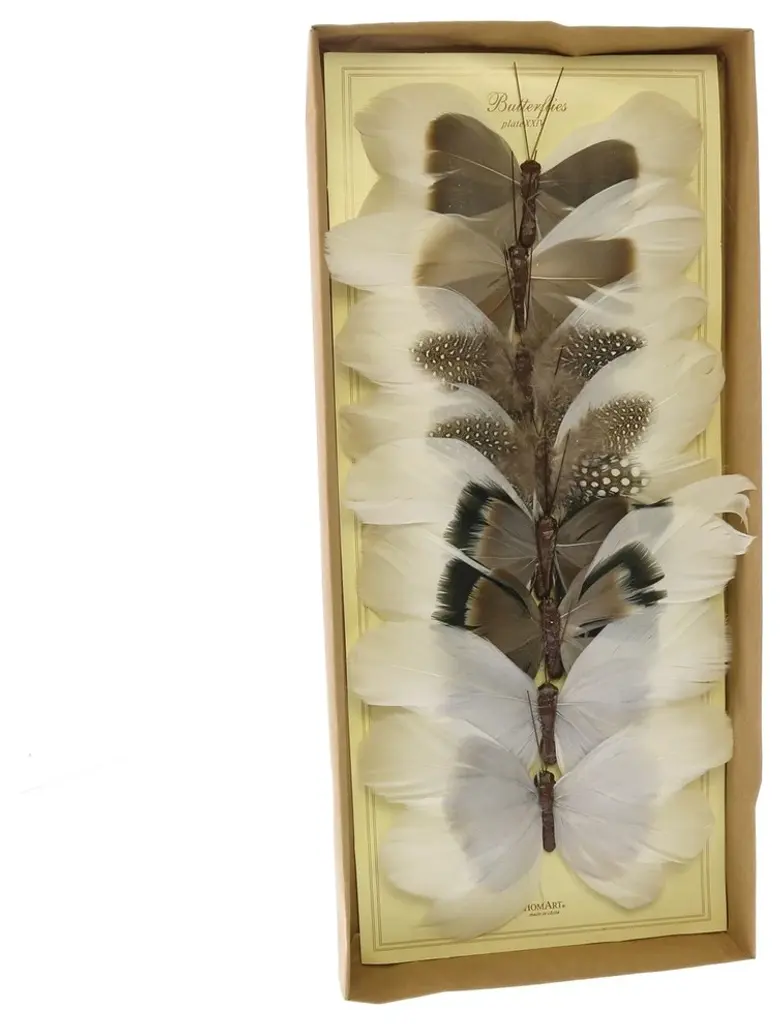 An assortment of eight butterflies made of soft and delicate natural feathers each featuring a discreet clip. A unique addition to floral arrangements, place settings, gift-wrap or home decor!• Box is 6" x 4" x 0.75"H.• Butterflies are handcrafted from natural feathers• Each butterfly is approx. 4.5" wide.• Heirloom Quality - Expertly hand crafted and hand finished. Due to the hand crafted nature of this piece, each piece may have subtle differences.