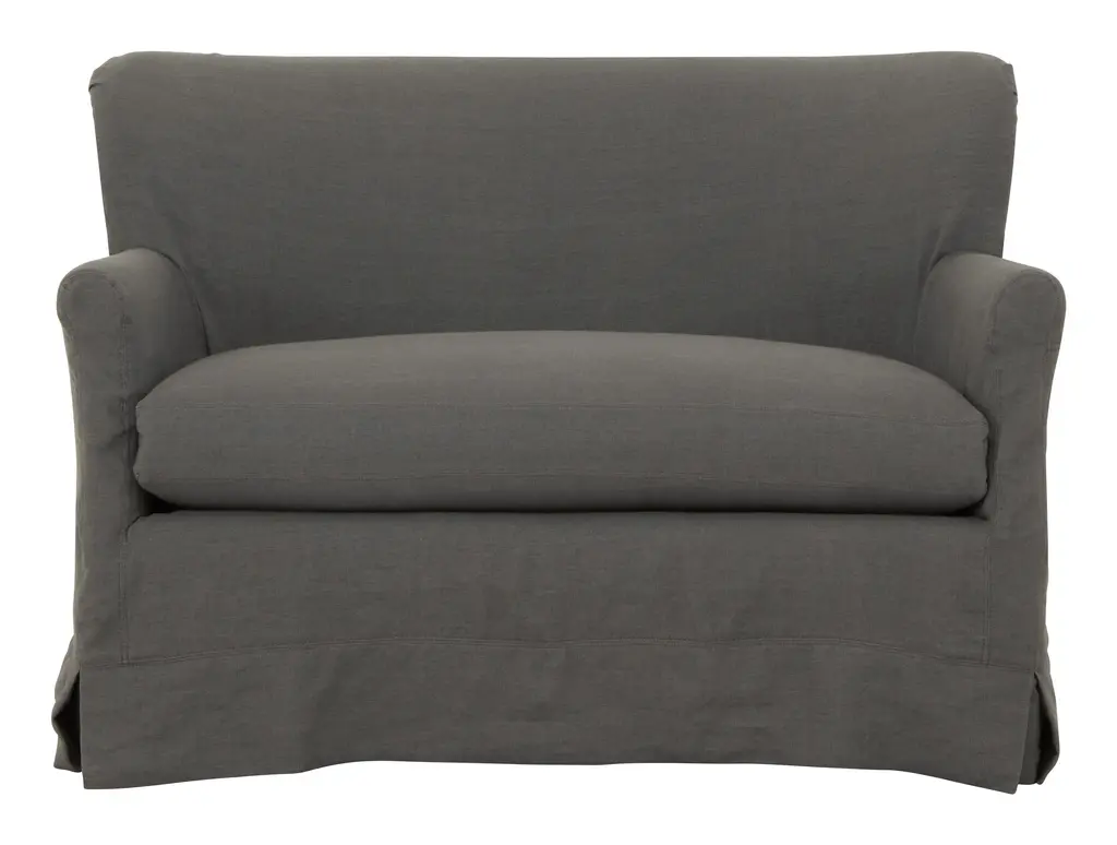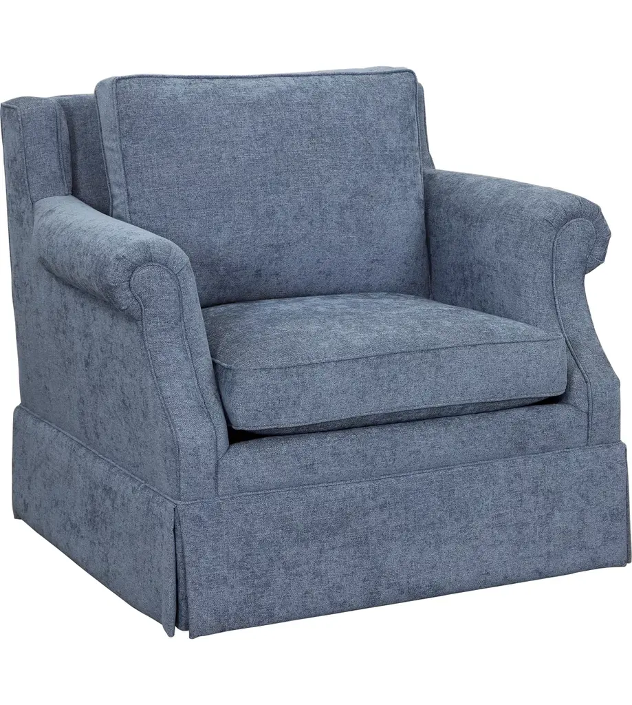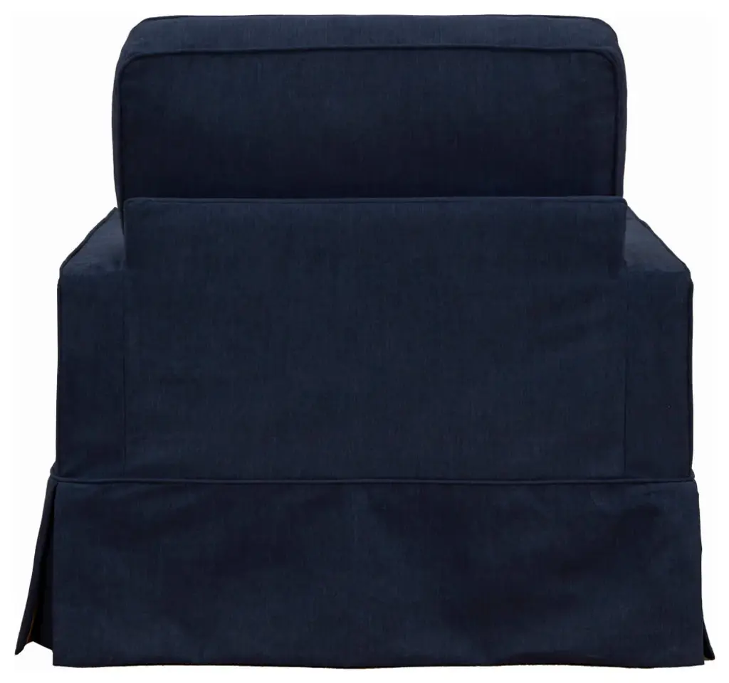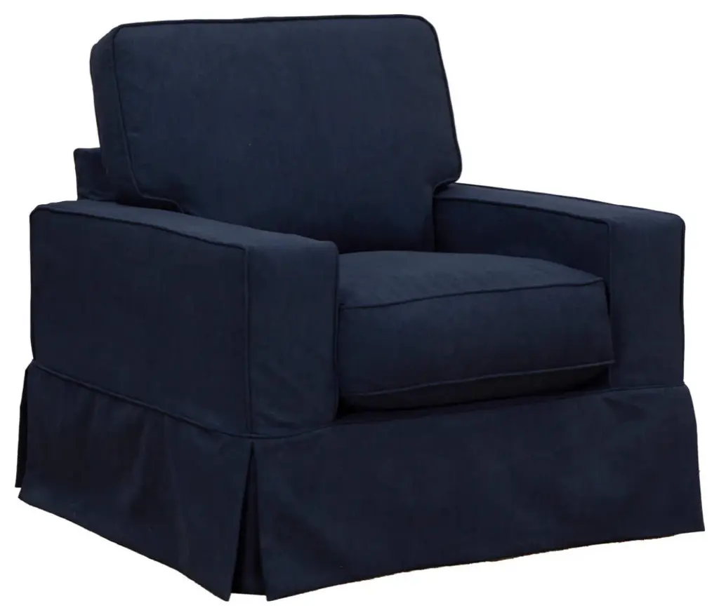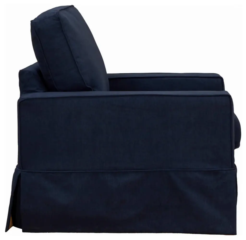 Sunset Trading Americana Box Cushion Slipcovered Chair | Stain Resistant Performance Fabric | Navy BlueNo need to wait for a luxury vacation, upgrade up your seat from coach to first class. Should your daily activities hit a bump, Sunset Tradings Americana Slipcovered Furniture Collection is the best living room seating for your kids to play and your pets to jump. All your living room ideas are possible, track arms complement your contemporary loft or industrial inspired space while slipcovers fashion a breezy beach-chic home base. Designed for todays lifestyle with just the right touch of tranquility and elegance, all Sunset Tradings Slipcover Upholstery pieces contain feather down cushions and 8-way hand tied spring construction, features which our competitors charge upgrade fees for. Slip covers and coordinating pillow covers, with multiple fabric options, can be easily removed from all pieces for cleaning. Be confident with your investment, knowing we are a solid company, located in the Northeast United States for over 25 years, your replacement and additional slipcovers will be available anytime. It has never been easier to personalize and revive your living space, creating a haven of comfort and style your family and friends will be sure to enjoy.WASHABLE LIQUID & STAIN RESISTANT PERFORMANCE FABRIC Totally removable arm chair slipcovers with heavy duty soft dual performance fabric that combines high-performance fibers and polyester yarns which are then encapsulated in a stain and water-resistant finish, spills bead up on the surface of the fabric instead of penetrating into the cushion | Swipe spills with a paper towel, machine washable, toss dry on low heat, spot clean with mild soap and water | FREE FABRIC SAMPLES- email info@sunsettrading.com | Perfect with red and white, this navy blue is the ideal hue to make any wood finish work for you. Add a regal vibe to your existing decorating scheme, contemporary, traditional, industrial, farmhouse, the accents you add is what defines the theme | BREATHABLE FABRIC Even though liquid does not penetrate the fabric surface, air is allowed to pass through, adding an extra degree of soft comfort | FEATHER DOWN COMFORT WITH SAME FABRIC ON BOTH SIDES - Back cushions are channel-sewn into several compartments to assure even back support with high density foam seat cushions wrapped in Dacron batting | Double-stitched slipcovers with welt cord detail, back and seat cushion covers can be flipped to minimize wear | DESIGNER QUALITY DETAILS Padded track arms for a modern vibe | Attached pleated skirts reinforced with hook and loop fasteners to prevent drooping | Zippered backs provide easy removal for cleaning | TOP QUALITY CONSTRUCTION - Eight-way hand tied heavy gauge steel spring coils move independently for comfort wherever you sit with high quality frames constructed from hardwood that is kiln-dried at high temperatures to remove moisture and furniture-grade plywood | SAFE FOR YOUR FAMILY - using the same technology as water repellent clothing, if its safe to wear, its safe to sit on | Eco-tested for your well-being, does not contain TDCPP, TCEP or TDBPP, TB-117-2013, BHFTI Upholstered Furniture Flammability and CARB CompliantCHAIR DIMENSIONS: Overall: 36"H x 39"D x 39"W | Seating area: 20H x 22D x 24W | Seat cushion: 6H x 30D x 24W | Back cushion: 22H x 5D x 30W | Back dimensions (not separate cover): 28H x 2D x 30W | Arms: 24H x 7W | Skirt length: 11H | Removable legs with floor protectors: 4''''H x 3'''' diameter | Weight: 83 lbs. | SIMPLE ASSEMBLY- Attach legs and place slipcover on | Studio photography lighting or your viewing device may display colors differently than in real life