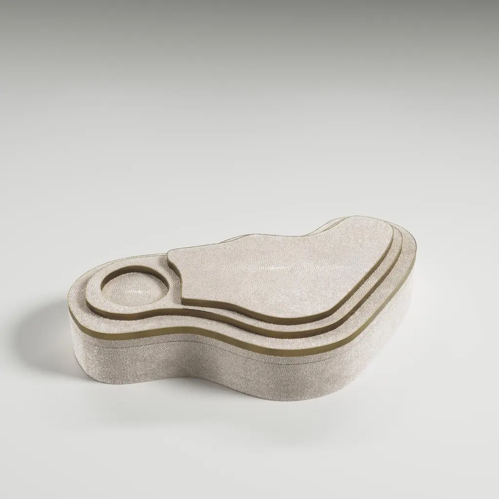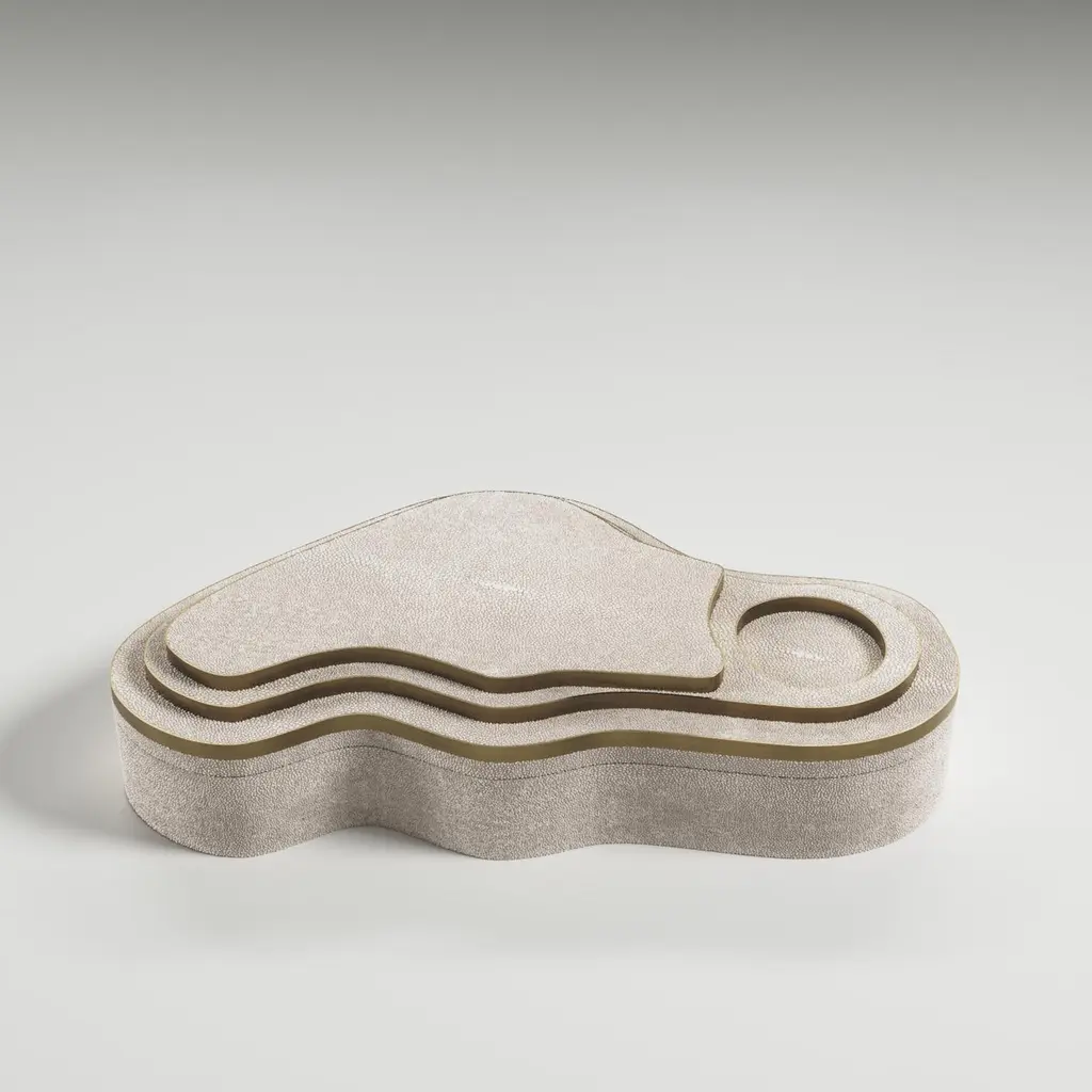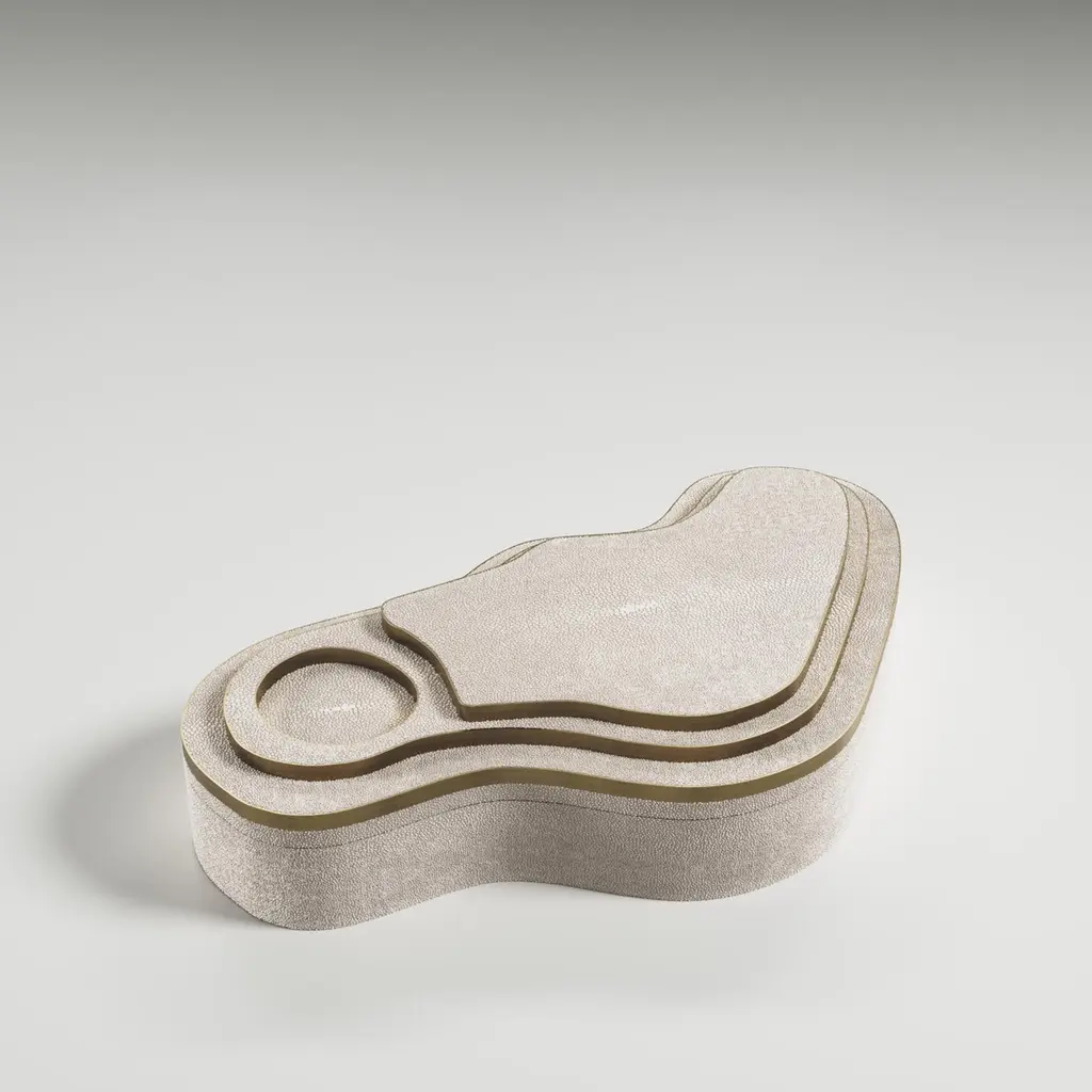 The Paris based label has distinguished themselves since their launch, with their iconic use of shagreen mixed with brass and other exotic materials. All furniture is handcrafted by skilled artisans, ultimately making each piece unique, designed in Paris and produced in the Philippines.The Mask Box with relief by Kifu Paris is a versatile and organic piece. The amorphous top and base are inlaid in a mixture of cream shagreen and bronze-patina brass. This piece is designed by Kifu Augousti the daughter of Ria and Yiouri Augousti. Available in other finishes.All Kifu Paris pieces are handmade by artisans, ultimately making each piece unique.Wipe clean with soft dry cloth.Although inspired by her parents, her collection of Home Accessories and Furniture is a distinct identity of its own. Kifu uses handmade techniques of elaborate inlay patterns of shagreen, shells, semi-precious stones, materials she experienced as a child growing up in her parent’s studio, but interpreted in a younger quirkier way reflecting her youth. From her "jewelry inspired knobs" on decorative boxes, gold bar boxes and an extravagant inlay pattern mix of shagreen and shell inspired by galactic constellations, as seen on her enormous round mirror, is refreshing to see. Kifu embodies whimsical elements throughout her collection and is not afraid to be daring and unexpected in her approach to design.All shagreen-covered items should be kept out of direct sunlight, color variants may occur on the stingray and other exotic finishes, but this showcases the Parisian label's commitment to creating authentic luxurious products using natural components.