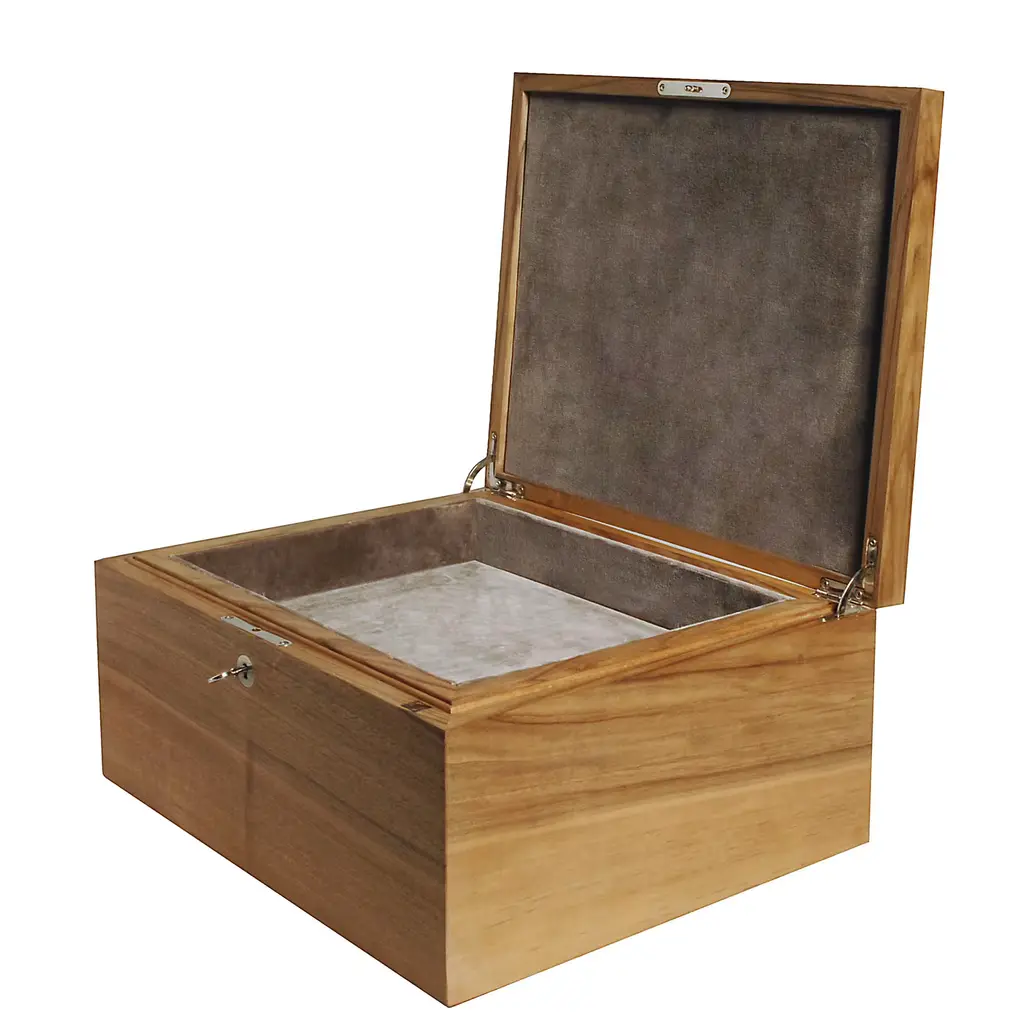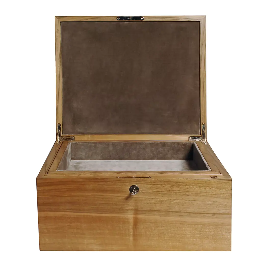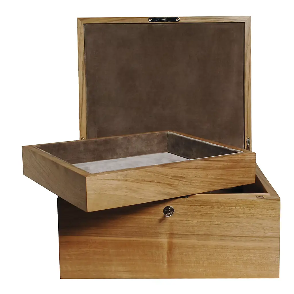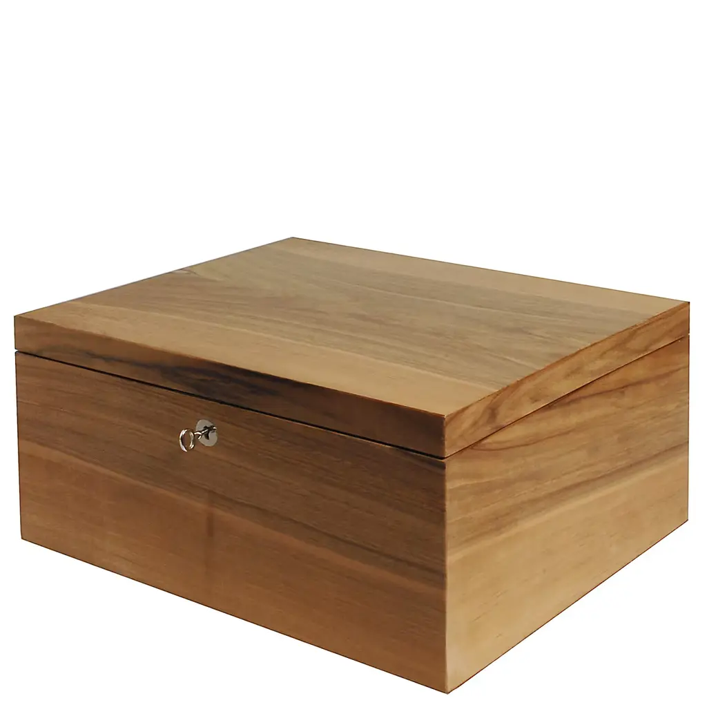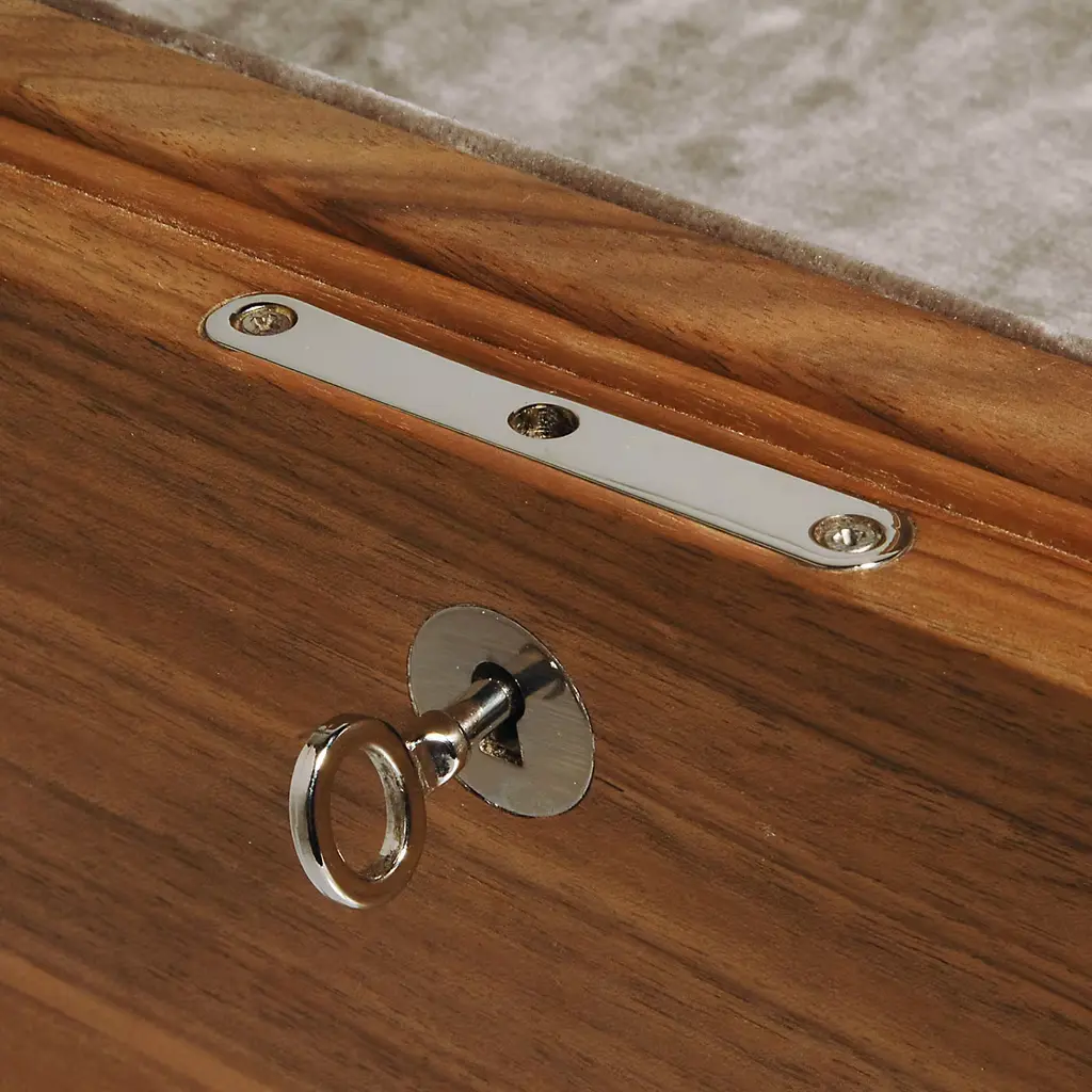 This exquisite box in solid Italian walnut wood features on the inside a brown velvet lining. At the bottom of the box, there is a tray in solid wood lined with black cloth. This box is customizable with the option of different materials, dimensions and inside layout, depending on your needs.