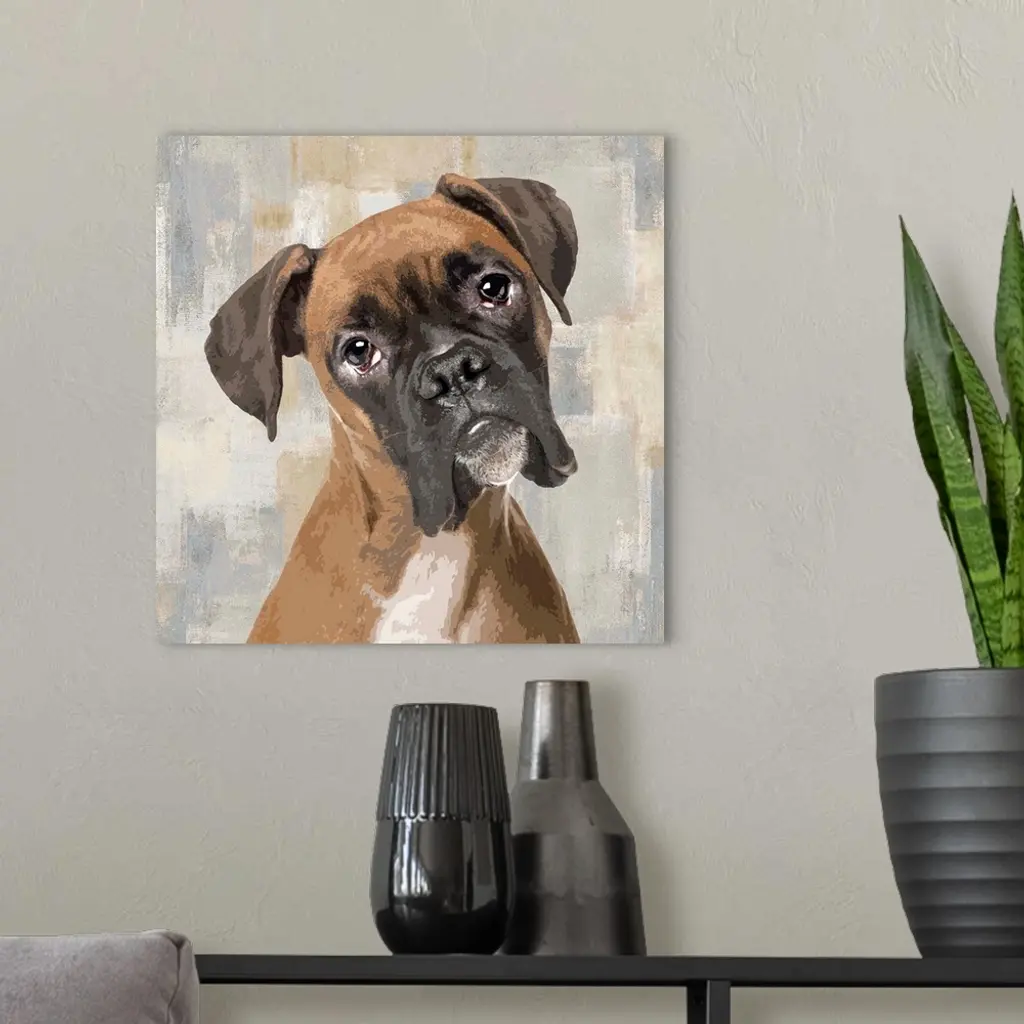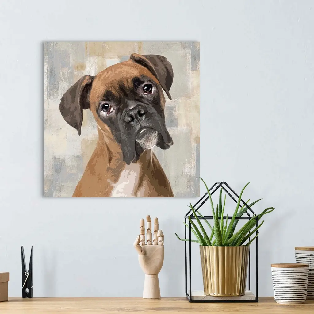 Square decor with a portrait of a Boxer on a layered gray, blue, and tan background.