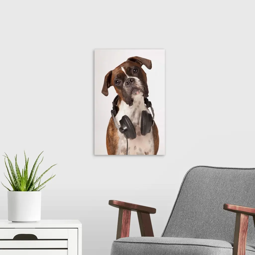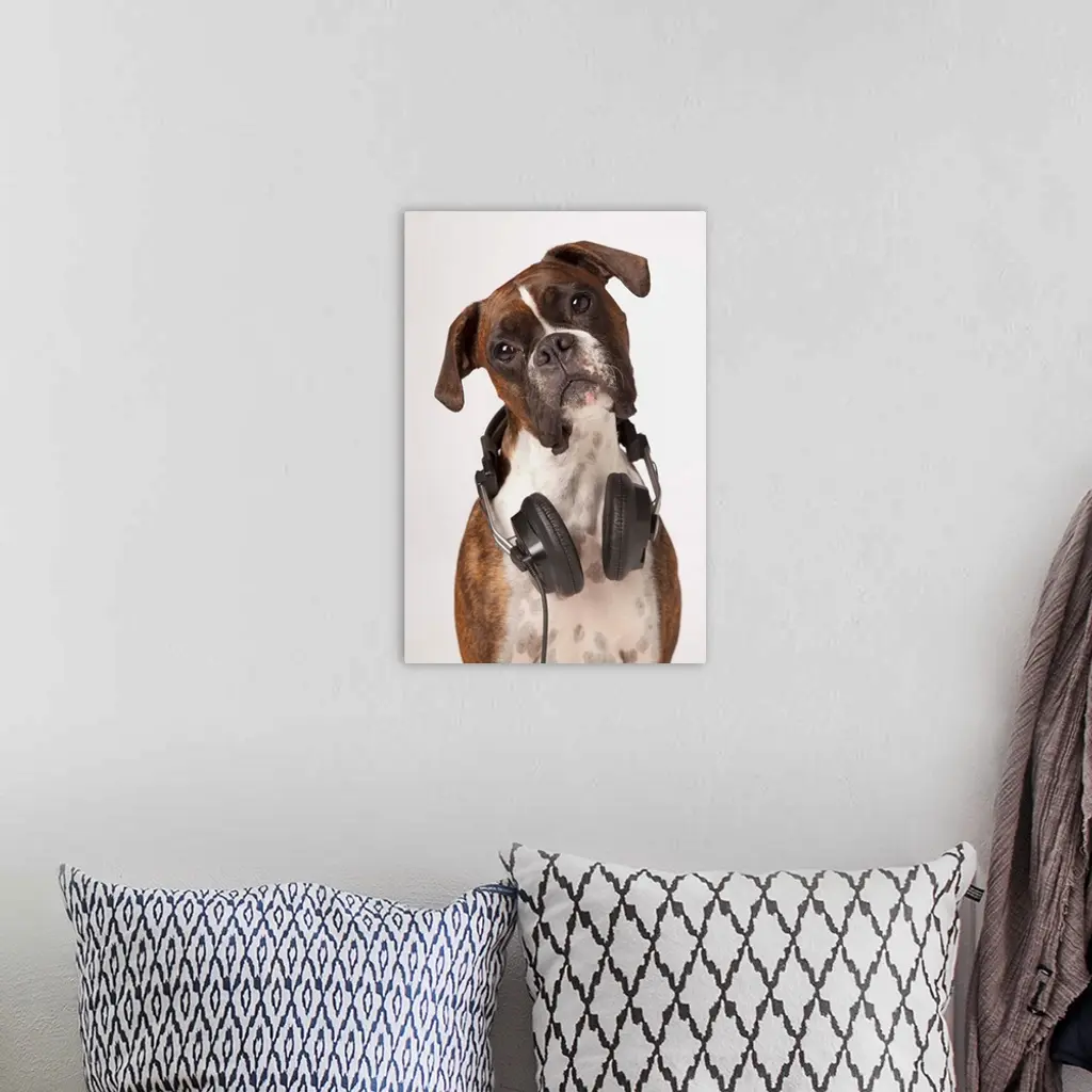 Boxer Dog With Headphones wall art for home and office decor. Discover canvas art prints, photos, mural, big canvas art and framed wall art in GreatBigCanvas.com's varied collections.