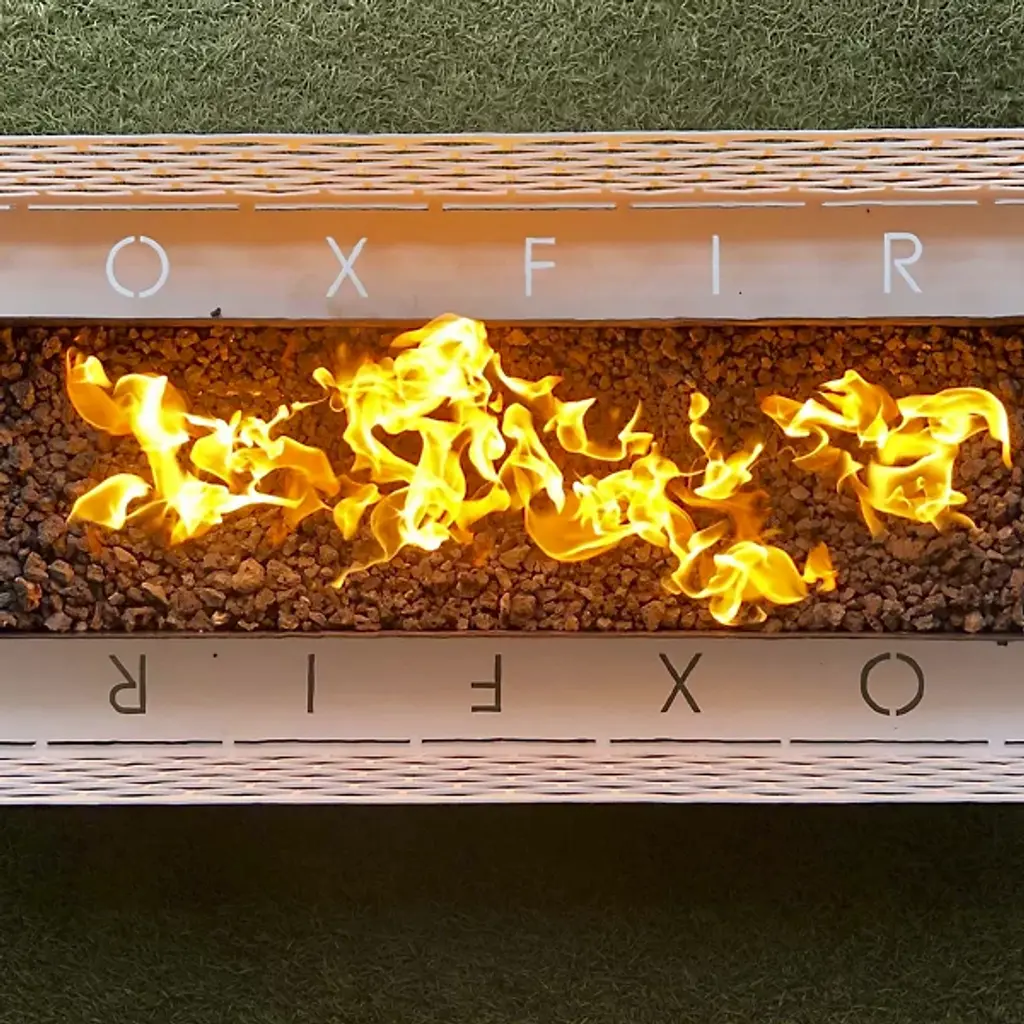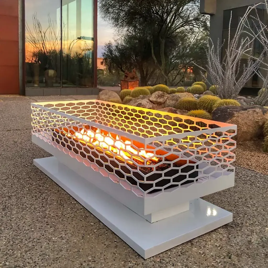 Bring the heat with the Boxfire Outdoor Fire Pit from Modfire. This outdoor fireplace is made of handcrafted, 14 G stainless steel, built to withstand outdoor elements. Boxfire is defined by the streamlined, hexagonal cutouts seen throughout its surface. It Includes a 10ft hose, regulator, and an adjustable needle valve to articulate gas flow. Fueled by propane for an 8-hour burn time, your fireplace works in tandem with fireglass or smooth river rocks, not included.
