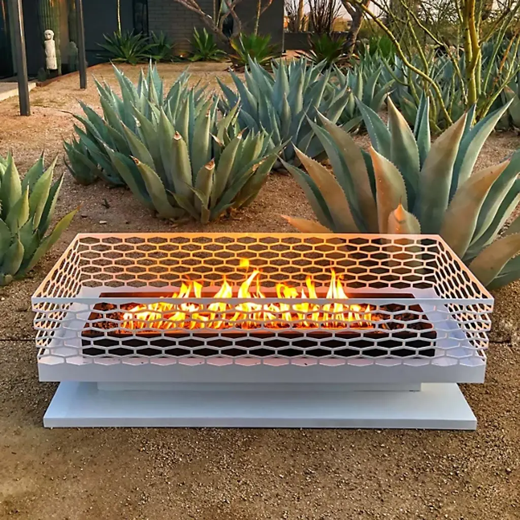 Bring the heat with the Boxfire Outdoor Fire Pit from Modfire. This outdoor fireplace is made of handcrafted, 14 G stainless steel, built to withstand outdoor elements. Boxfire is defined by the streamlined, hexagonal cutouts seen throughout its surface. It Includes a 10ft hose, regulator, and an adjustable needle valve to articulate gas flow. Fueled by propane for an 8-hour burn time, your fireplace works in tandem with fireglass or smooth river rocks, not included.