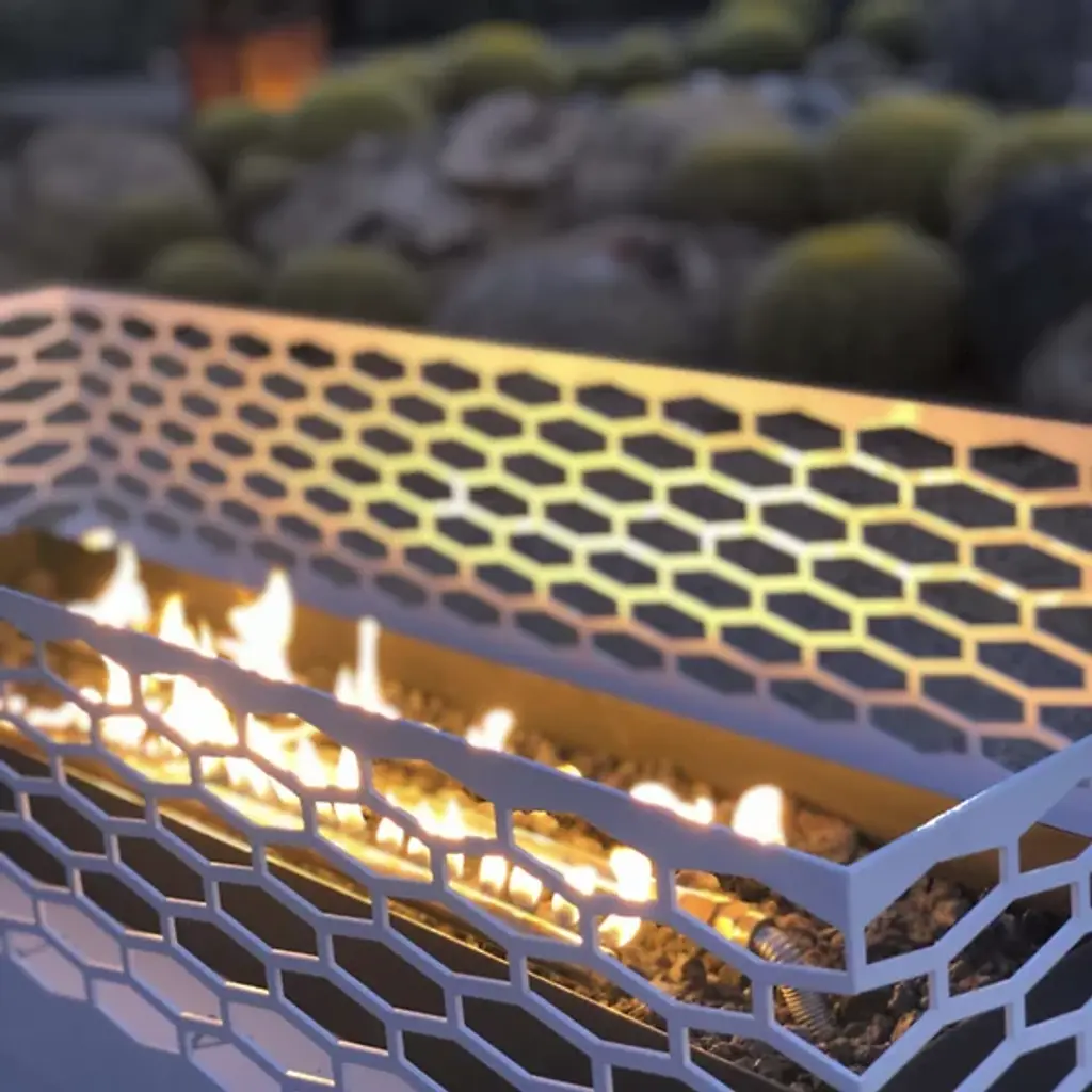 Bring the heat with the Boxfire Outdoor Fire Pit from Modfire. This outdoor fireplace is made of handcrafted, 14 G stainless steel, built to withstand outdoor elements. Boxfire is defined by the streamlined, hexagonal cutouts seen throughout its surface. It Includes a 10ft hose, regulator, and an adjustable needle valve to articulate gas flow. Fueled by propane for an 8-hour burn time, your fireplace works in tandem with fireglass or smooth river rocks, not included.