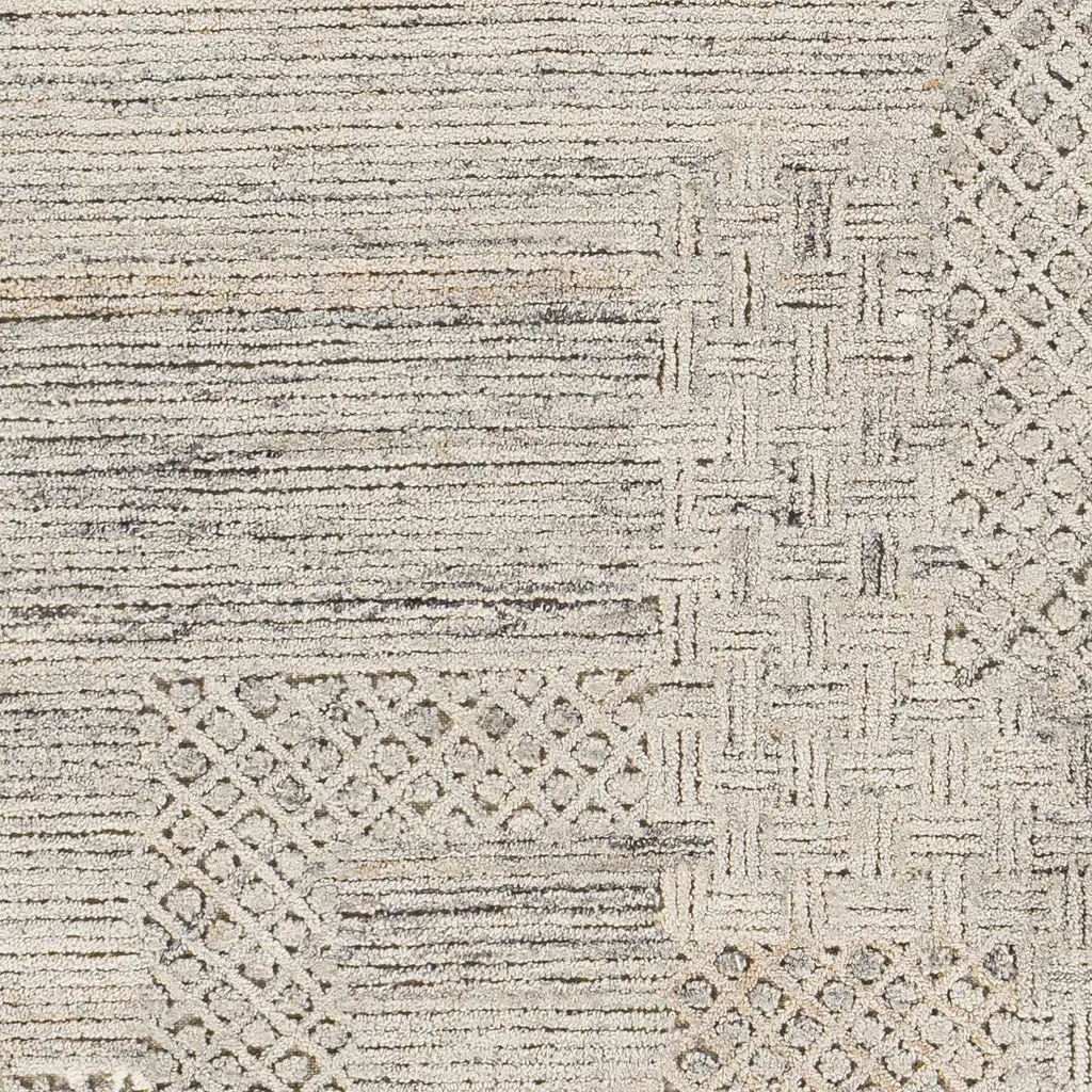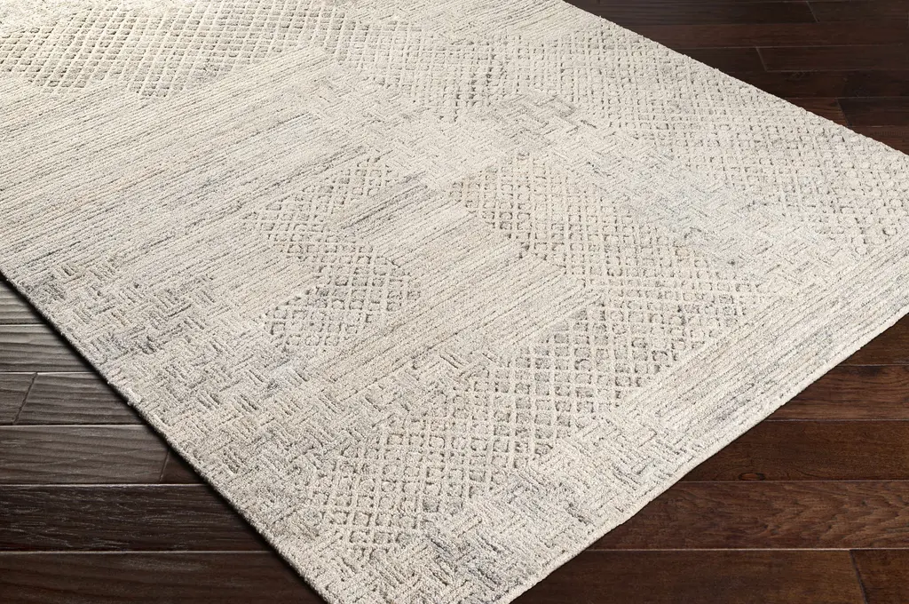 Collection: Boxholm Colors: Charcoal, Medium Gray, Peach Construction: Hand Tufted Material: 80% Polyester, 20% Wool Pile: Low Pile Pile Height: 0.2" Styles: Transitional,Bohemian Backing: Canvas Made In: India Thickness: 0.39" Price Range: $$$$$ (Most Affordable)