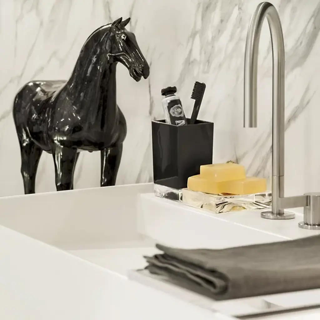 The Boxy Soap Holder from Kartell brings practical organization to bathroom spaces with understated precision. This thermoplastic technopolymer accessory is part of a comprehensive bathroom collection designed by Ludovica and Roberto Palomba. Its simple geometry provides the ideal resting place for soap bars, preventing messy residue on countertops and extending the life of your soap. The holder coordinates with matching toothbrush holders and other accessories in the Boxy line, allowing for a cohesive bathroom arrangement without unnecessary embellishment.